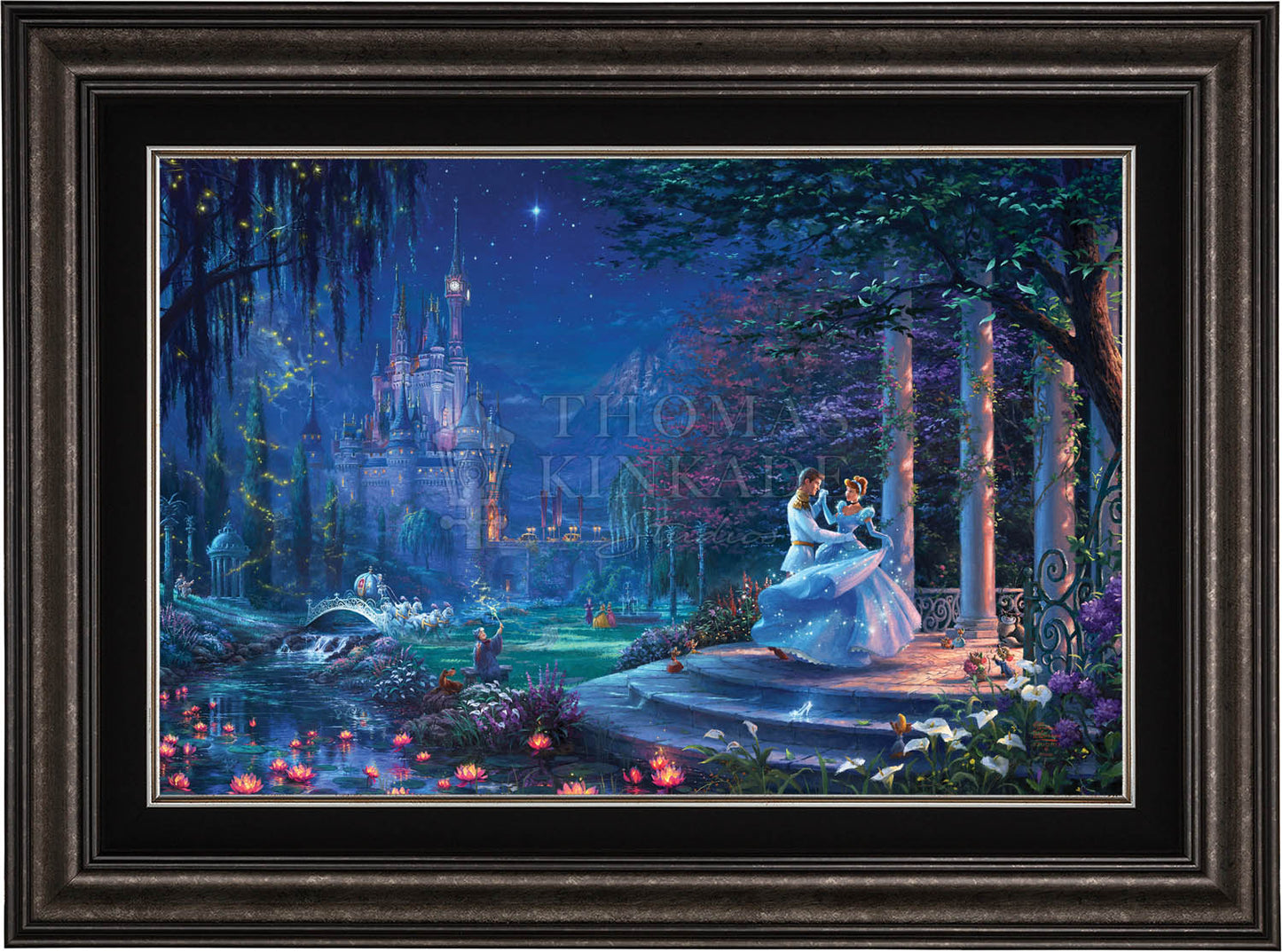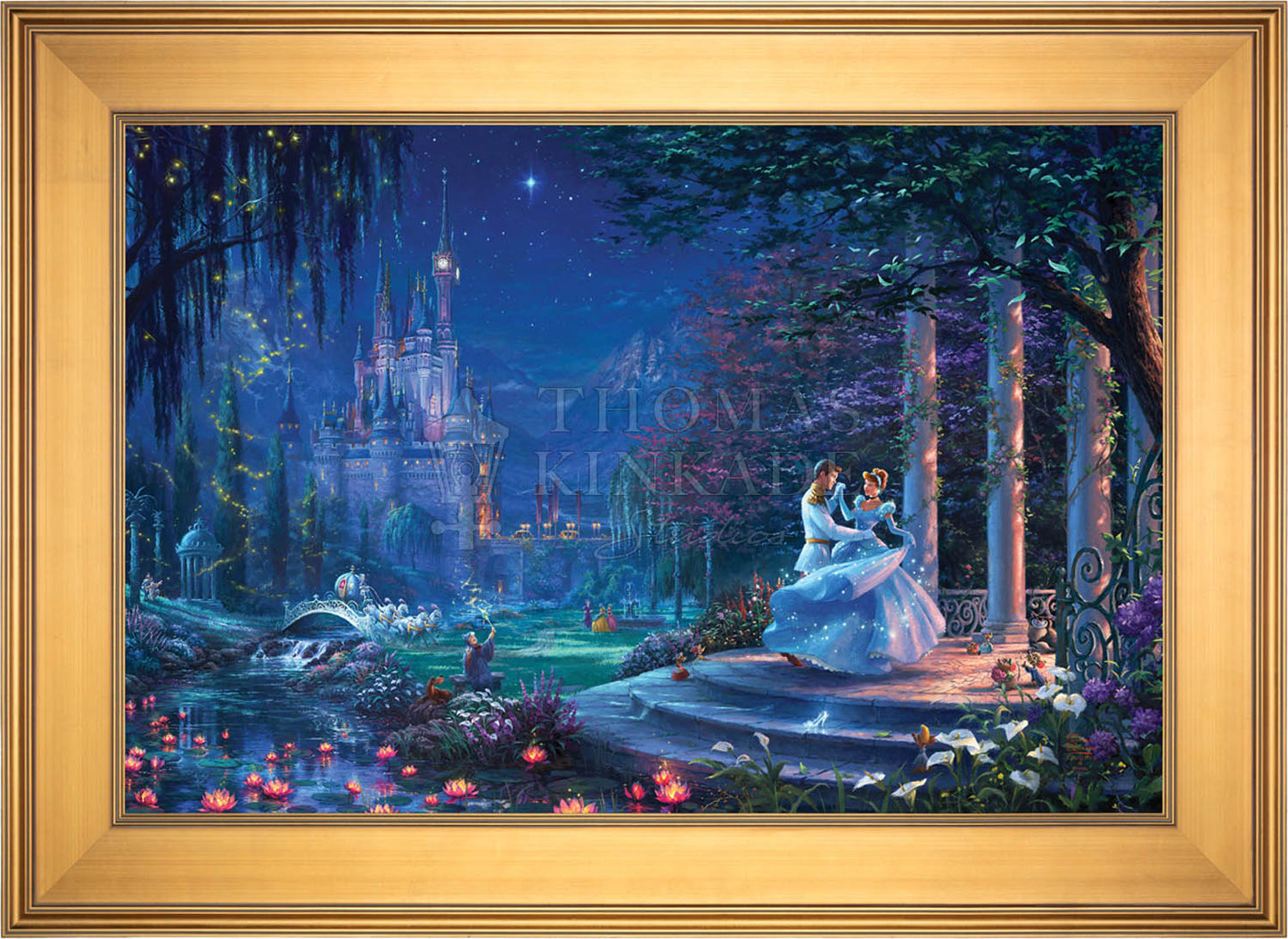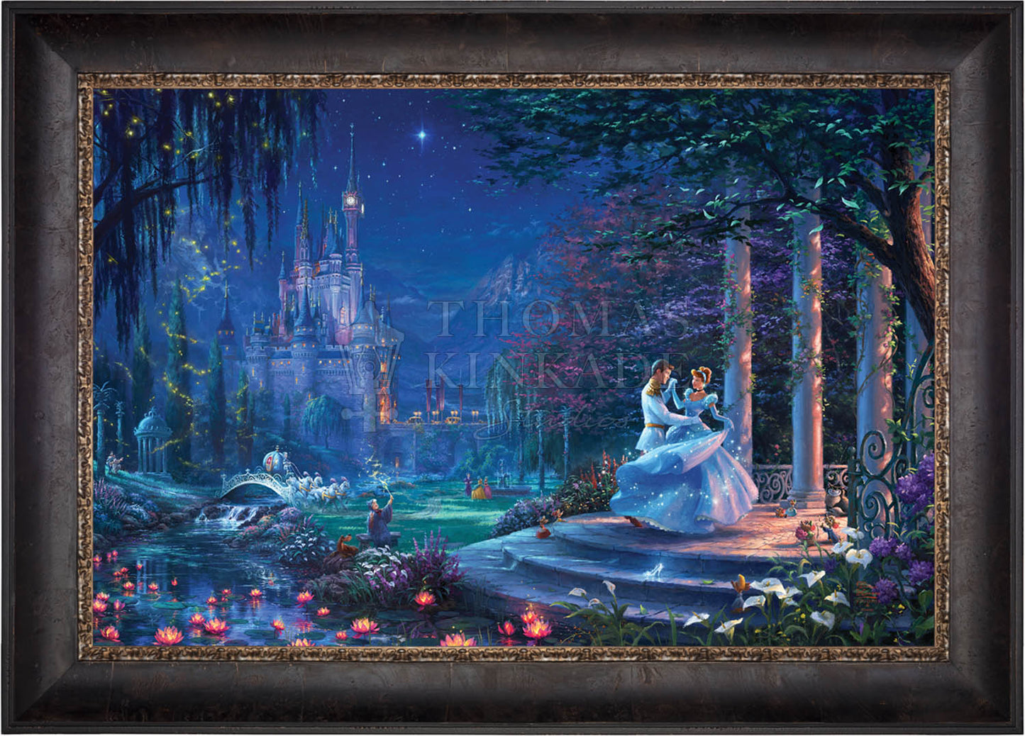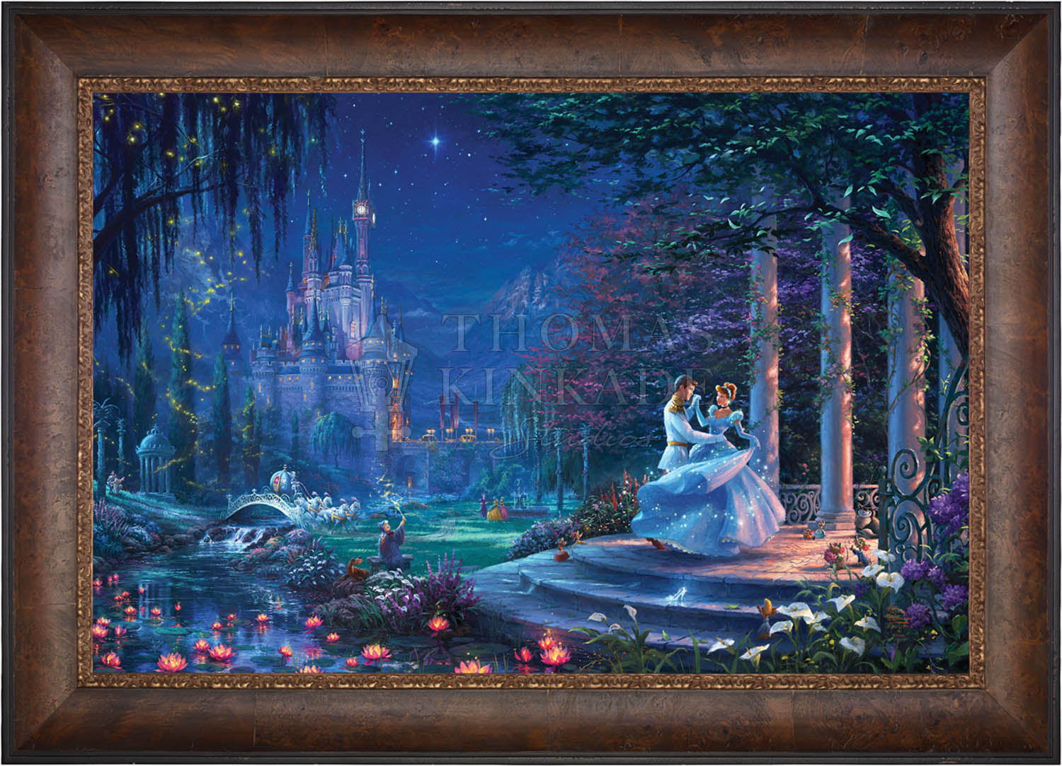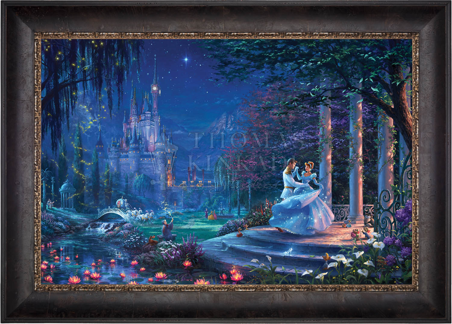 When Disney released the film Cinderella in 1950, instantly it became the new gold standard for music, animation, and visual storytelling. The American Film Institute immediately considered it one of the best American animated films ever made. Now this wonderful story of love, loss, struggle, and ‘happily ever after’ has been recreated in this vividly colorful painting like never before by Thomas Kinkade Studios in Disney Cinderella Dancing in the Starlight , the second piece of the collection entitled, Dancing in the Light. When the clocktower strikes midnight, Cinderella’s magical night with Prince Charming, along with her dreams of a better life, seem to be coming to an end…or maybe, it’s just the beginning.