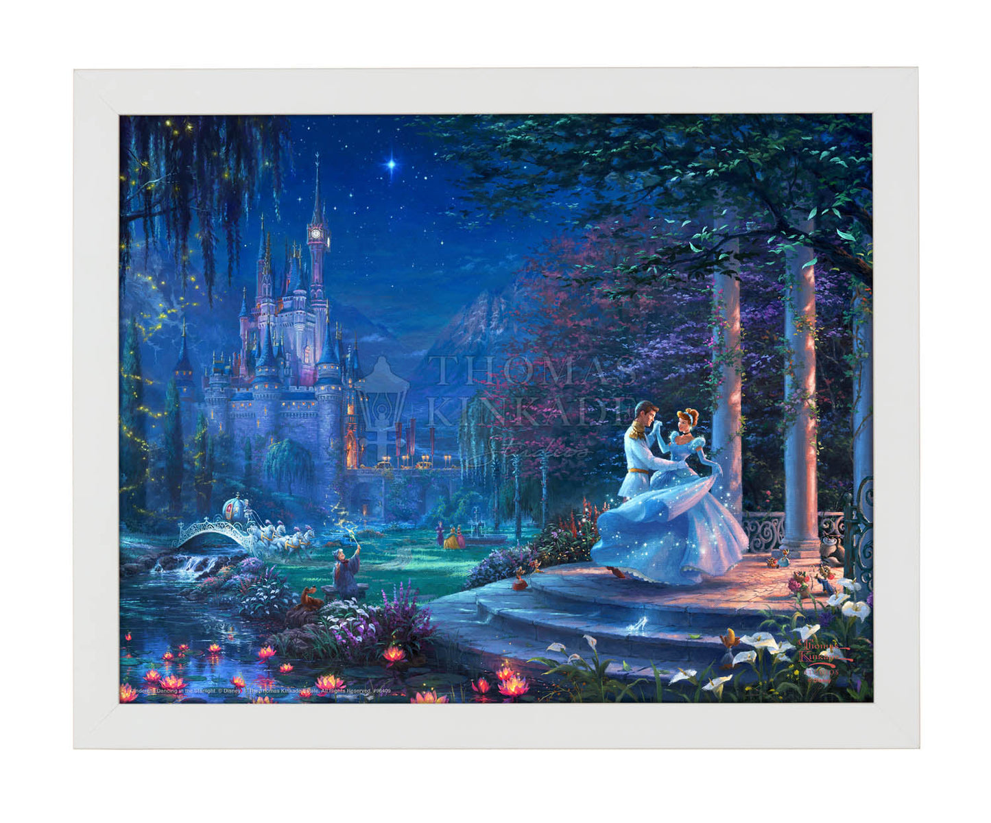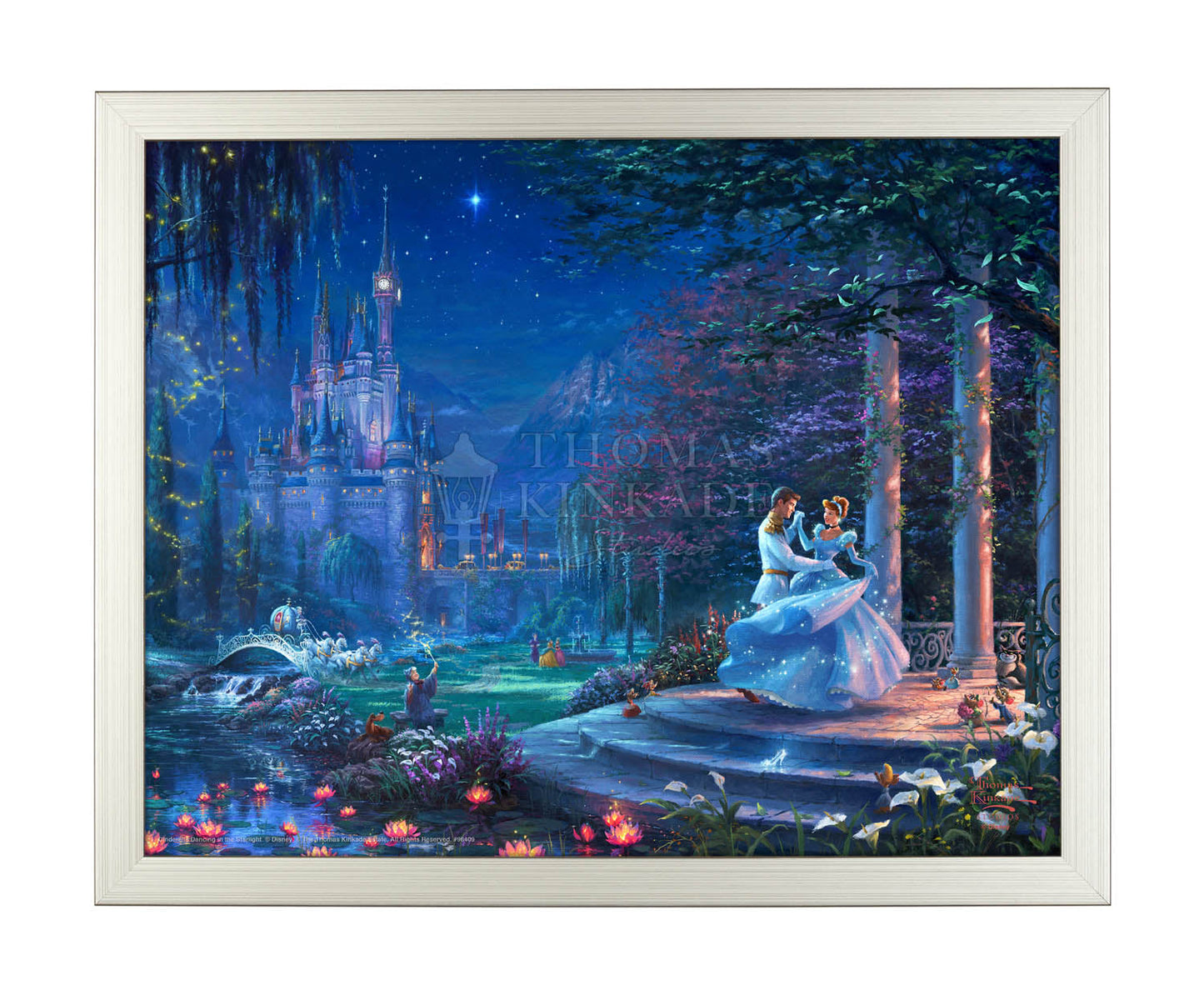 Now this wonderful story of love, loss, struggle, and ‘happily ever after’ has been recreated in this vividly colorful painting like never before by Thomas Kinkade Studios in Disney Cinderella Dancing in the Starlight, the second piece of the collection entitled, Dancing in the Light.