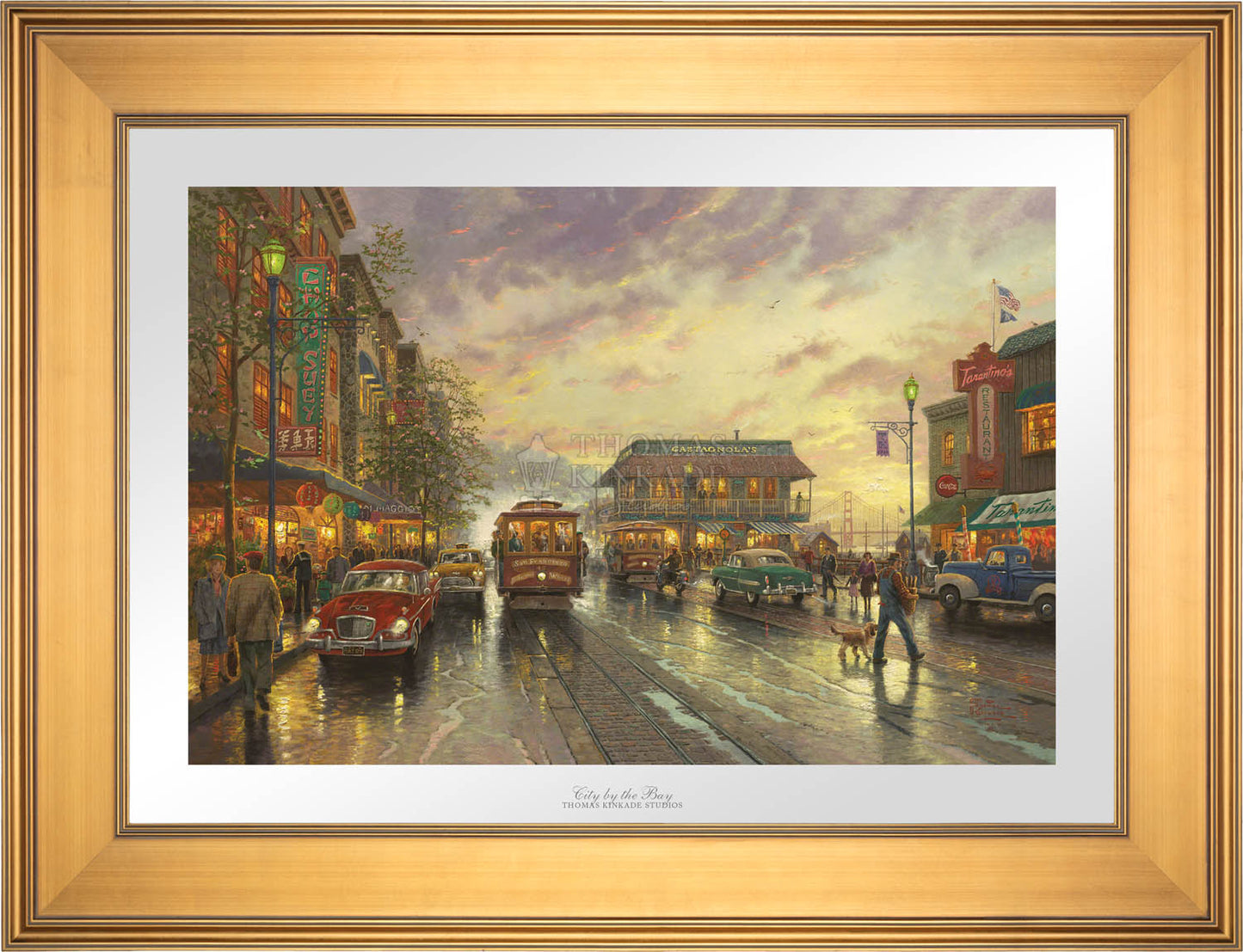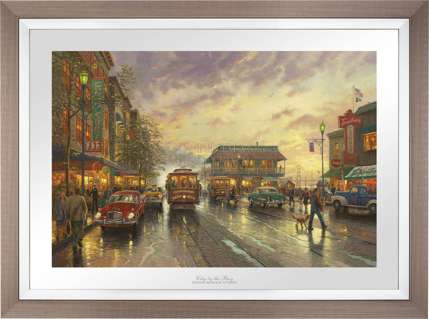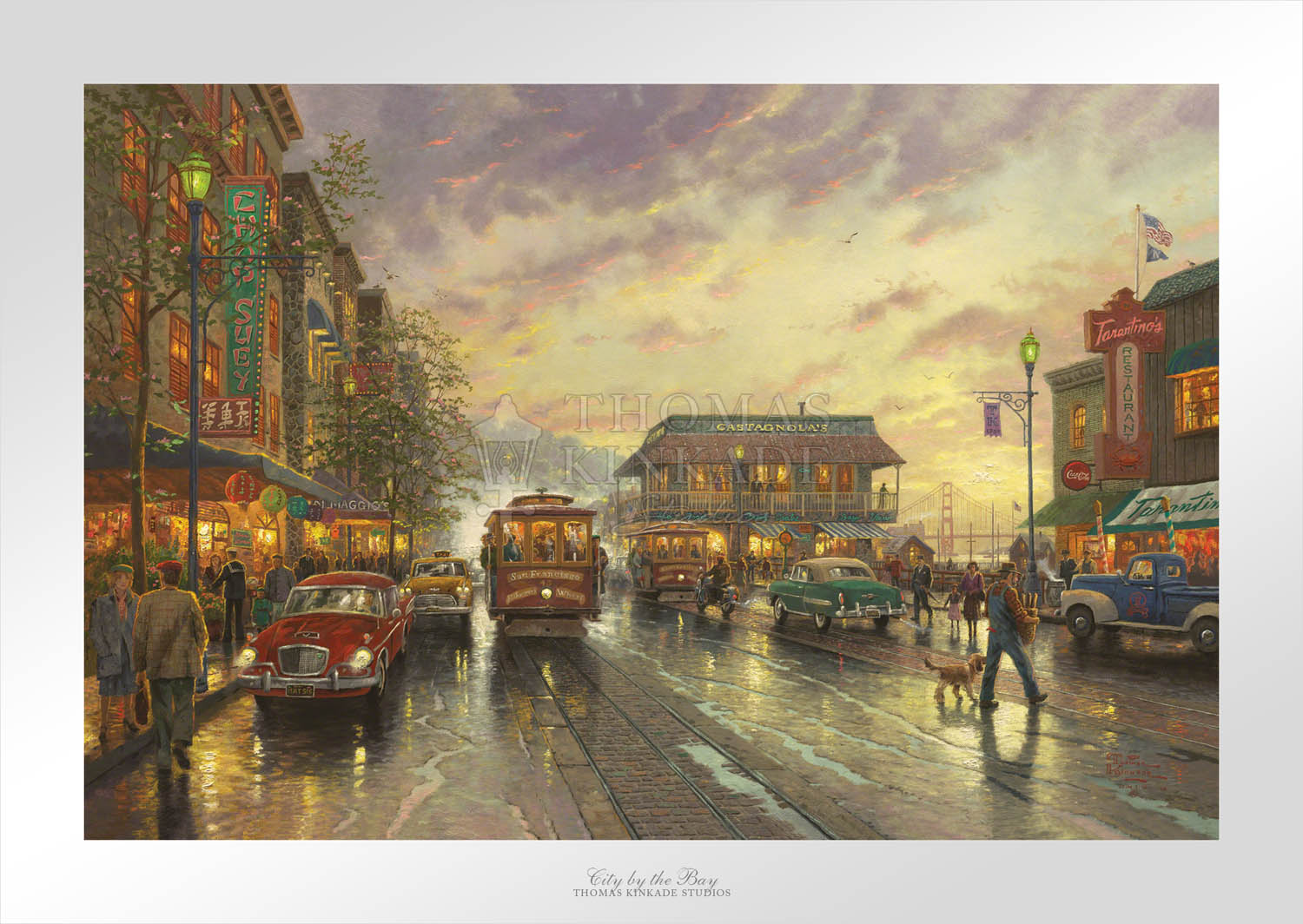 Aficionados of San Francisco will note my many romantic touches: replacing the contemporary wharf electric trolleys with the more colorful and nostalgic cable cars, clearing away some of the fisherman's shacks along Scoma's pier to allow a less interrupted view of the famous Golden Gate, dressing the scene with an uninterrupted flow of vintage vehicles. On the top floor of famous Castagnola's restaurant, I even included a depiction of myself as a little boy looking out in awe at the distant bay as a fog shrouded ship departs for points unknown. Perhaps the romance of the City by the Bay, at least for me, began in childhood with such whimsical daydreams.