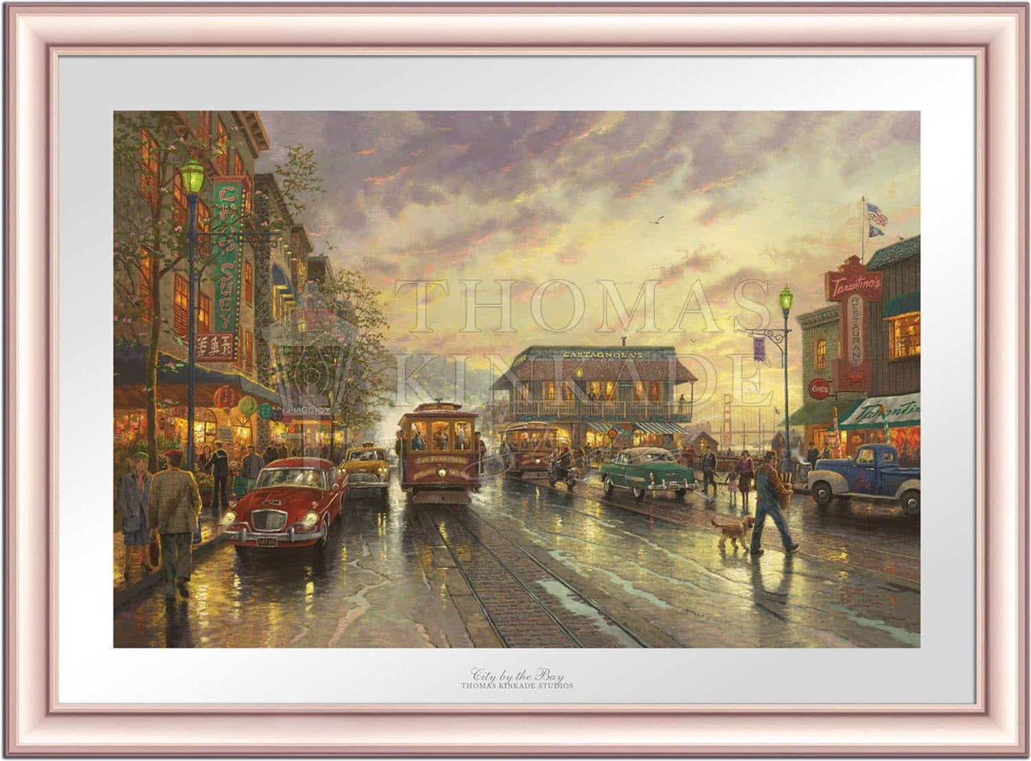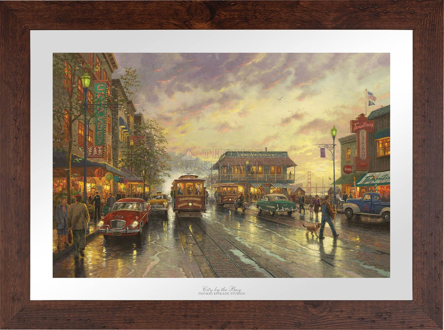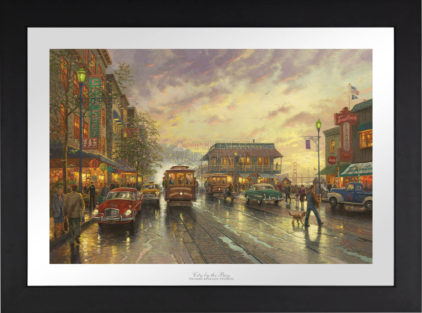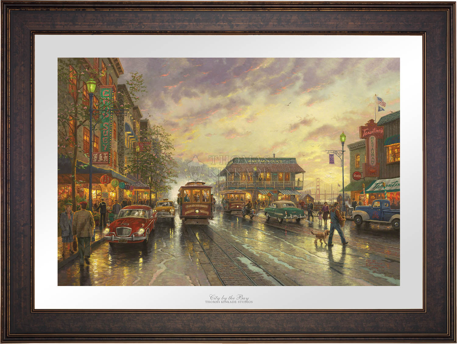 Aficionados of San Francisco will note my many romantic touches: replacing the contemporary wharf electric trolleys with the more colorful and nostalgic cable cars, clearing away some of the fisherman's shacks along Scoma's pier to allow a less interrupted view of the famous Golden Gate, dressing the scene with an uninterrupted flow of vintage vehicles. On the top floor of famous Castagnola's restaurant, I even included a depiction of myself as a little boy looking out in awe at the distant bay as a fog shrouded ship departs for points unknown. Perhaps the romance of the City by the Bay, at least for me, began in childhood with such whimsical daydreams.