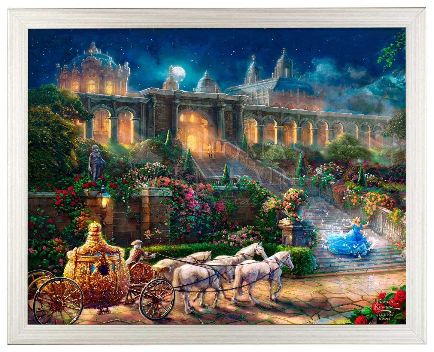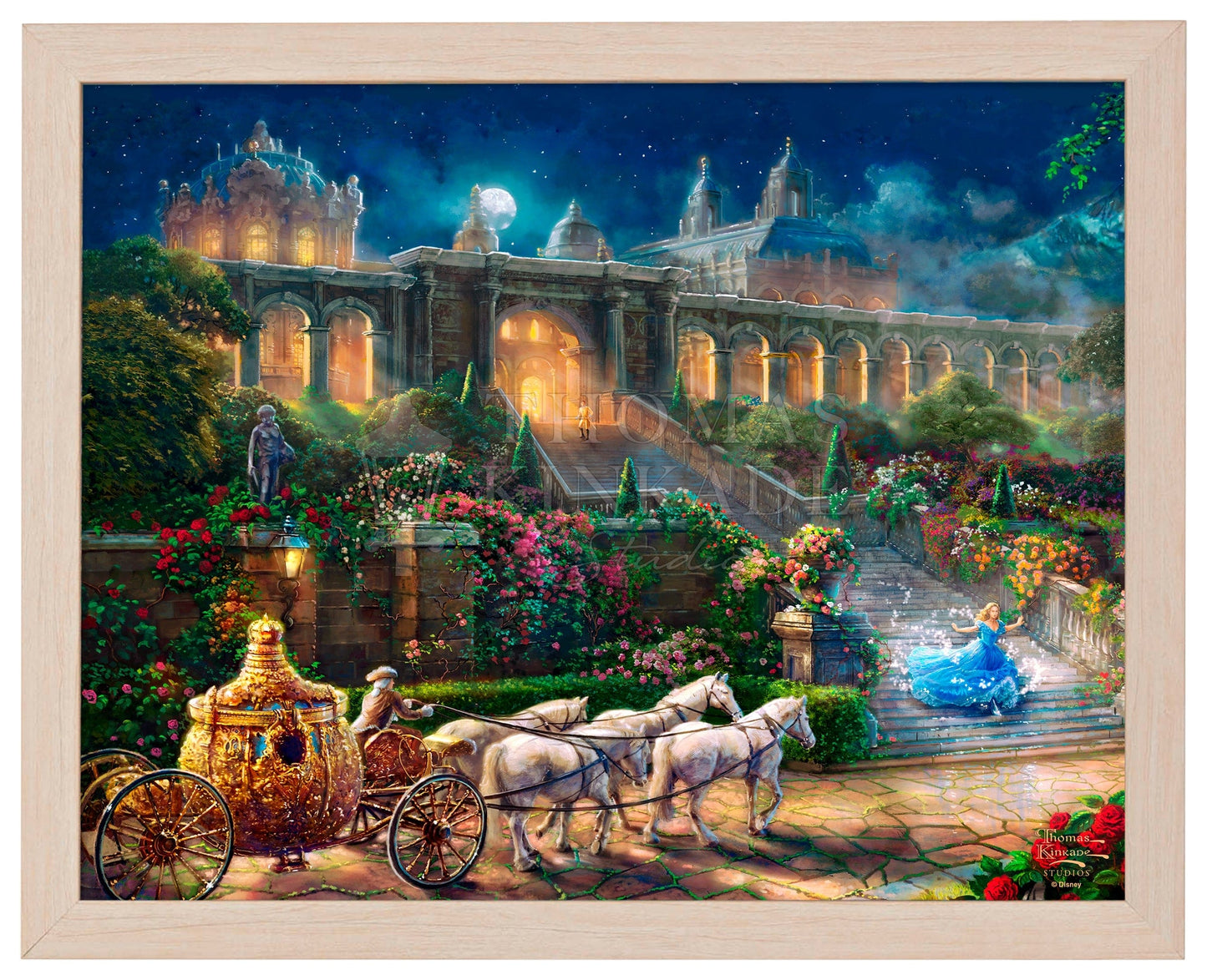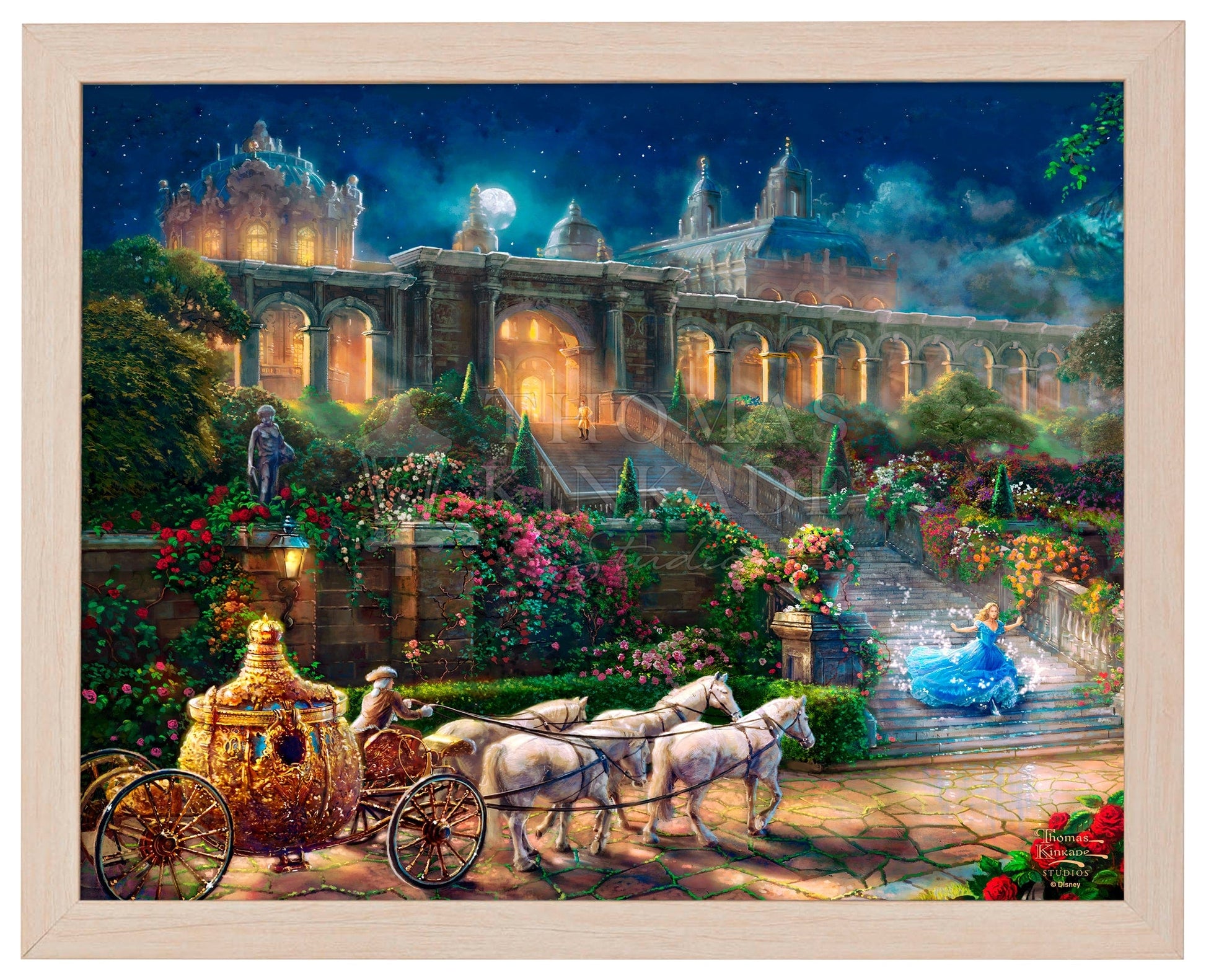 The story of Cinderella is a timeless and universal tale of romance and self-discovery. It explores the importance of inner beauty in the assessment of personal worth and proclaims the power of true love to overcome all obstacles no matter how large and daunting they may seem. The folklore of the hidden princess magically discovered by her true prince has been told for hundreds of years in countries throughout the world as geographically and culturally diverse as Malaysia and Germany. The beauty of the fable and the importance of its message have also made it a constant in the list of favorite stories told and enjoyed by those spinning yarns in our own country. To be sure, Thom loved the original Cinderella as much as any and would speak of it fondly when reminiscing of story-times spent with his own beautiful daughters. Their laughter and delight at his telling would shine in his own eyes as he reveled in their obvious enchantment.We at the Thomas Kinkade Studios are excited to continue in this storytelling tradition, bringing to life the latest Disney retelling of this classic story in the form of four paintings; each capturing in oil the joy of first love, the wonderment of fairy magic and the excitement of romantic adventure. Whether you are enjoying the encounter with the dashing stranger in the woods, the depiction of Cinderella's enchanted transformation, her flight from discovery at the King's ball or her time in love with the prince of her dreams, all of these masterworks in color and light will dazzle your eye and speak to your heart. It is our hope that this latest interpretation of Cinderella be a gift not only to all "princesses" but also to all those who love them.
