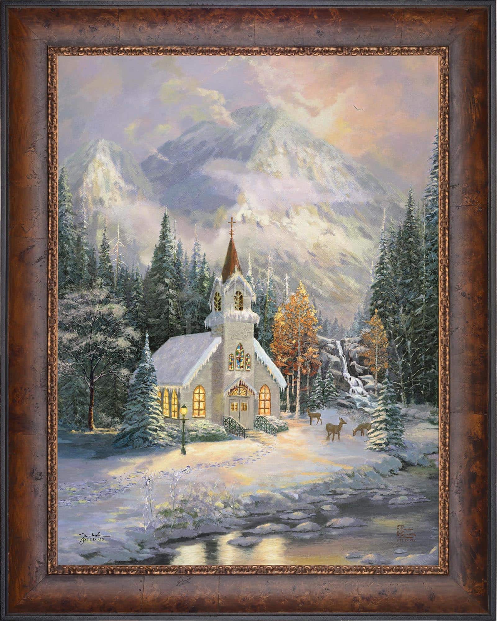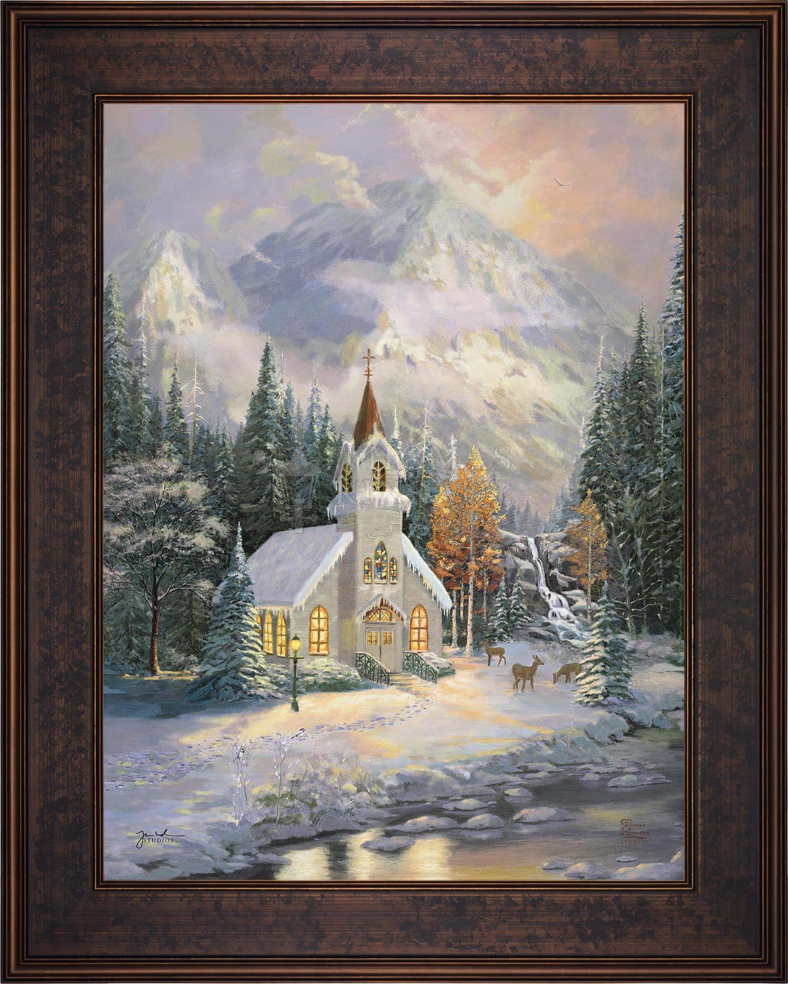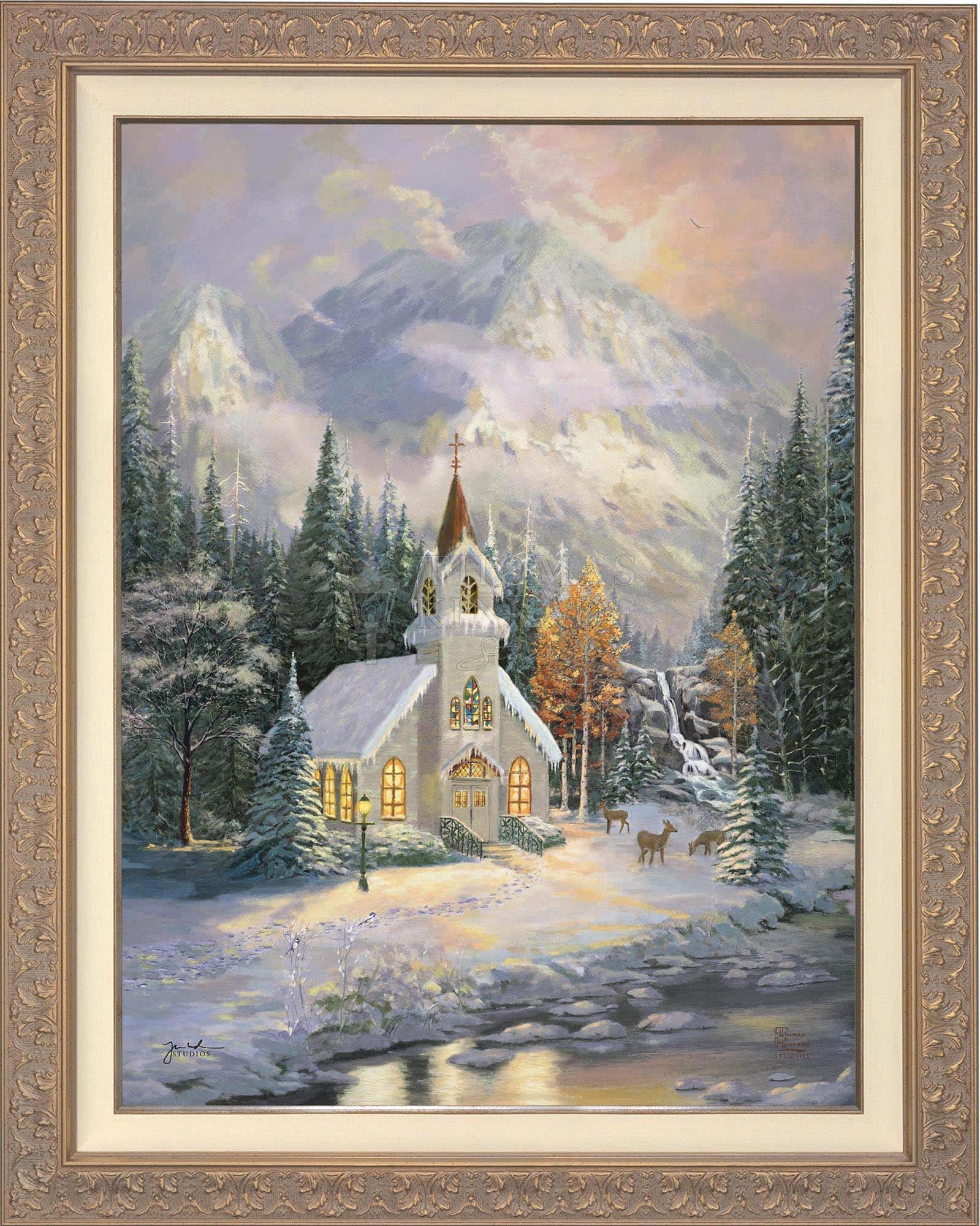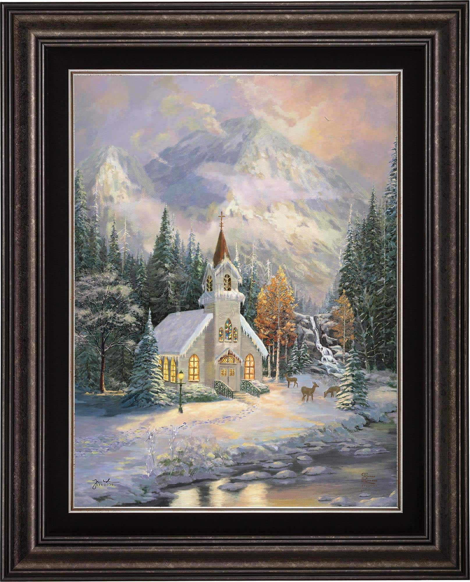 Thomas Kinkade would often ponder what one may find around the corner of any path in his paintings. In commemoration of the 25th Anniversary of the release of Thom’s best-selling painting, Deer Creek Cottage, Thomas Kinkade Studios has created Deer Creek Chapel, an interpretation of what may lie around the corner from Thom’s well-loved winter cottage. Nestled beneath the mountains, highlighted by the rising sun, Deer Creek Chapel is visited by a family of deer reminiscent of Deer Creek Cottage. The morning sunlight glistens off the freshly fallen snow. A delicate fawn peers at the lights glowing from the chapel windows. Deer Creek Chapel captures the beauty of Nature and celebrates the wonder of God’s creations.