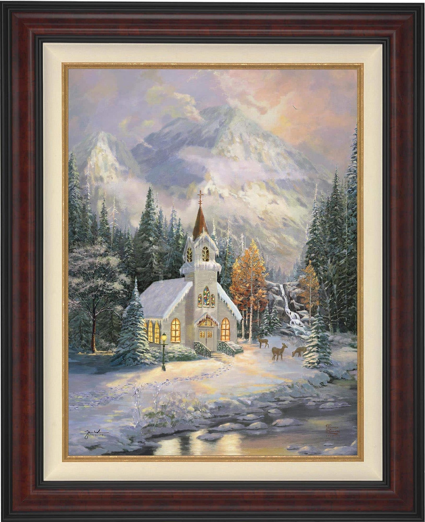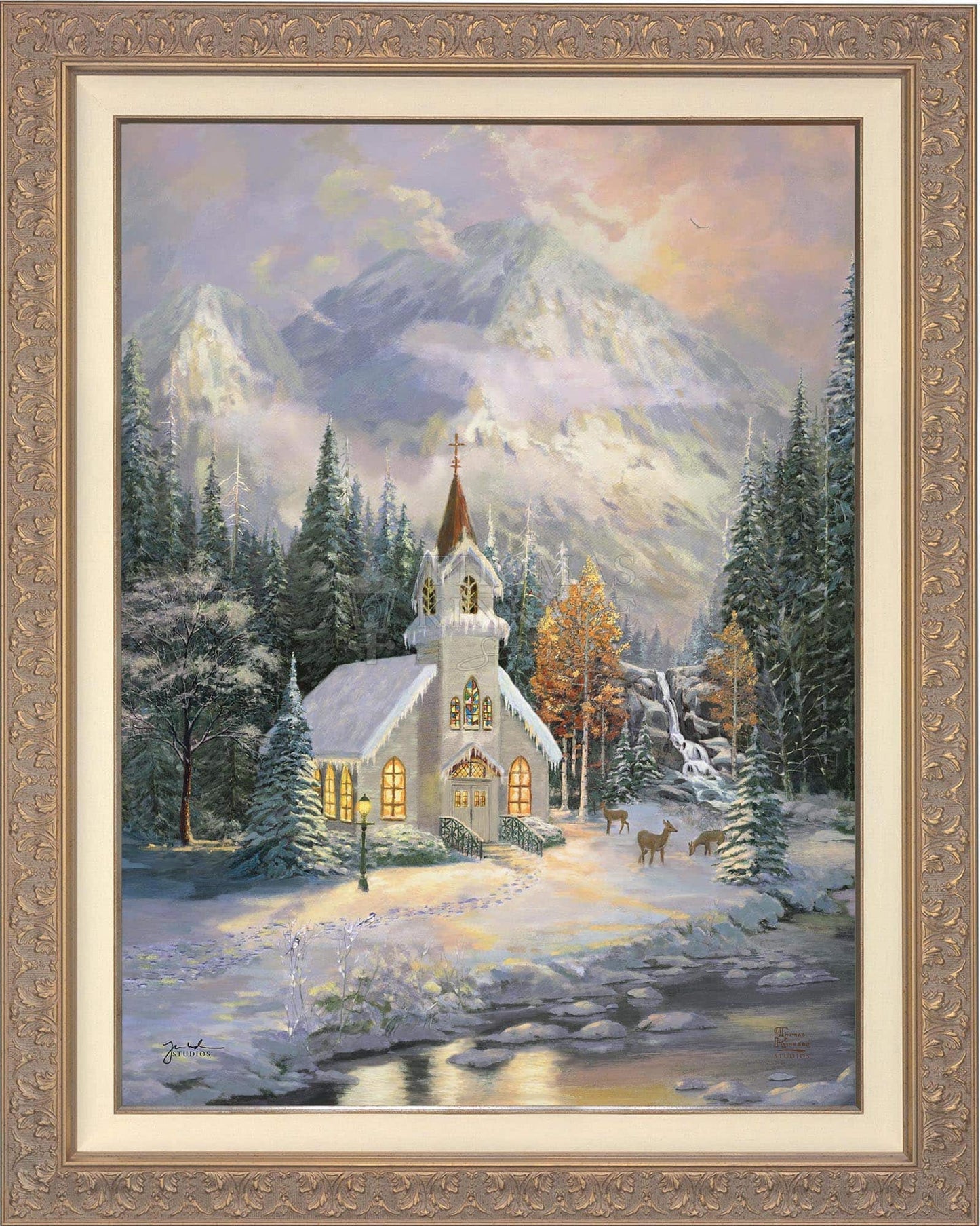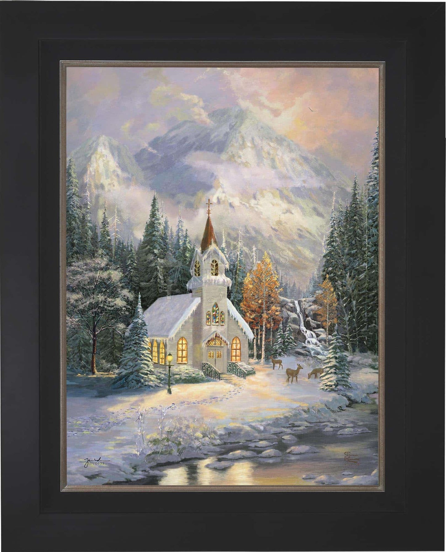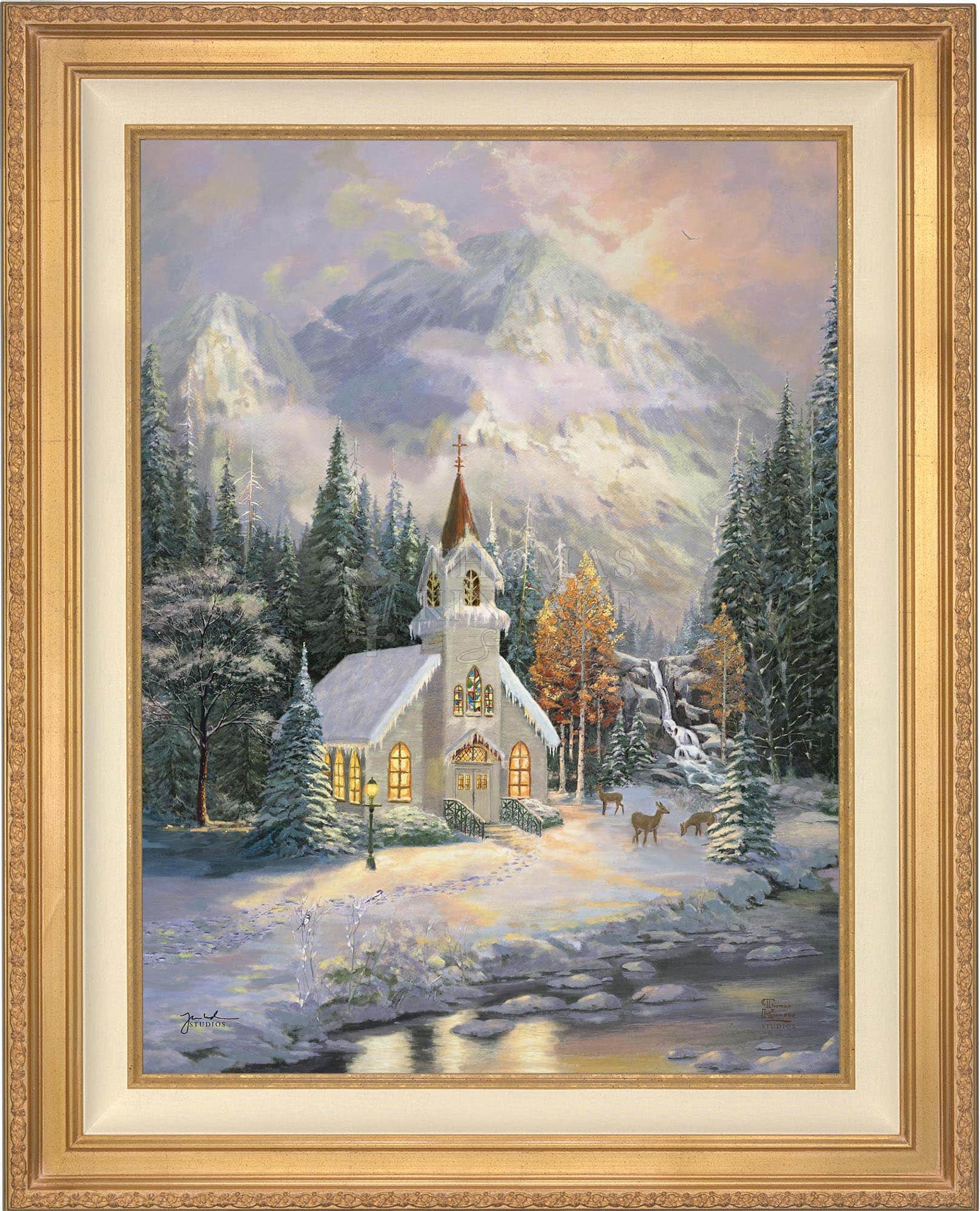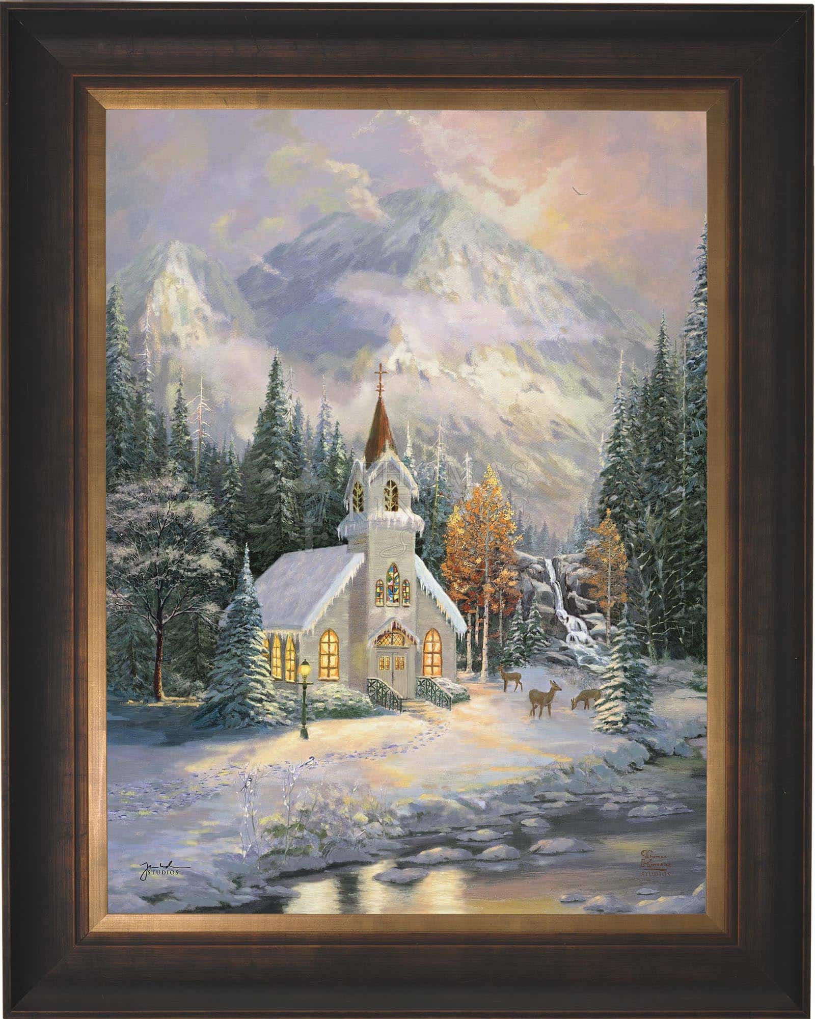 Thomas Kinkade would often ponder what one may find around the corner of any path in his paintings. In commemoration of the 25th Anniversary of the release of Thom’s best-selling painting, Deer Creek Cottage, Thomas Kinkade Studios has created Deer Creek Chapel, an interpretation of what may lie around the corner from Thom’s well-loved winter cottage. Nestled beneath the mountains, highlighted by the rising sun, Deer Creek Chapel is visited by a family of deer reminiscent of Deer Creek Cottage. The morning sunlight glistens off the freshly fallen snow. A delicate fawn peers at the lights glowing from the chapel windows. Deer Creek Chapel captures the beauty of Nature and celebrates the wonder of God’s creations.