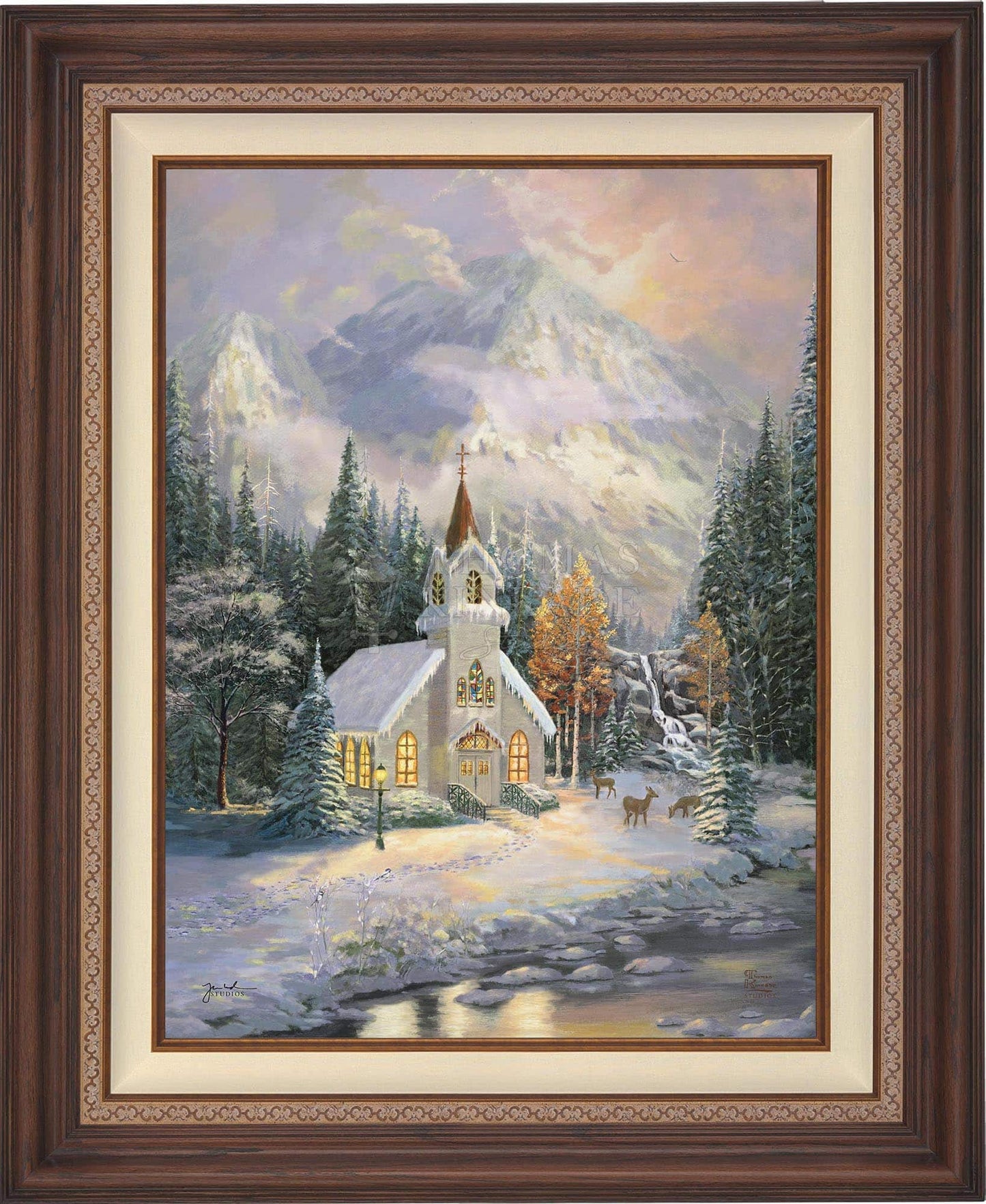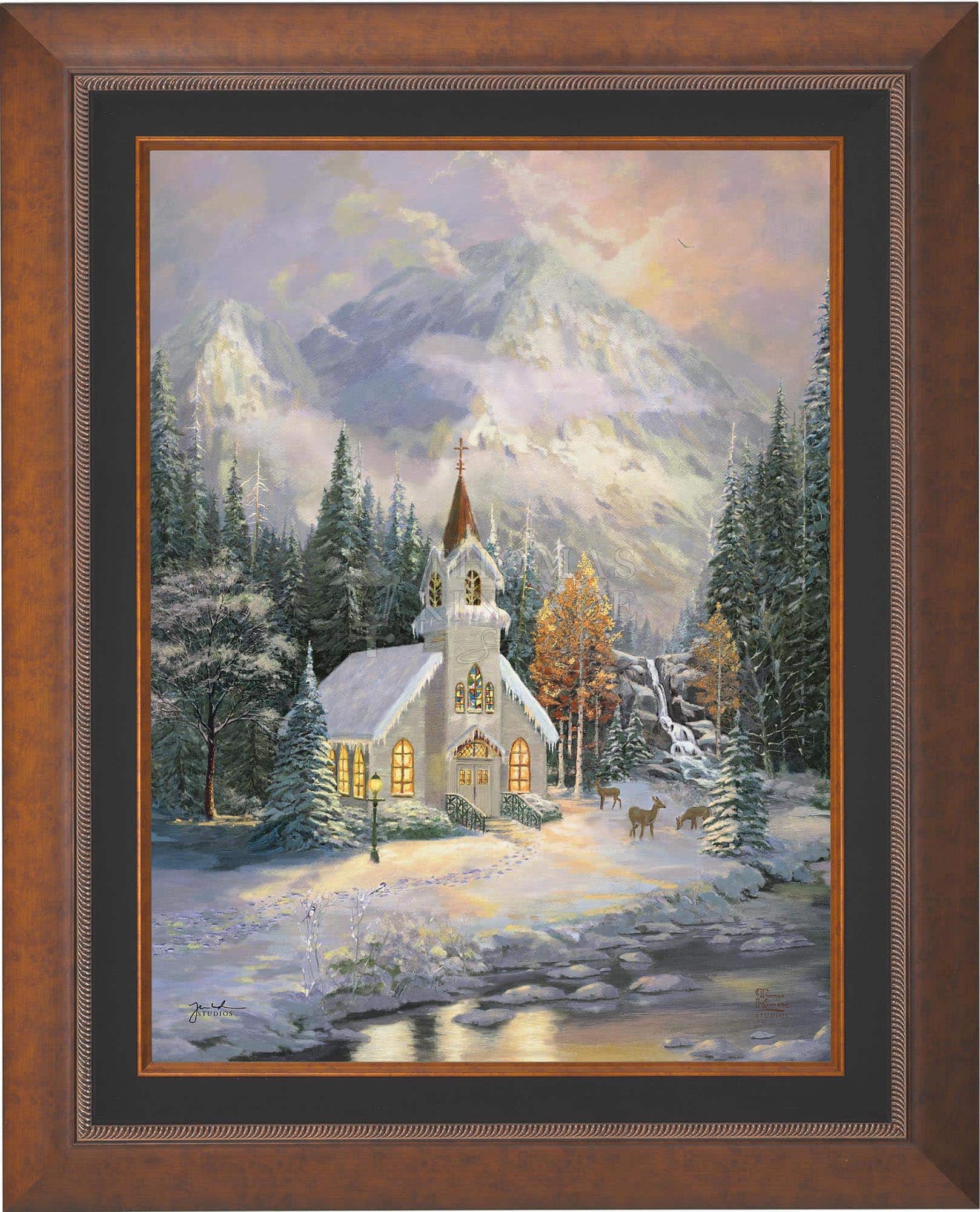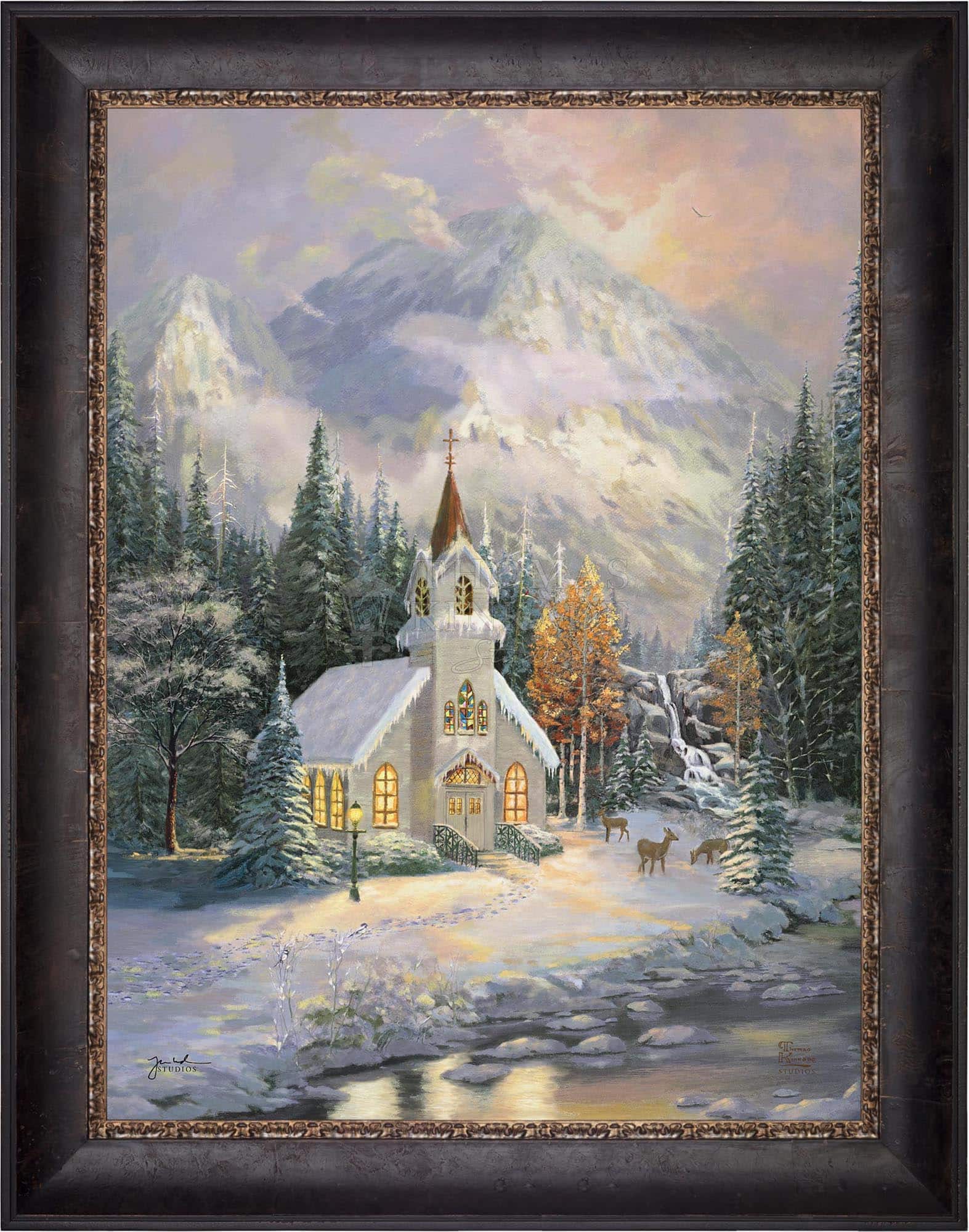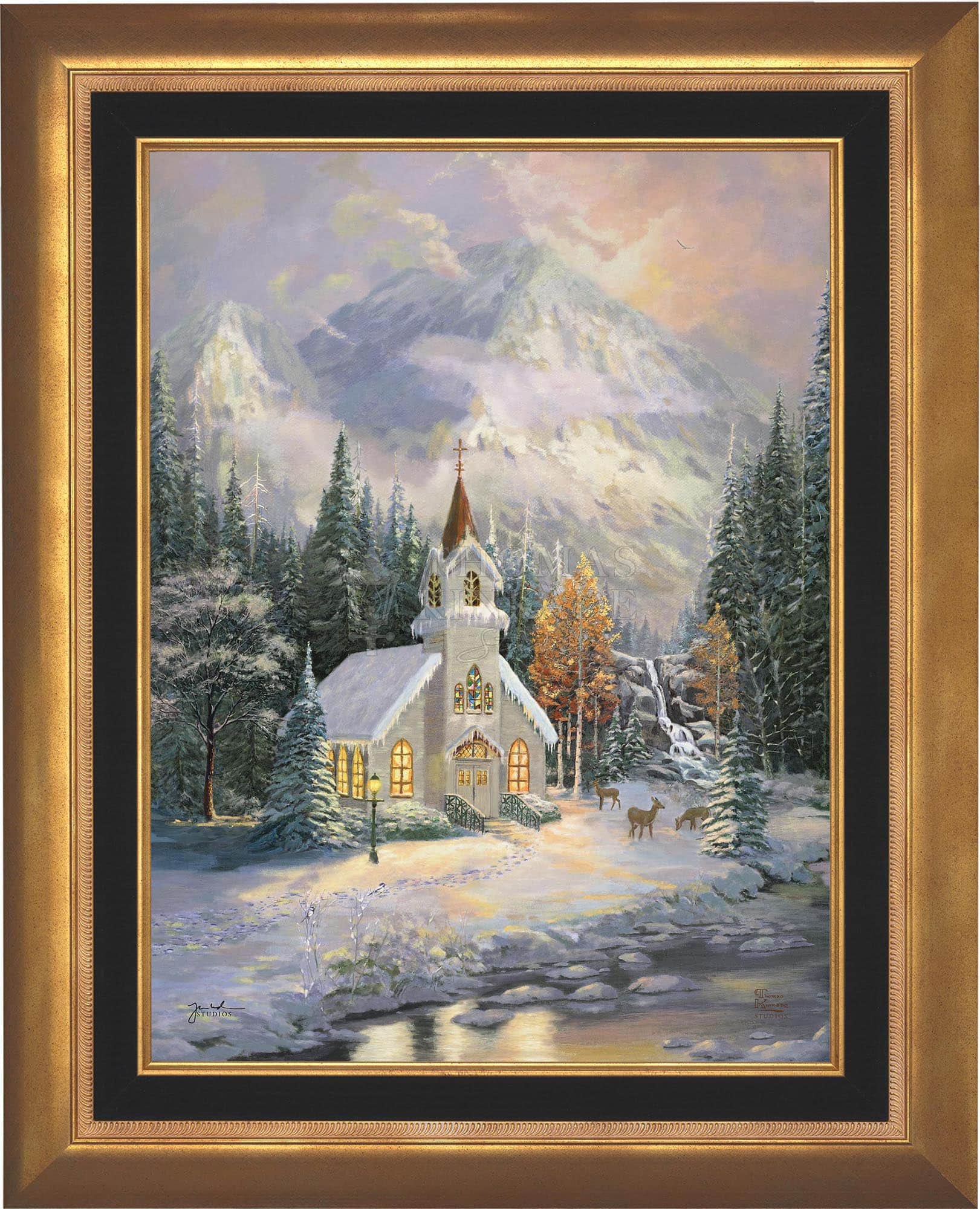 Thomas Kinkade would often ponder what one may find around the corner of any path in his paintings. In commemoration of the 25th Anniversary of the release of Thom’s best-selling painting, Deer Creek Cottage, Thomas Kinkade Studios has created Deer Creek Chapel, an interpretation of what may lie around the corner from Thom’s well-loved winter cottage. Nestled beneath the mountains, highlighted by the rising sun, Deer Creek Chapel is visited by a family of deer reminiscent of Deer Creek Cottage. The morning sunlight glistens off the freshly fallen snow. A delicate fawn peers at the lights glowing from the chapel windows. Deer Creek Chapel captures the beauty of Nature and celebrates the wonder of God’s creations.