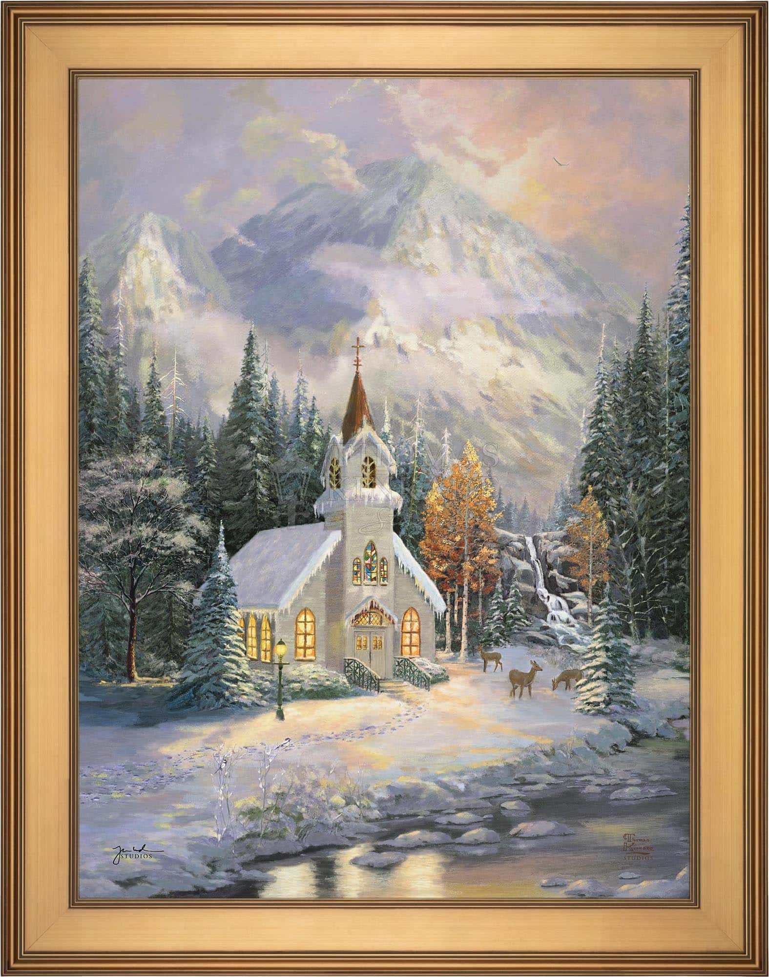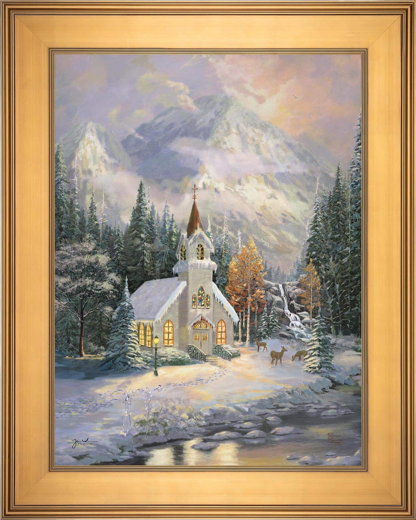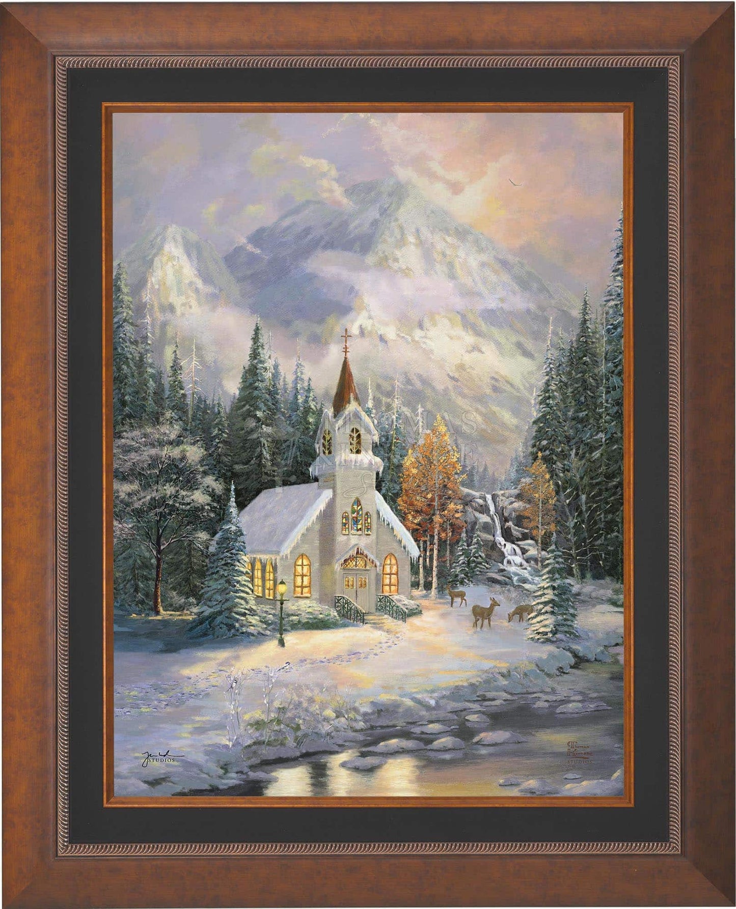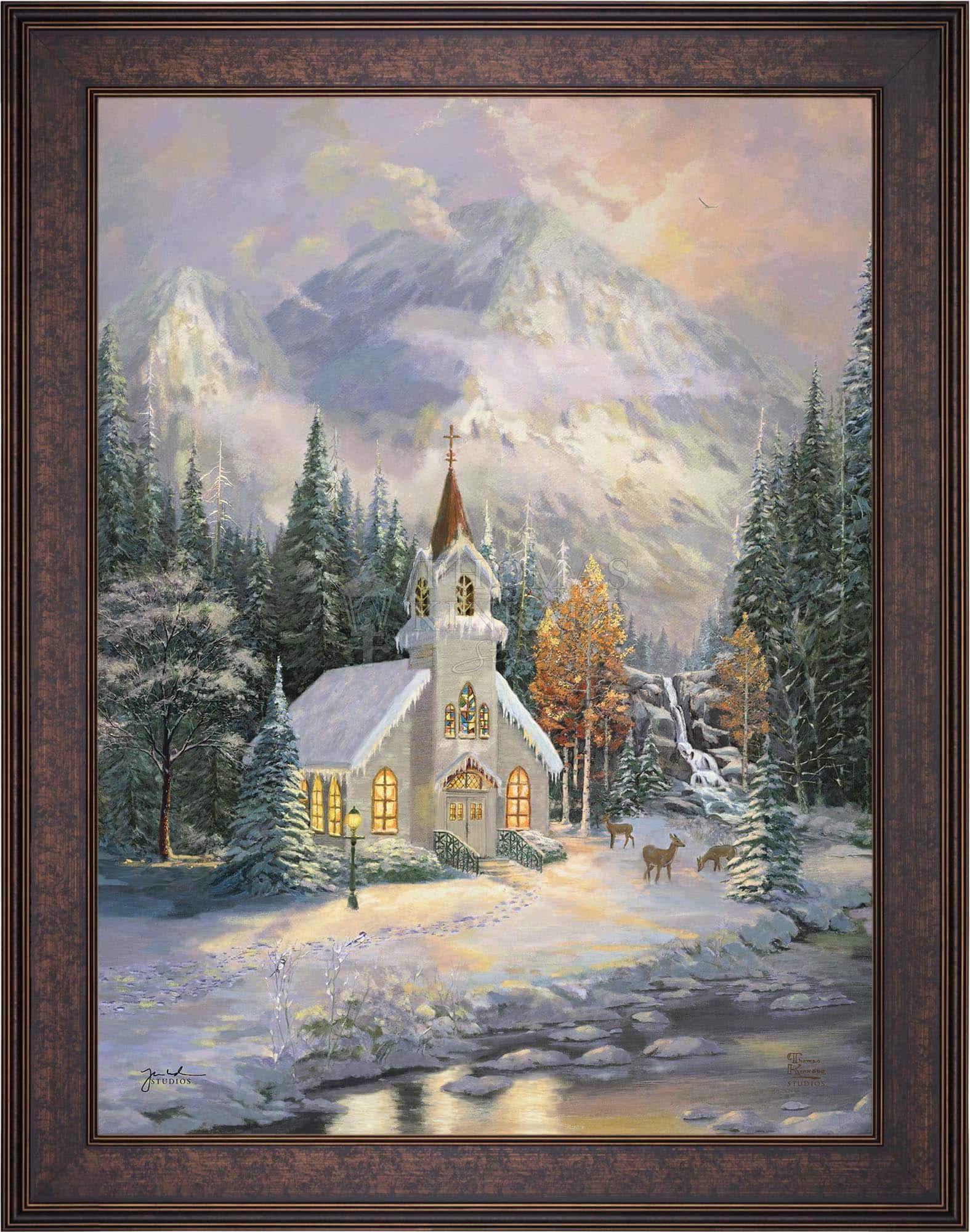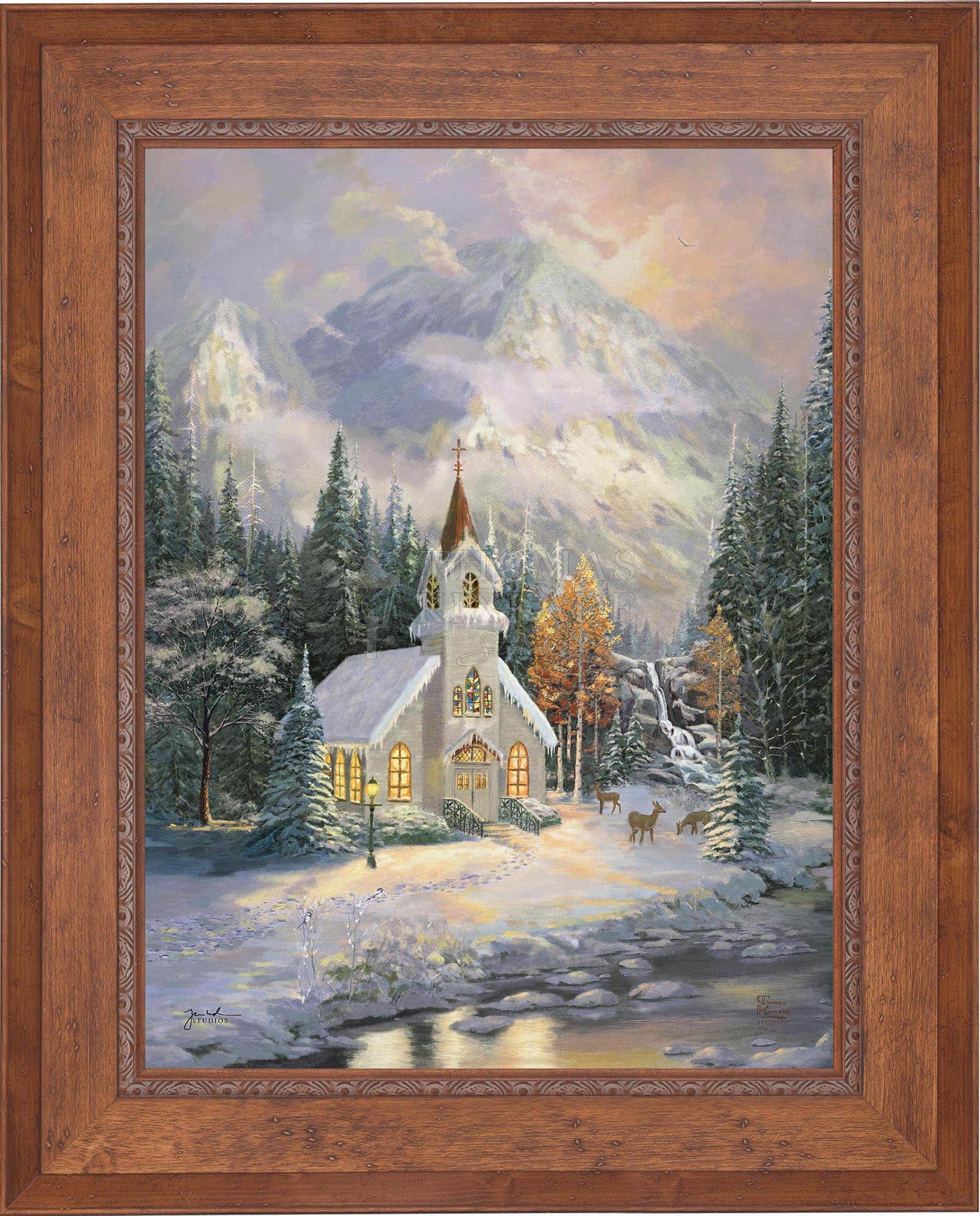 Thomas Kinkade would often ponder what one may find around the corner of any path in his paintings. In commemoration of the 25th Anniversary of the release of Thom’s best-selling painting, Deer Creek Cottage, Thomas Kinkade Studios has created Deer Creek Chapel, an interpretation of what may lie around the corner from Thom’s well-loved winter cottage. Nestled beneath the mountains, highlighted by the rising sun, Deer Creek Chapel is visited by a family of deer reminiscent of Deer Creek Cottage. The morning sunlight glistens off the freshly fallen snow. A delicate fawn peers at the lights glowing from the chapel windows. Deer Creek Chapel captures the beauty of Nature and celebrates the wonder of God’s creations.