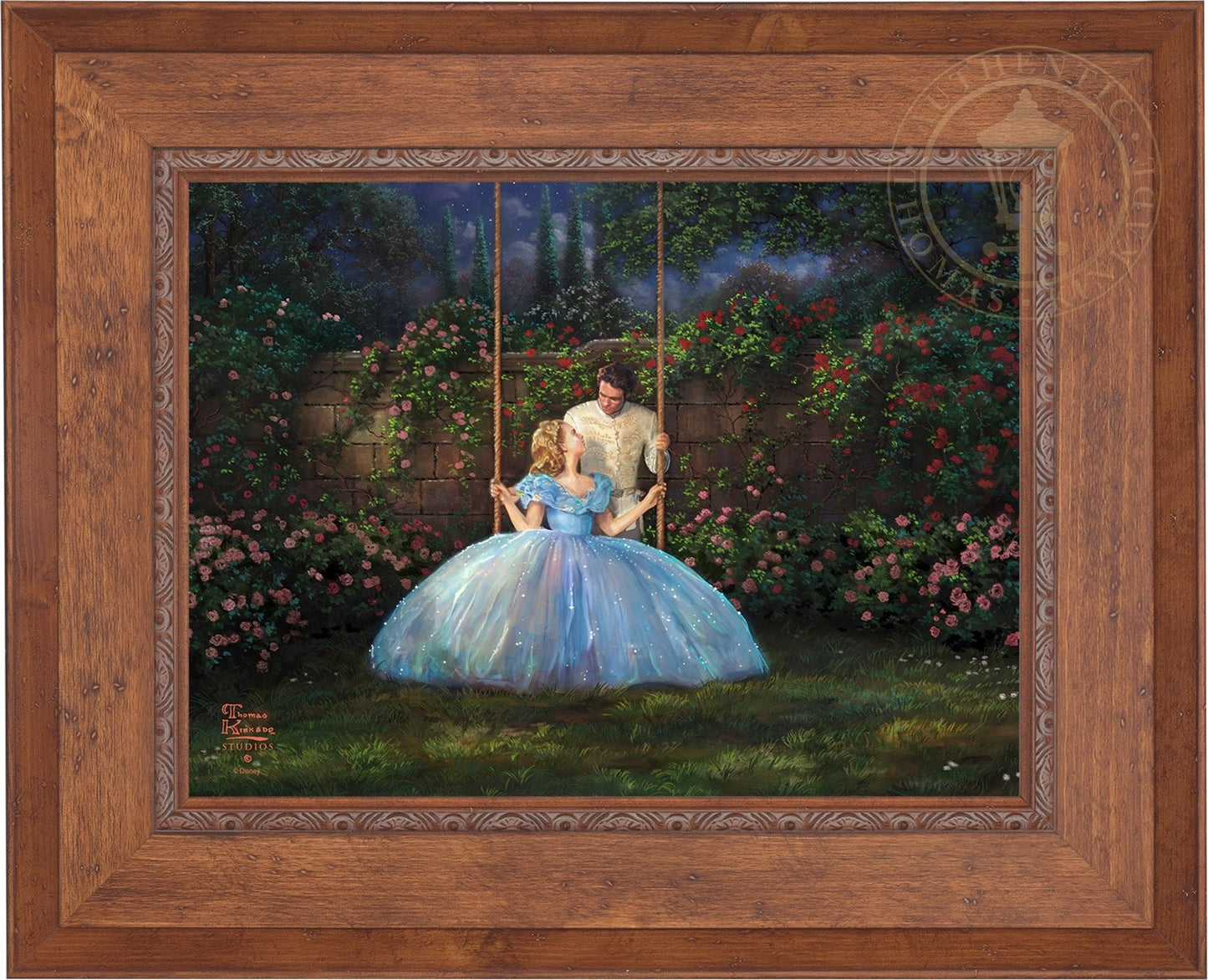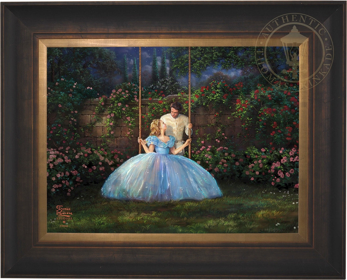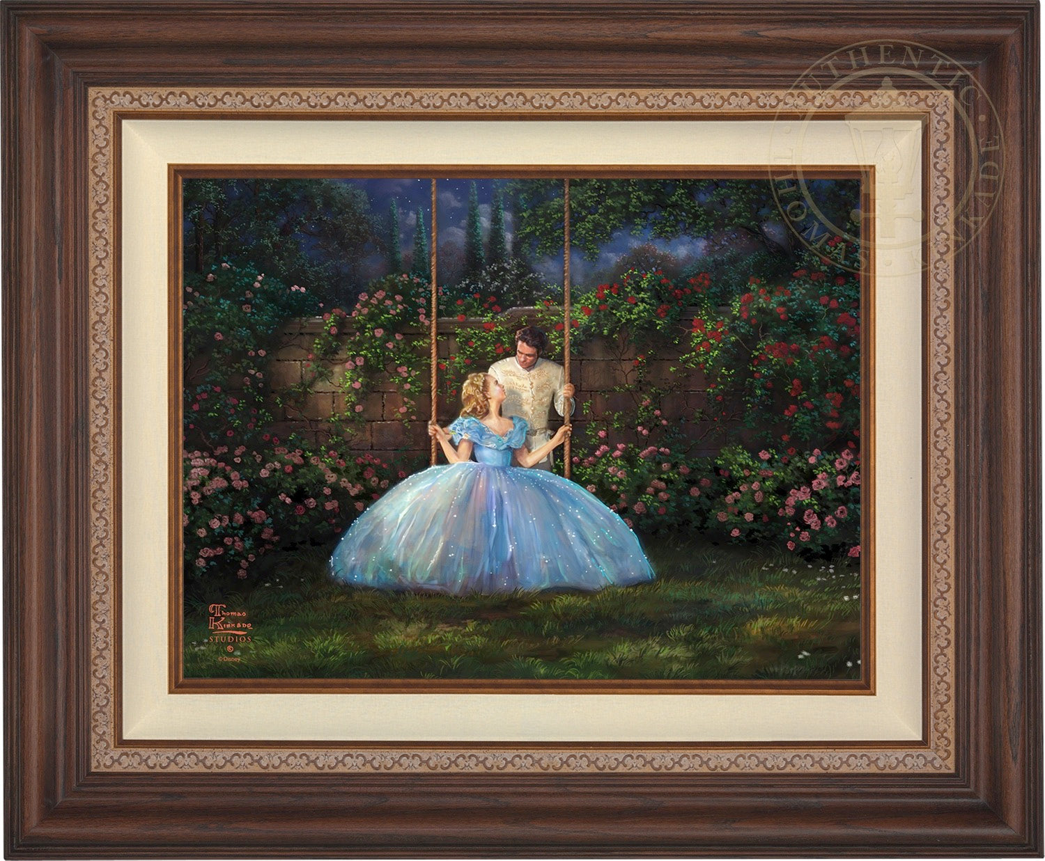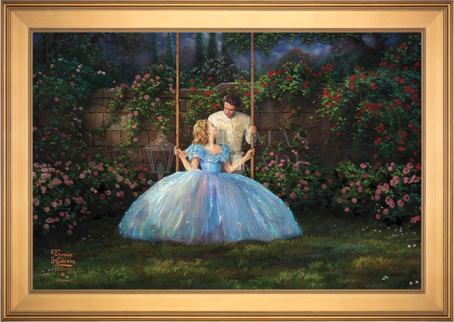 The story of Cinderella is a timeless and universal tale of romance and self-discovery. It explores the importance of inner beauty in the assessment of personal worth and proclaims the power of true love to overcome all obstacles no matter how large and daunting they may seem. The folklore of the hidden princess magically discovered by her true prince has been told for hundreds of years in countries throughout the world as geographically and culturally diverse as Malaysia and Germany. The beauty of the fable and the importance of its message have also made it a constant in the list of favorite stories told and enjoyed by those spinning yarns in our own country. To be sure, Thom loved the original Cinderella as much as any and would speak of it fondly when reminiscing of story-times spent with his own beautiful daughters. Their laughter and delight at his telling would shine in his own eyes as he reveled in their obvious enchantment.We at the Thomas Kinkade Studios are excited to continue in this storytelling tradition, bringing to life the latest Disney retelling of this classic story in the form of four paintings; each capturing in oil the joy of first love, the wonderment of fairy magic and the excitement of romantic adventure. Whether you are enjoying the encounter with the dashing stranger in the woods, the depiction of Cinderella's enchanted transformation, her flight from discovery at the King's ball or her time in love with the prince of her dreams, all of these masterworks in color and light will dazzle your eye and speak to your heart. It is our hope that this latest interpretation of Cinderella be a gift not only to all "princesses" but also to all those who love them.