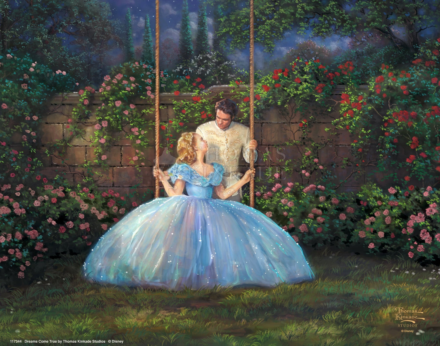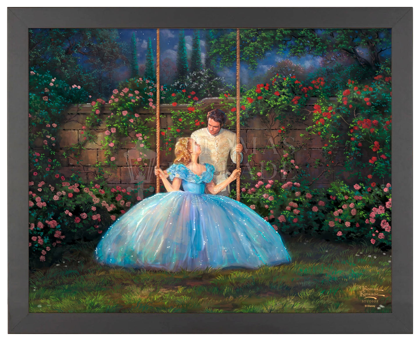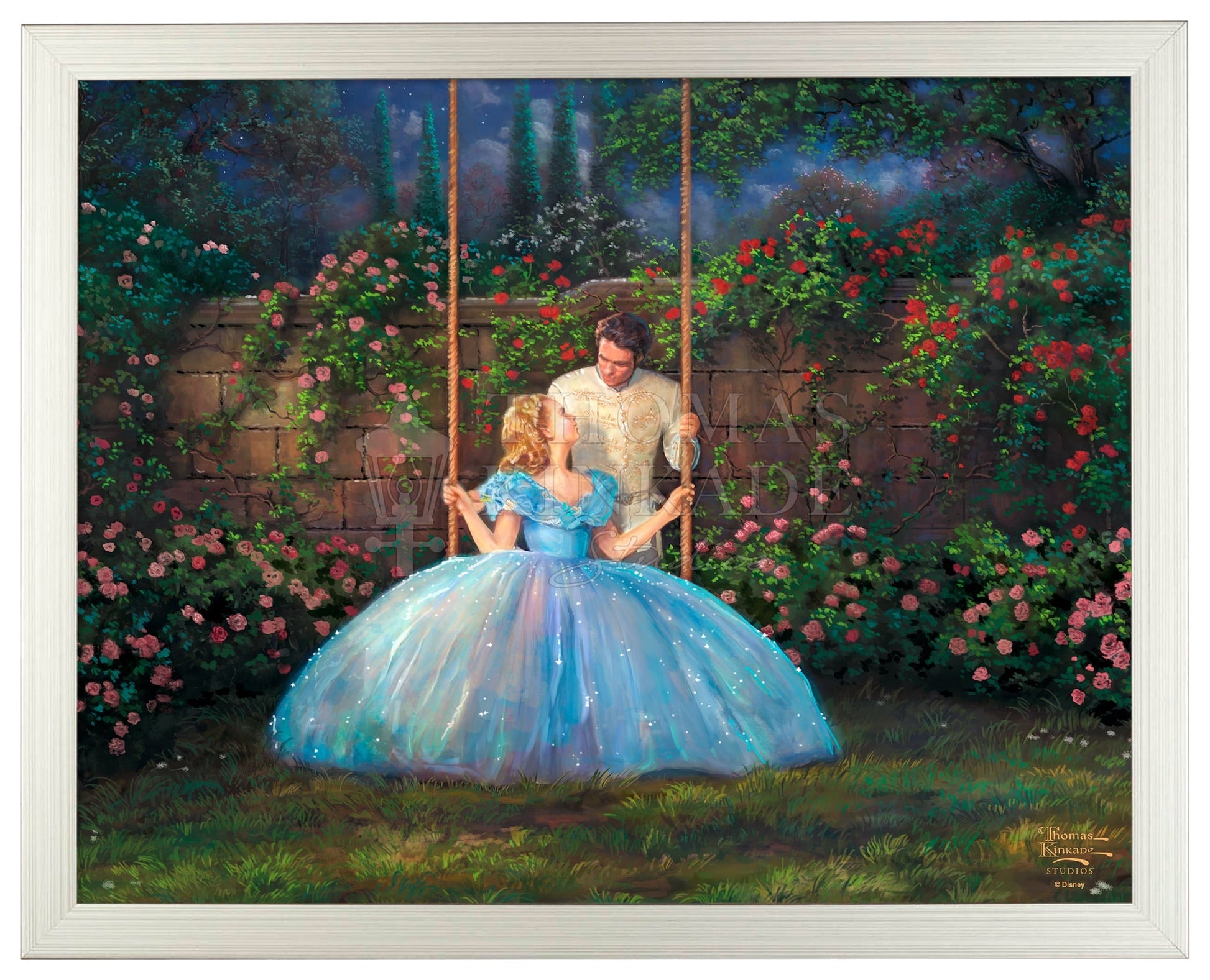 The story of Cinderella is a timeless and universal tale of romance and self-discovery. It explores the importance of inner beauty in the assessment of personal worth and proclaims the power of true love to overcome all obstacles no matter how large and daunting they may seem. The folklore of the hidden princess magically discovered by her true prince has been told for hundreds of years in countries throughout the world as geographically and culturally diverse as Malaysia and Germany. The beauty of the fable and the importance of its message have also made it a constant in the list of favorite stories told and enjoyed by those spinning yarns in our own country. To be sure, Thom loved the original Cinderella as much as any and would speak of it fondly when reminiscing of story-times spent with his own beautiful daughters. Their laughter and delight at his telling would shine in his own eyes as he reveled in their obvious enchantment.We at the Thomas Kinkade Studios are excited to continue in this storytelling tradition, bringing to life the latest Disney retelling of this classic story in the form of four paintings; each capturing in oil the joy of first love, the wonderment of fairy magic and the excitement of romantic adventure. Whether you are enjoying the encounter with the dashing stranger in the woods, the depiction of Cinderella's enchanted transformation, her flight from discovery at the King's ball or her time in love with the prince of her dreams, all of these masterworks in color and light will dazzle your eye and speak to your heart. It is our hope that this latest interpretation of Cinderella be a gift not only to all "princesses" but also to all those who love them.