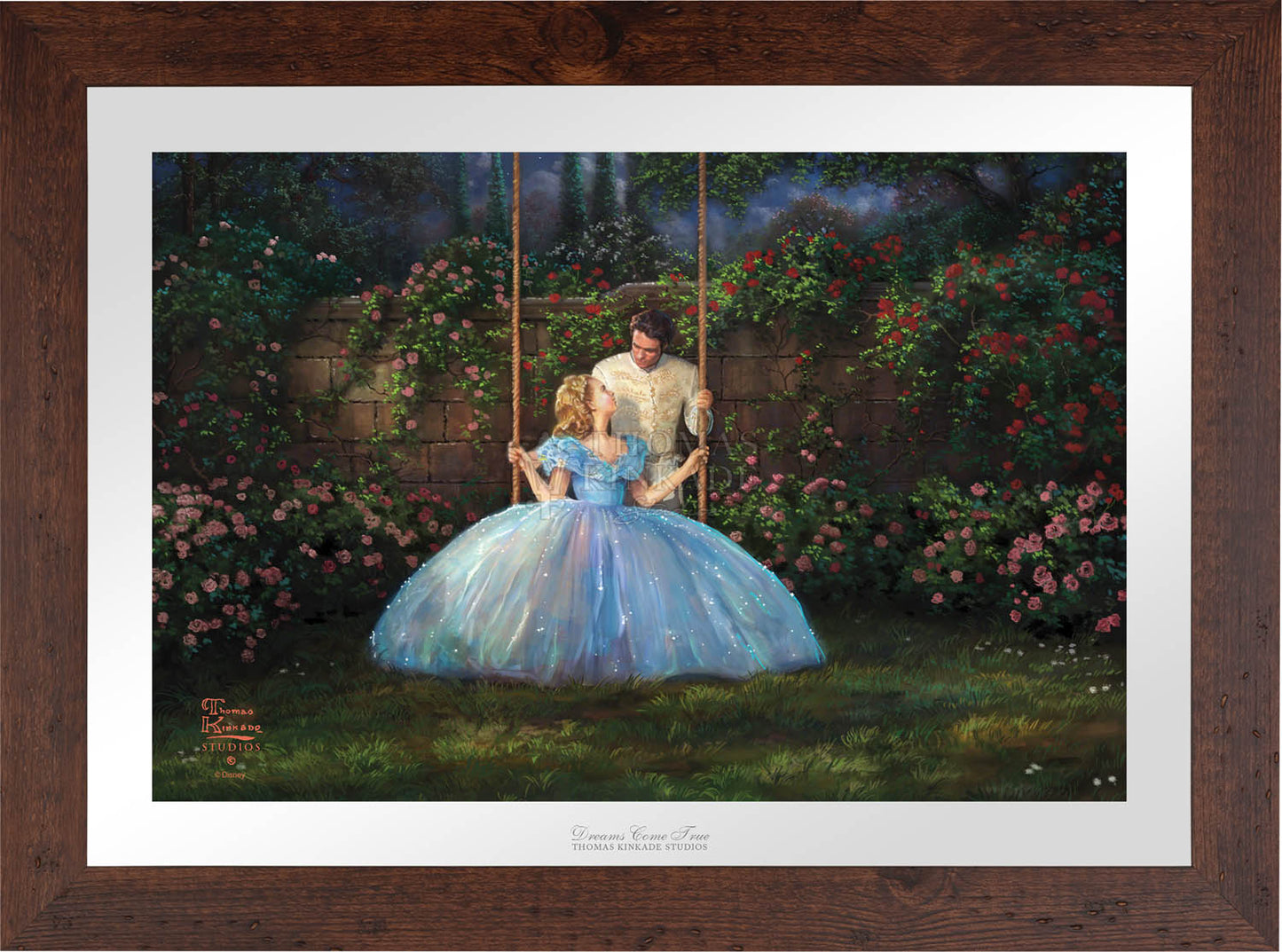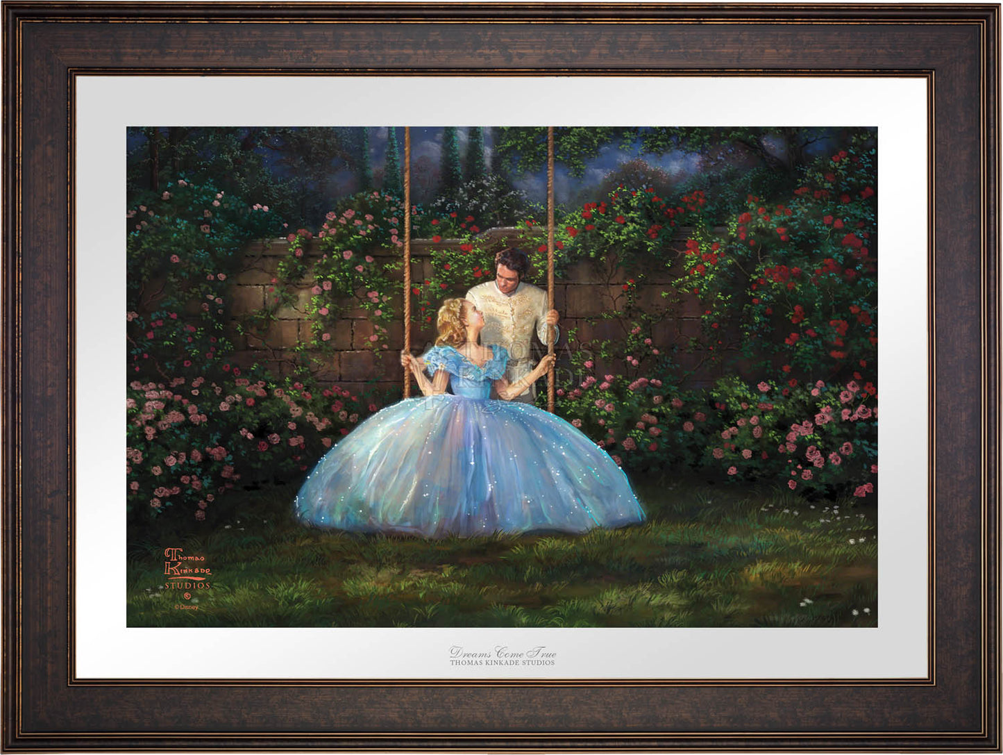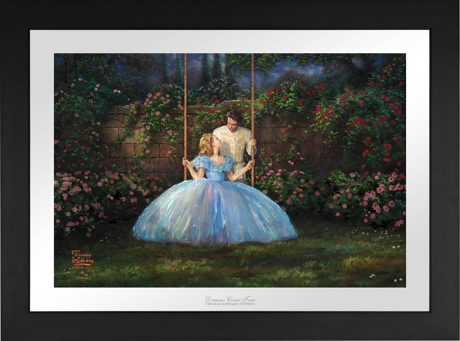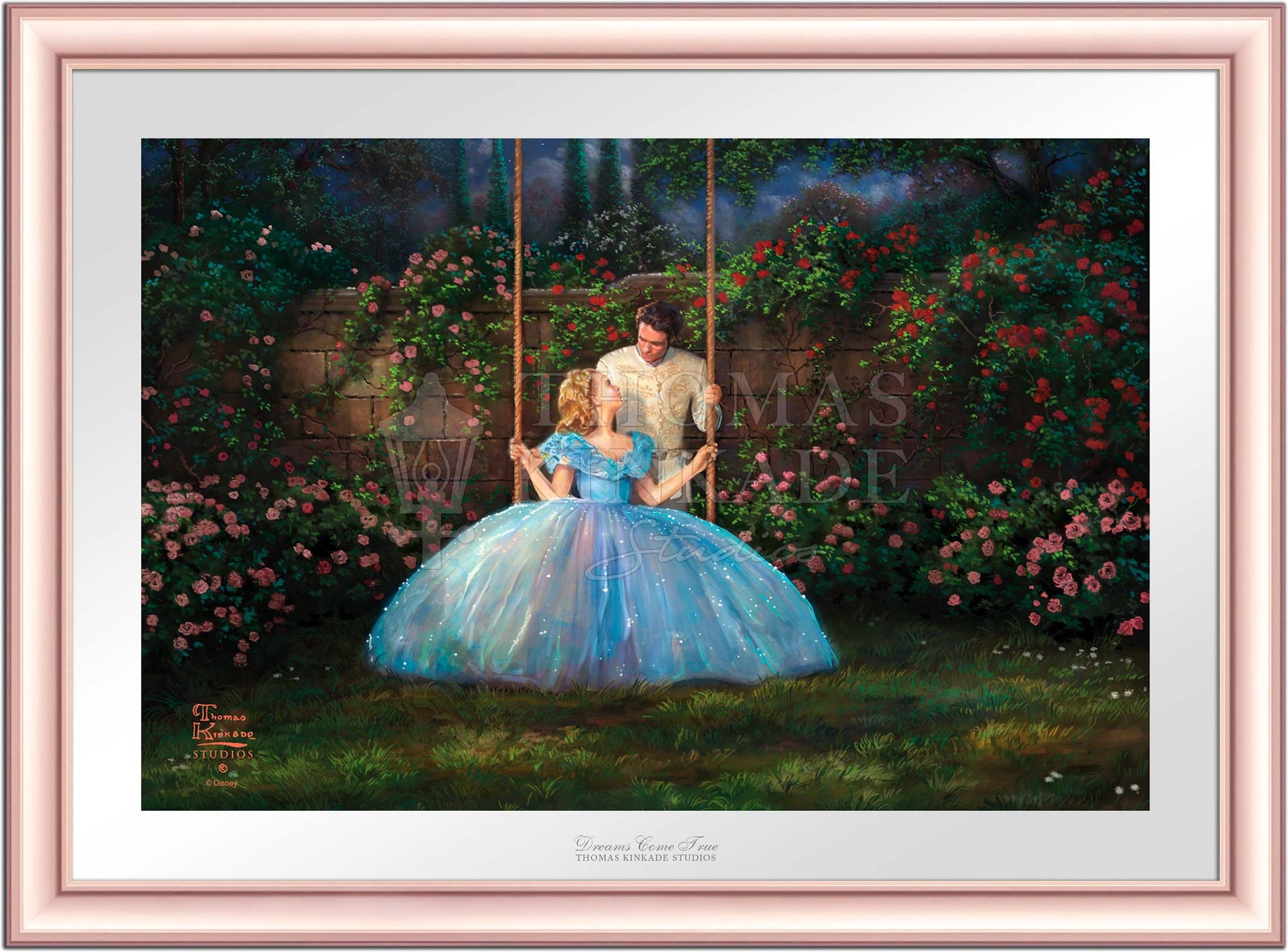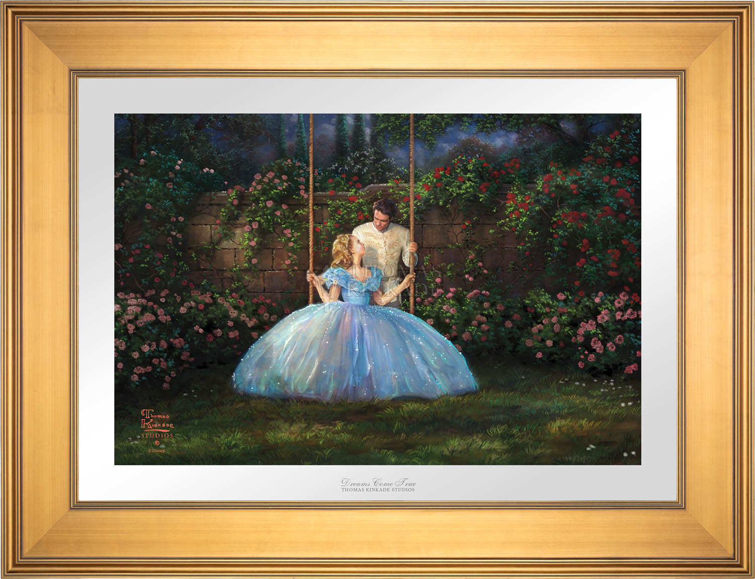 Call UsThe story of Cinderella is a timeless and universal tale of romance and self-discovery. It explores the importance of inner beauty in the assessment of personal worth and proclaims the power of true love to overcome all obstacles no matter how large and daunting they may seem. The folklore of the hidden princess magically discovered by her true prince has been told for hundreds of years in countries throughout the world as geographically and culturally diverse as Malaysia and Germany. The beauty of the fable and the importance of its message have also made it a constant in the list of favorite stories told and enjoyed by those spinning yarns in our own country. To be sure, Thom loved the original Cinderella as much as any and would speak of it fondly when reminiscing of story-times spent with his own beautiful daughters. Their laughter and delight at his telling would shine in his own eyes as he reveled in their obvious enchantment.We at the Thomas Kinkade Studios are excited to continue in this storytelling tradition, bringing to life the latest Disney retelling of this classic story in the form of four paintings; each capturing in oil the joy of first love, the wonderment of fairy magic and the excitement of romantic adventure. Whether you are enjoying the encounter with the dashing stranger in the woods, the depiction of Cinderella's enchanted transformation, her flight from discovery at the King's ball or her time in love with the prince of her dreams, all of these masterworks in color and light will dazzle your eye and speak to your heart. It is our hope that this latest interpretation of Cinderella be a gift not only to all "princesses" but also to all those who love them.