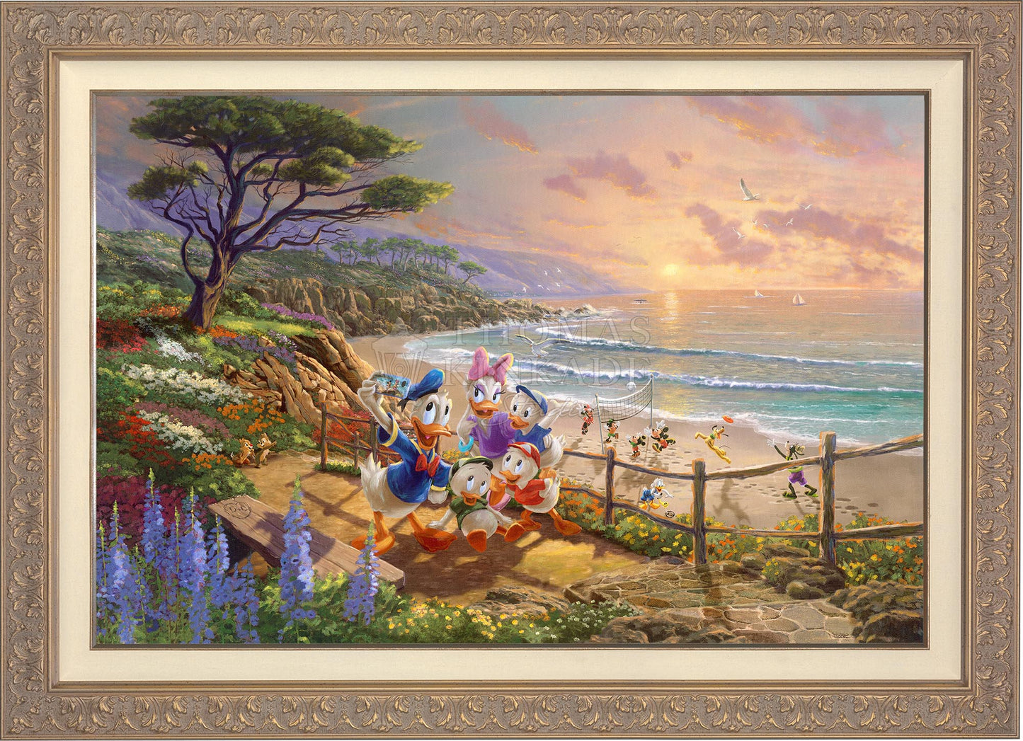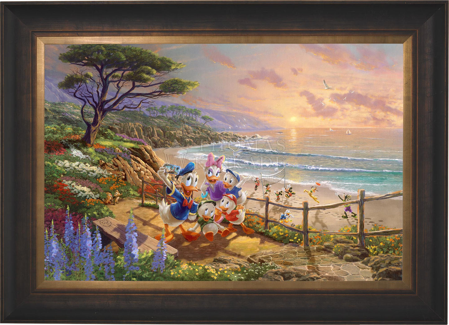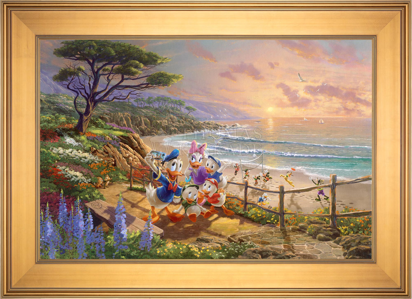 Thomas Kinkade Studios presents the second painting in the Friendship Moments series, Disney Donald and Daisy - A Duck Day Afternoon , where the bright sunshine highlights the coastal adventures of Donald Duck, Daisy Duck and some of their dearest friends.