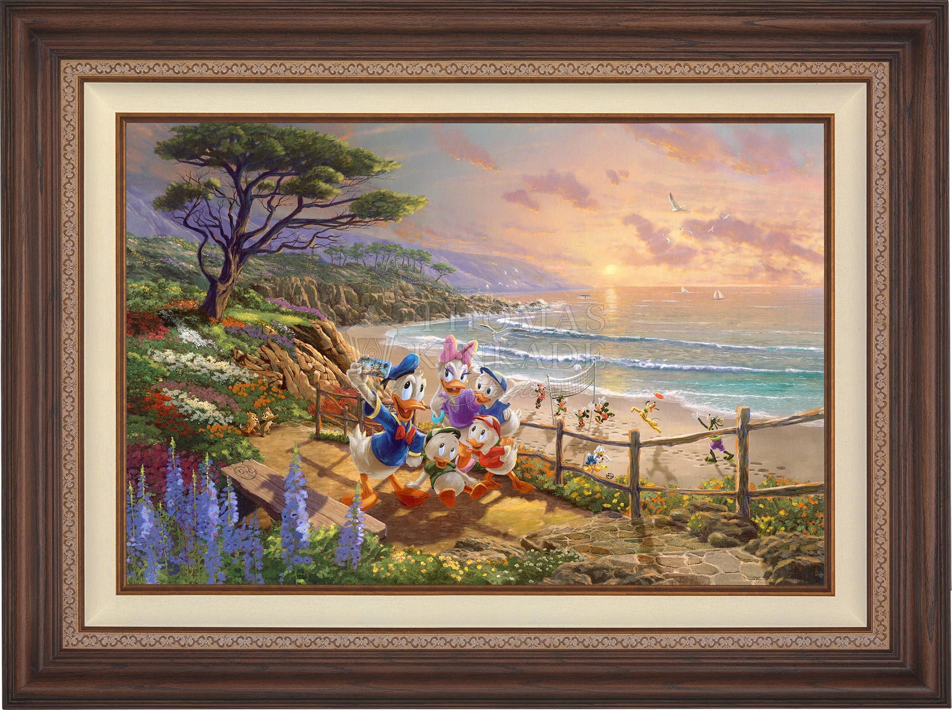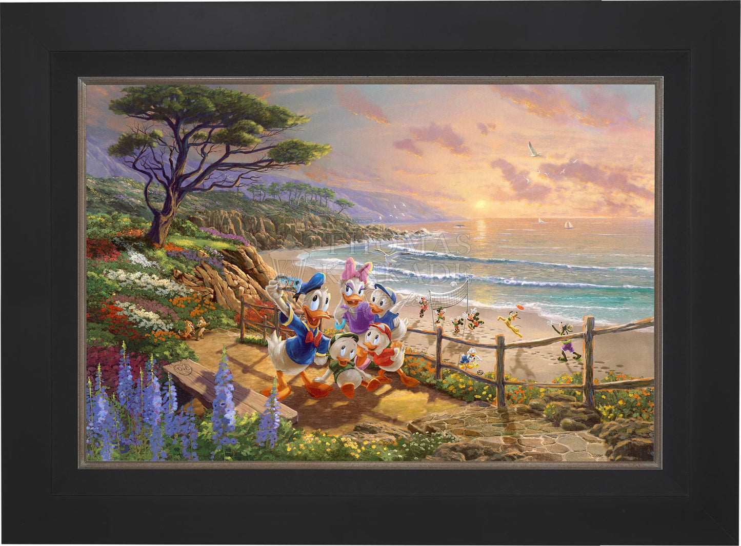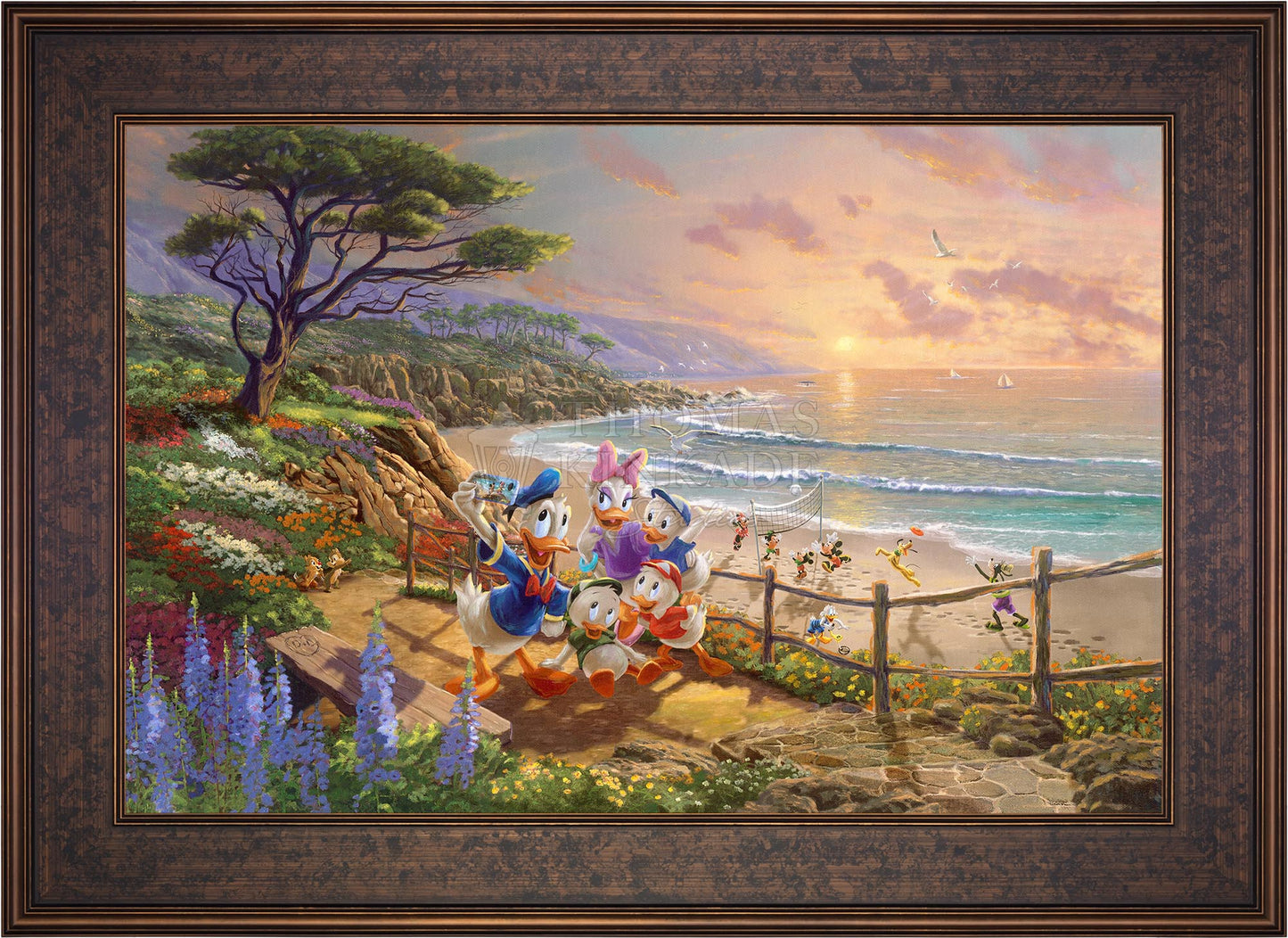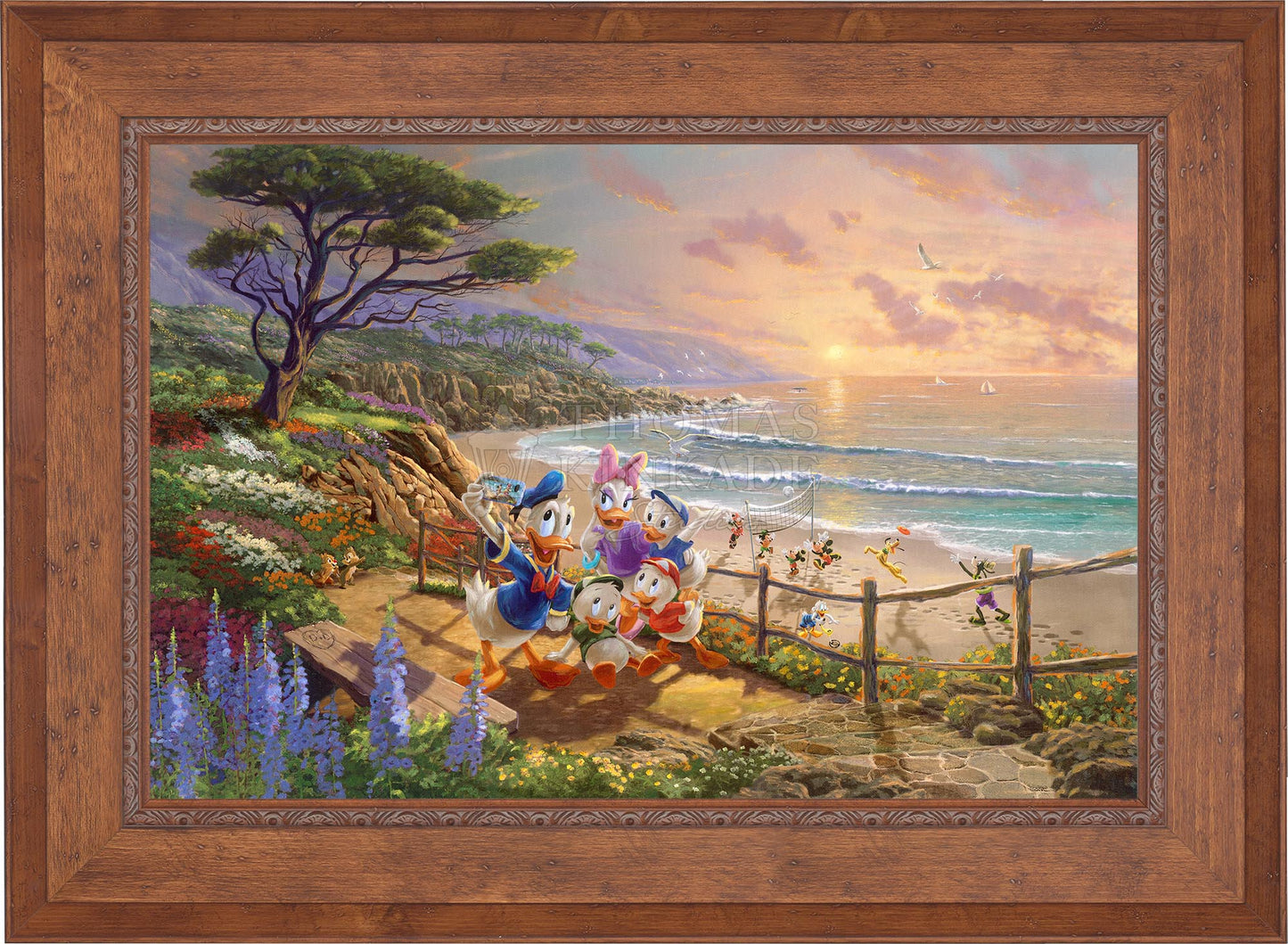 Thomas Kinkade Studios presents the second painting in the Friendship Moments series, Disney Donald and Daisy - A Duck Day Afternoon , where the bright sunshine highlights the coastal adventures of Donald Duck, Daisy Duck and some of their dearest friends.