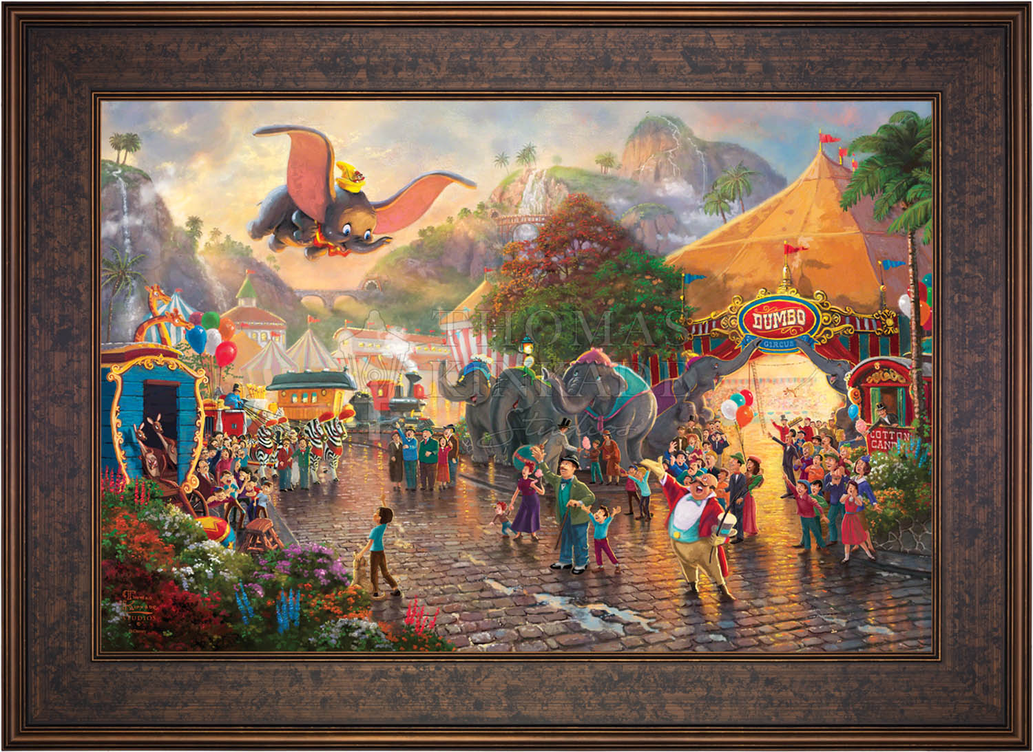 Dumbo is a beloved Disney film about overcoming obstacles and the power of positive thinking. The little elephant faces many challenges and conquers them with the love and encouragement of his best friend, Timothy Q. Mouse. This joyful story teaches us many powerful lessons, from feeling good about who we are to embracing the differences of others. Disney Dumbo by Thomas Kinkade Studios portrays the happiness and pride that his circus friends feel for Dumbo as he soars above the crowd. This painting captures Dumbo's shining moment, reminding us, as Timothy tells him, "The very things that held you down are going to carry you up and up and up!"