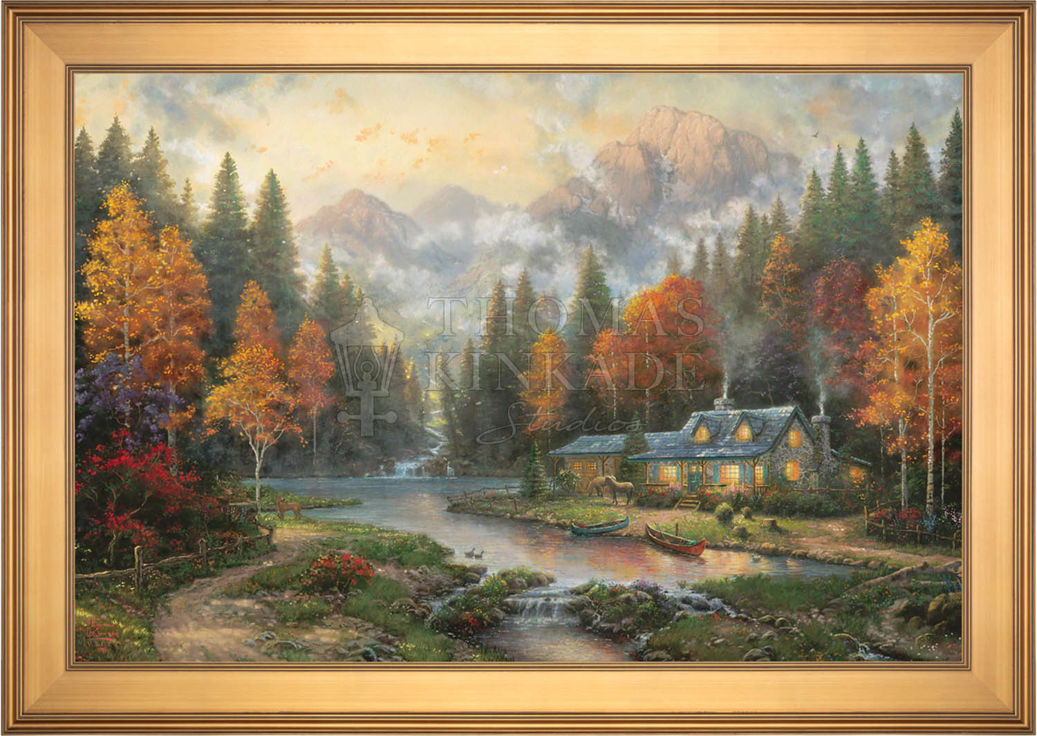 Autumn is a special time of year. When the crisp cold air flows down from the north and the leaves explode into vibrant hues of orange, yellow and red, one gets a sense of time passing, of another year coming to an end. It is the last flash of color before the world falls into winter and the promise of spring’s rebirth begins. Evening at Autumn Lak e captures that time of year when the nights become long and the world readies itself for a nap under a snowy blanket. Thomas Kinkade loved this season for the color it provided his palette, but also for the mood it created in the mountains he roamed as a young man. Thom grew up in the Sierra-Nevada’s and that majestic range is where he first honed his immense talents as a landscape artist.