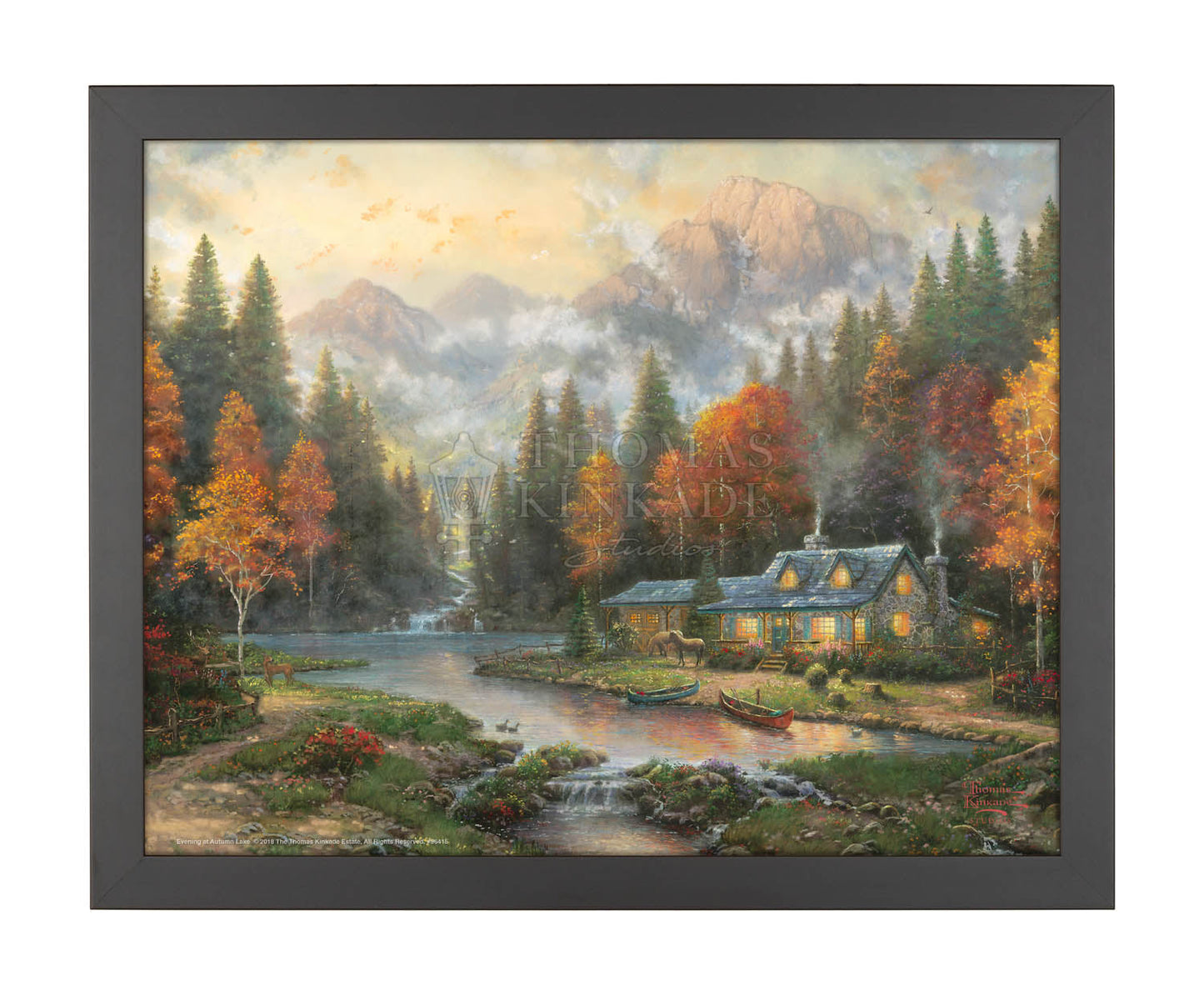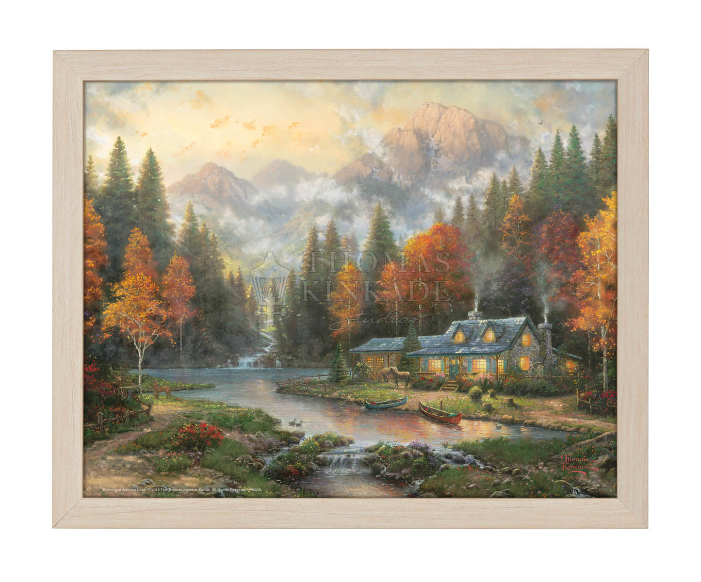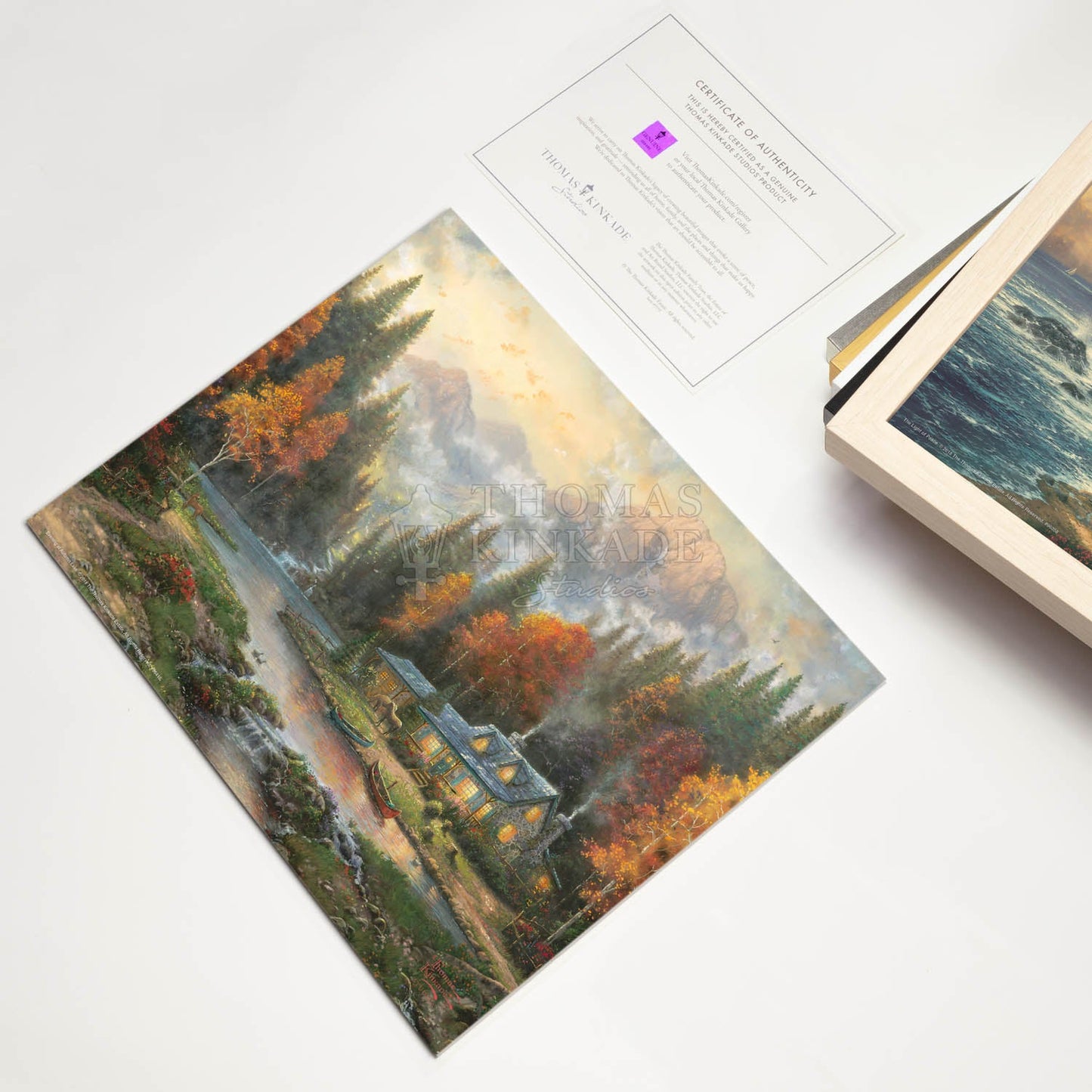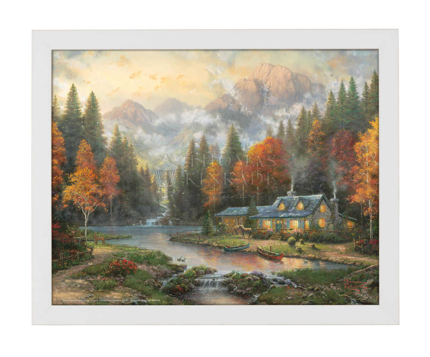Autumn is a special time of year. When the crisp cold air flows down from the north and the leaves explode into vibrant hues of orange, yellow and red, one gets a sense of time passing, of another year coming to an end. It is the last flash of color before the world falls into winter and the promise of spring’s rebirth begins. Evening at Autumn Lake captures that time of year when the nights become long and the world readies itself for a nap under a snowy blanket. Thomas Kinkade loved this season for the color it provided his palette, but also for the mood it created in the mountains he roamed as a young man. Thom grew up in the Sierra-Nevada’s and that majestic range is where he first honed his immense talents as a landscape artist.