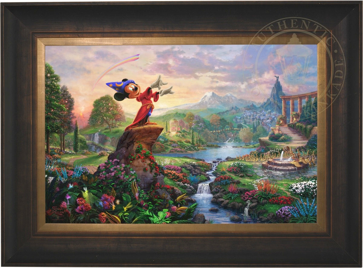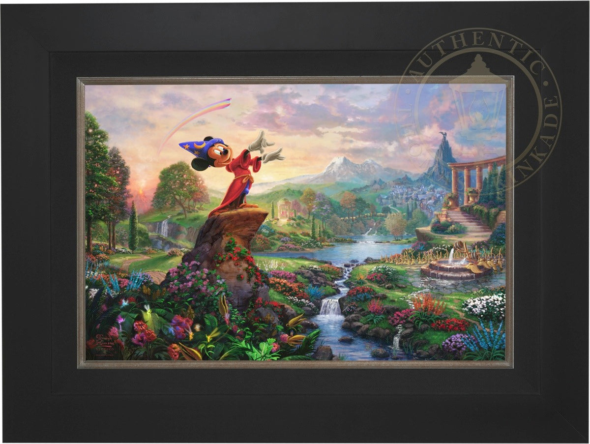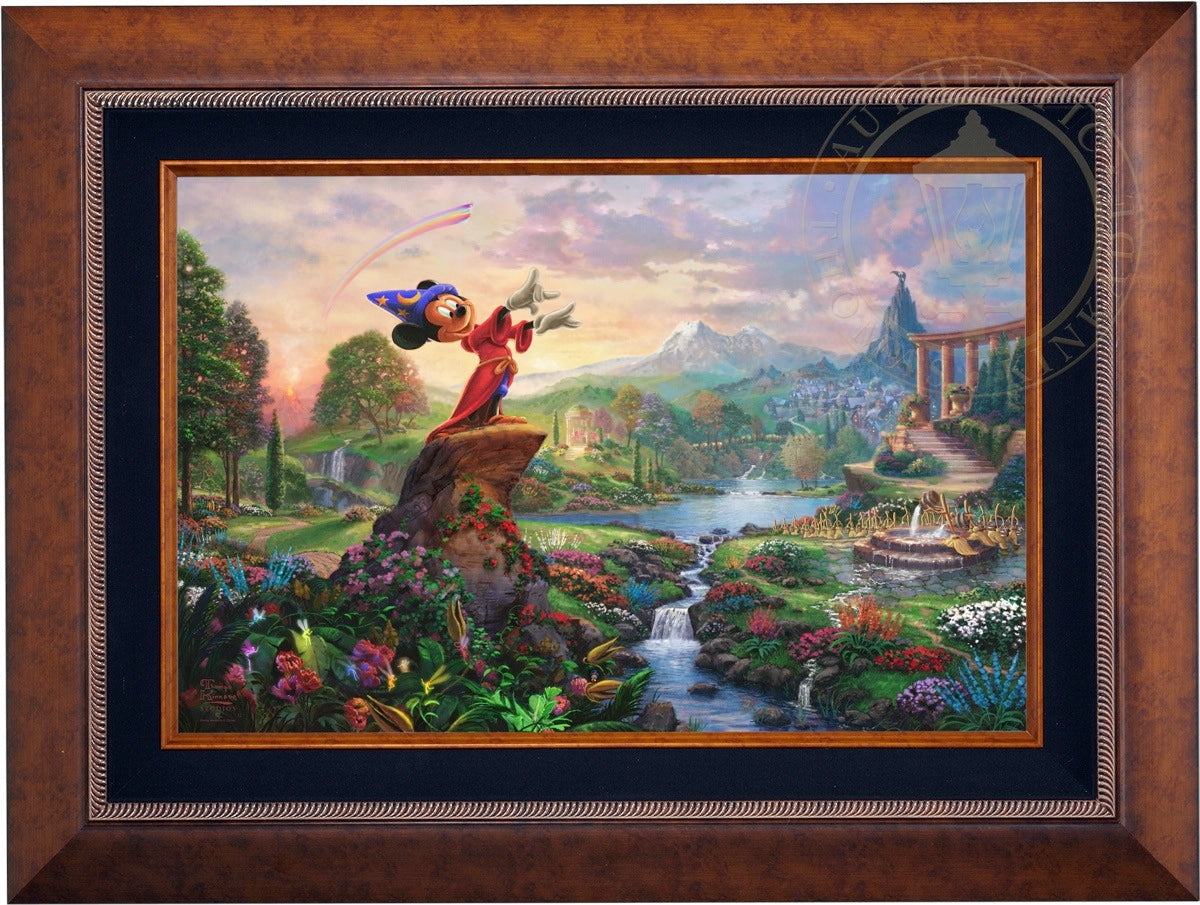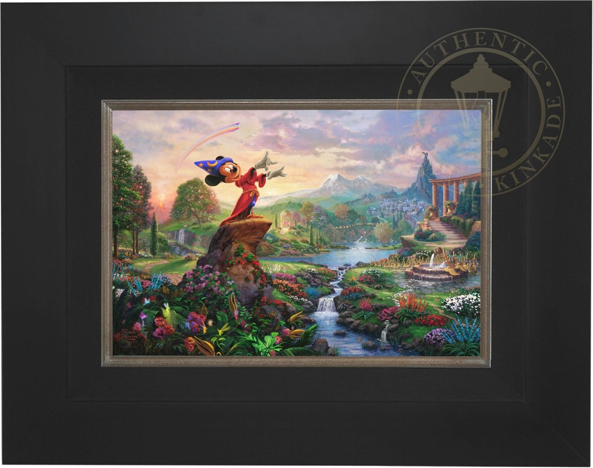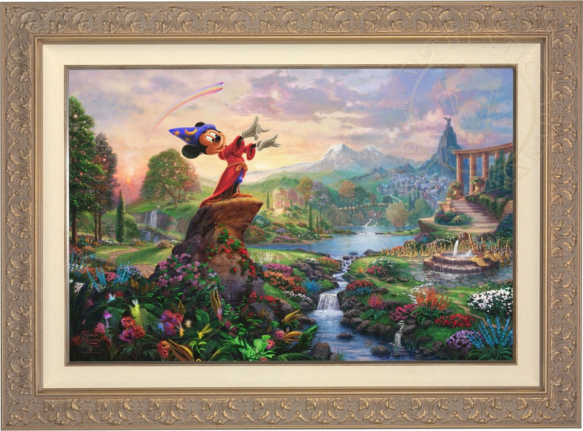 Walt Disney so famously reflected on his career and legacy "it was all started by a mouse", which indeed it did. From those simple beginnings in the classic cartoon Steamboat Willie, the "mouse" has grown to an iconic stature on the worldwide stage and clearly reached a very celebrated peak in the animated masterpiece Fantasia as the sorcerer's apprentice. Never before and truly never since has there been a more ambitious and successful fusion of high art, classical music and popular culture in film. Fantasia was a revolutionary film leaving an emotional, intellectual and spiritual impact on its viewer. It is from this lofty platform of visionary brilliance and excellence in artistic execution that the Thomas Kinkade Studios began its rendering of Fantasia. Joining the flowers and fairies are many delightful characters from various segments of this Disney classic. Mickey stands in the center of it all orchestrating the sublime dance going on about him. One can almost hear the strings, brass and timber of Leopold Stokowski's Philadelphia Orchestra spring to life while viewing this masterwork of color, light and animated composition. Indeed, it may have all started with a mouse but in Fantasia it has never been more clear that this simple fellow of humble beginnings has become so much more. Fantasia as a film is transcendent, fully taking the mouse to the level of high culture. We at Thomas Kinkade Studios hope you will all agree that our interpretation of Fantasia is yet another extension of the film's tradition of exploring beauty through the purity of joyous artistic expression.