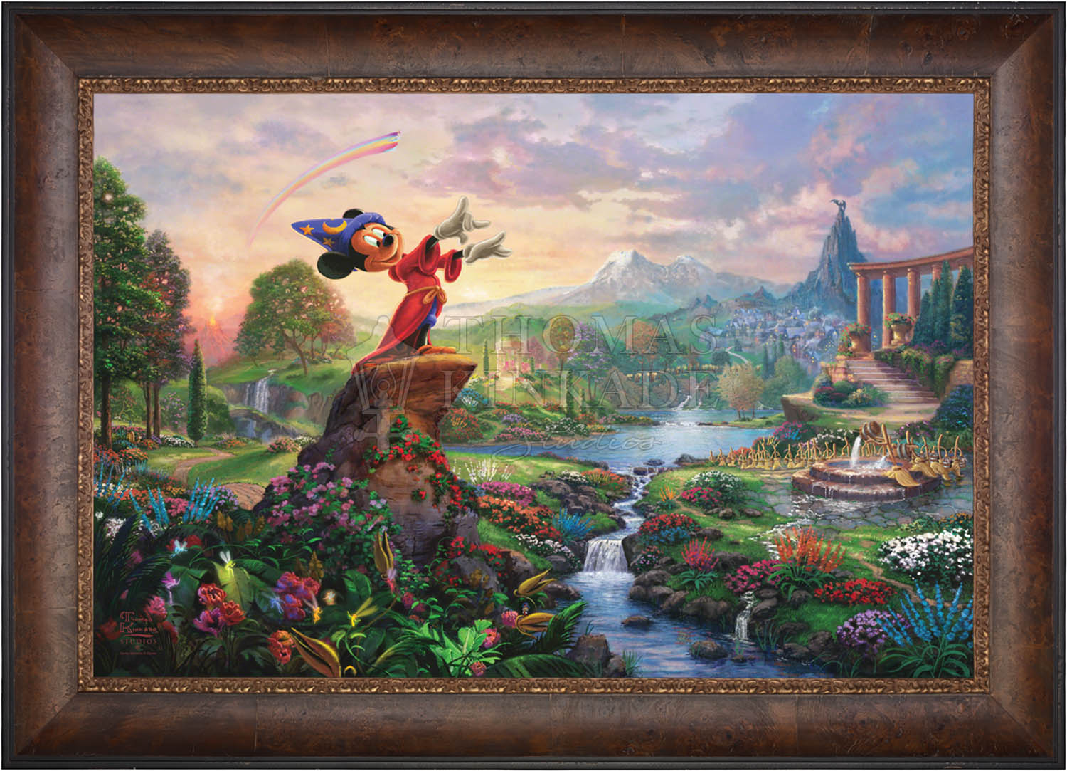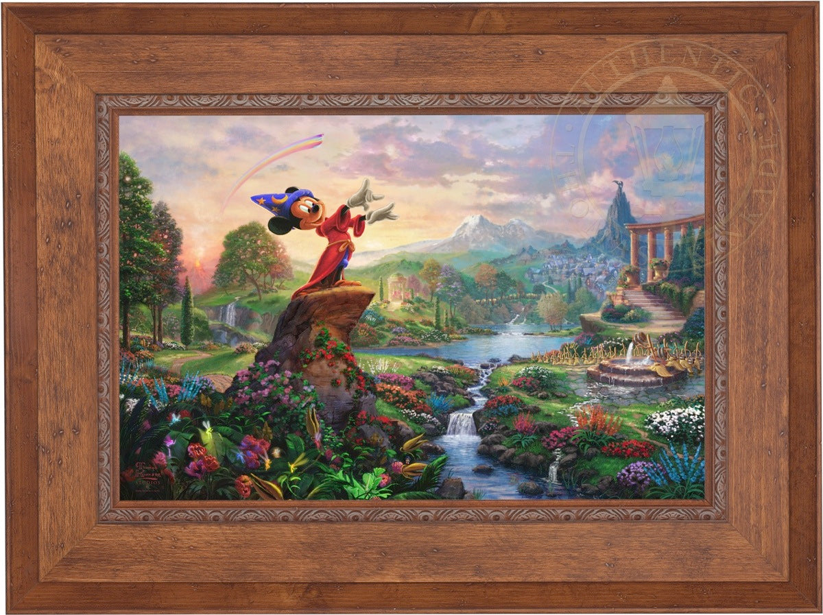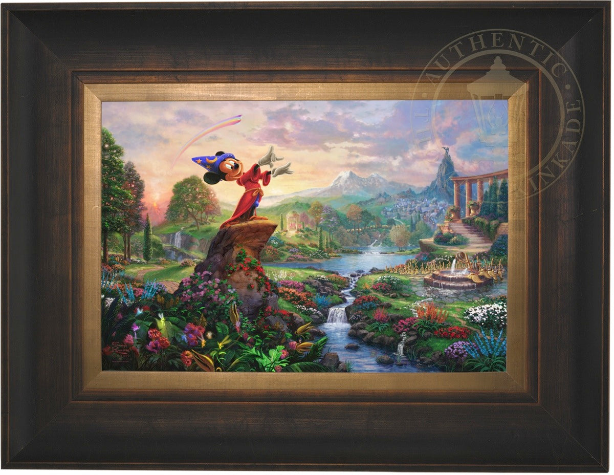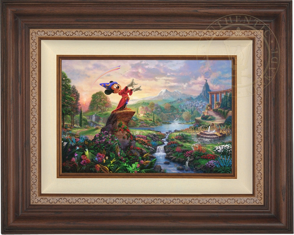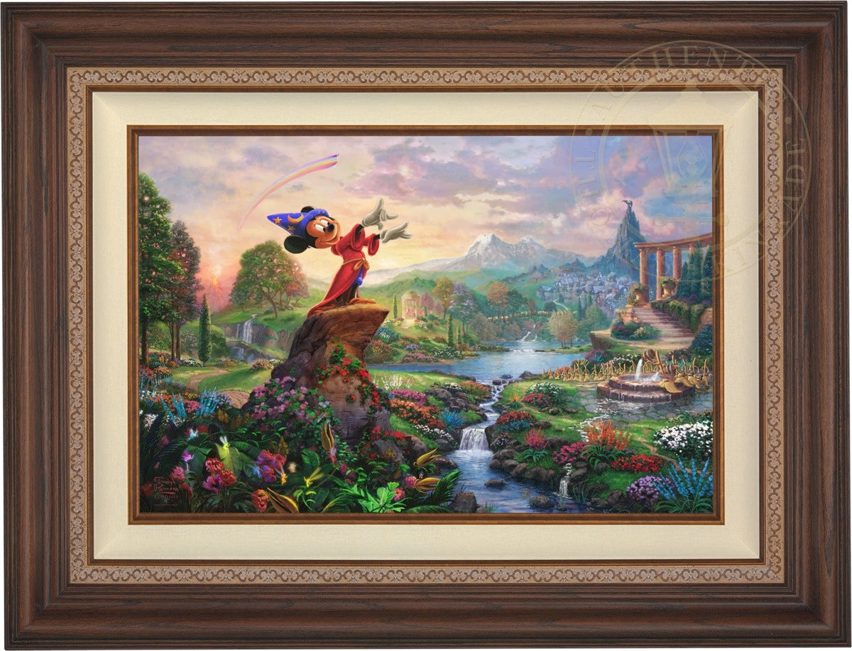 Walt Disney so famously reflected on his career and legacy "it was all started by a mouse", which indeed it did. From those simple beginnings in the classic cartoon Steamboat Willie, the "mouse" has grown to an iconic stature on the worldwide stage and clearly reached a very celebrated peak in the animated masterpiece Fantasia as the sorcerer's apprentice. Never before and truly never since has there been a more ambitious and successful fusion of high art, classical music and popular culture in film. Fantasia was a revolutionary film leaving an emotional, intellectual and spiritual impact on its viewer. It is from this lofty platform of visionary brilliance and excellence in artistic execution that the Thomas Kinkade Studios began its rendering of Fantasia. Joining the flowers and fairies are many delightful characters from various segments of this Disney classic. Mickey stands in the center of it all orchestrating the sublime dance going on about him. One can almost hear the strings, brass and timber of Leopold Stokowski's Philadelphia Orchestra spring to life while viewing this masterwork of color, light and animated composition. Indeed, it may have all started with a mouse but in Fantasia it has never been more clear that this simple fellow of humble beginnings has become so much more. Fantasia as a film is transcendent, fully taking the mouse to the level of high culture. We at Thomas Kinkade Studios hope you will all agree that our interpretation of Fantasia is yet another extension of the film's tradition of exploring beauty through the purity of joyous artistic expression.