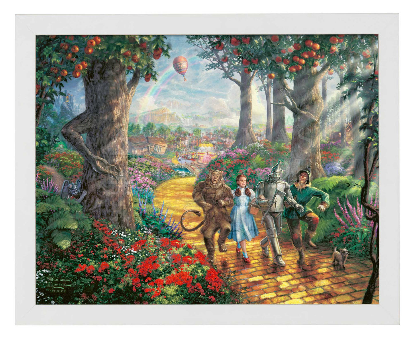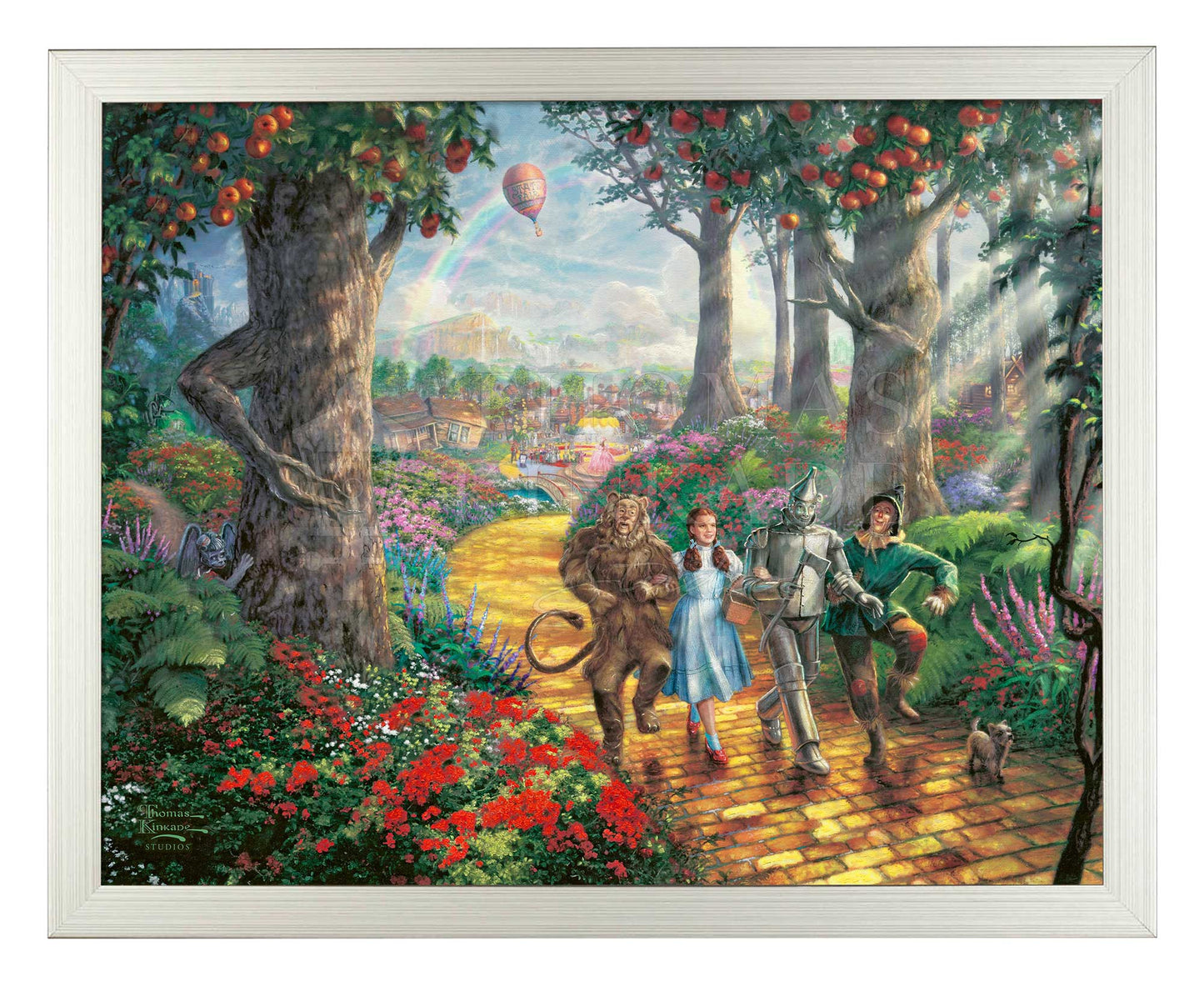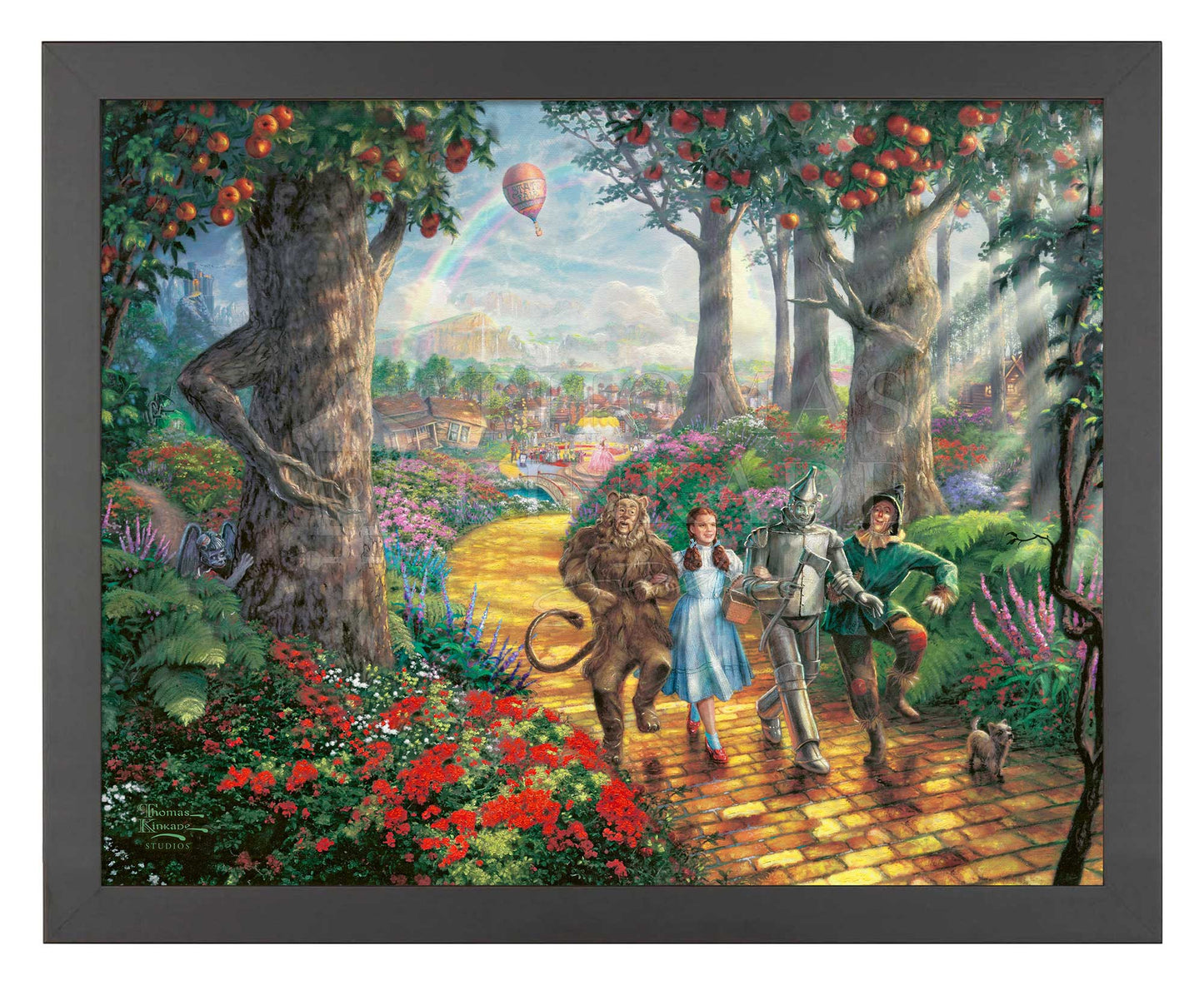 The color and beauty of the Land of Oz have been elaborated in this masterwork using Thomas Kinkade Studios' signature romantic luminist style. Gorgeous flower beds line the Yellow Brick Road and the mountains in the distance are glowing with the warmth of the passing day. The dappling of light on the ground appears from the shadows as the sun bursts through the foliage of the trees. Dimension emerges and the image comes to life with these artistic effects. Join with Thomas Kinkade Studios and all those who love the fantasy of The Wizard of Oz in celebration of this exciting release.