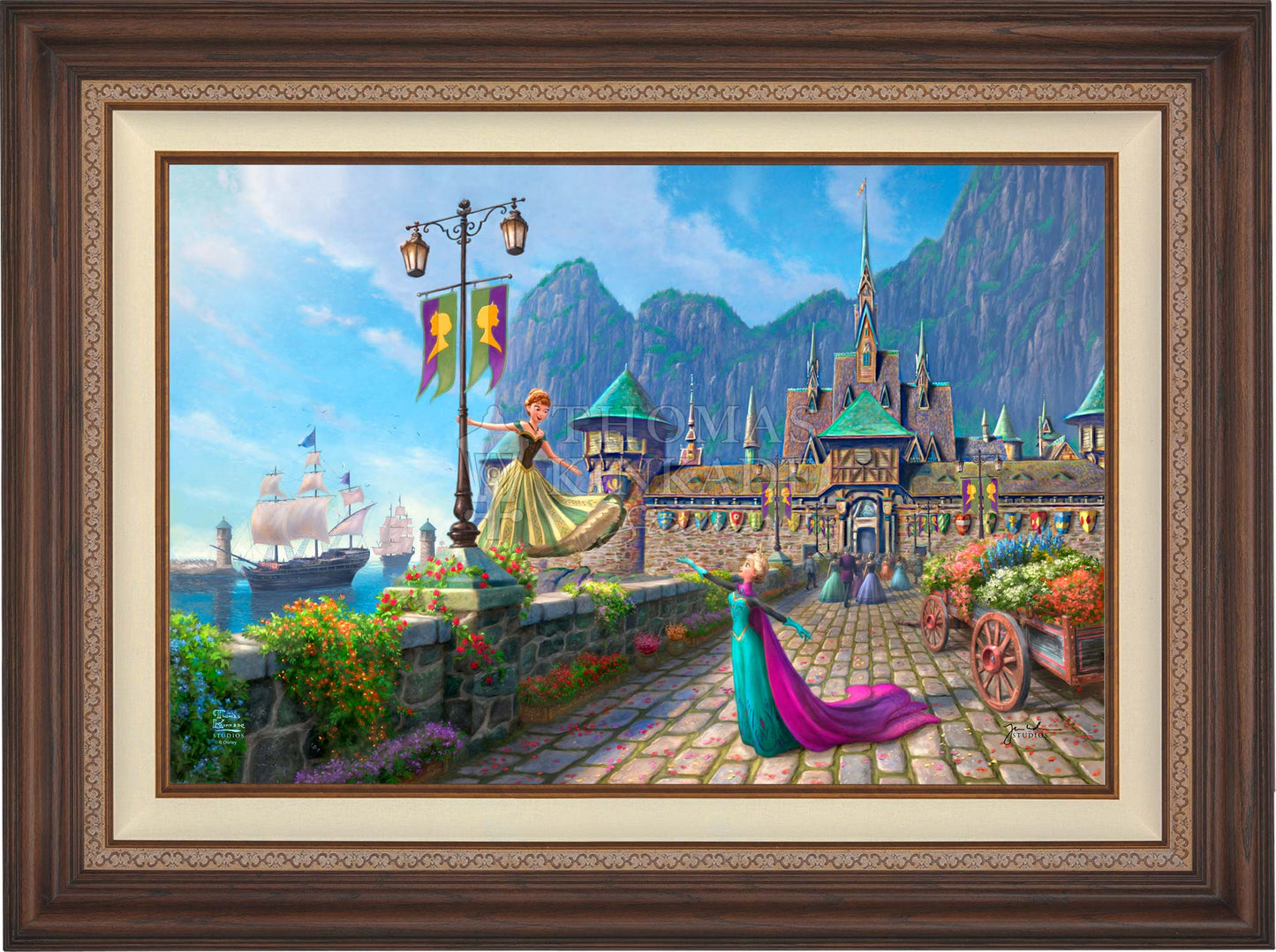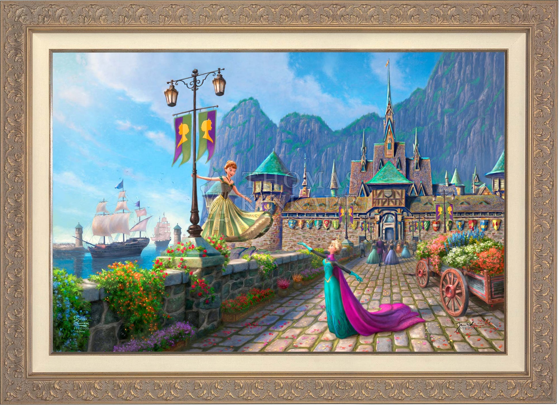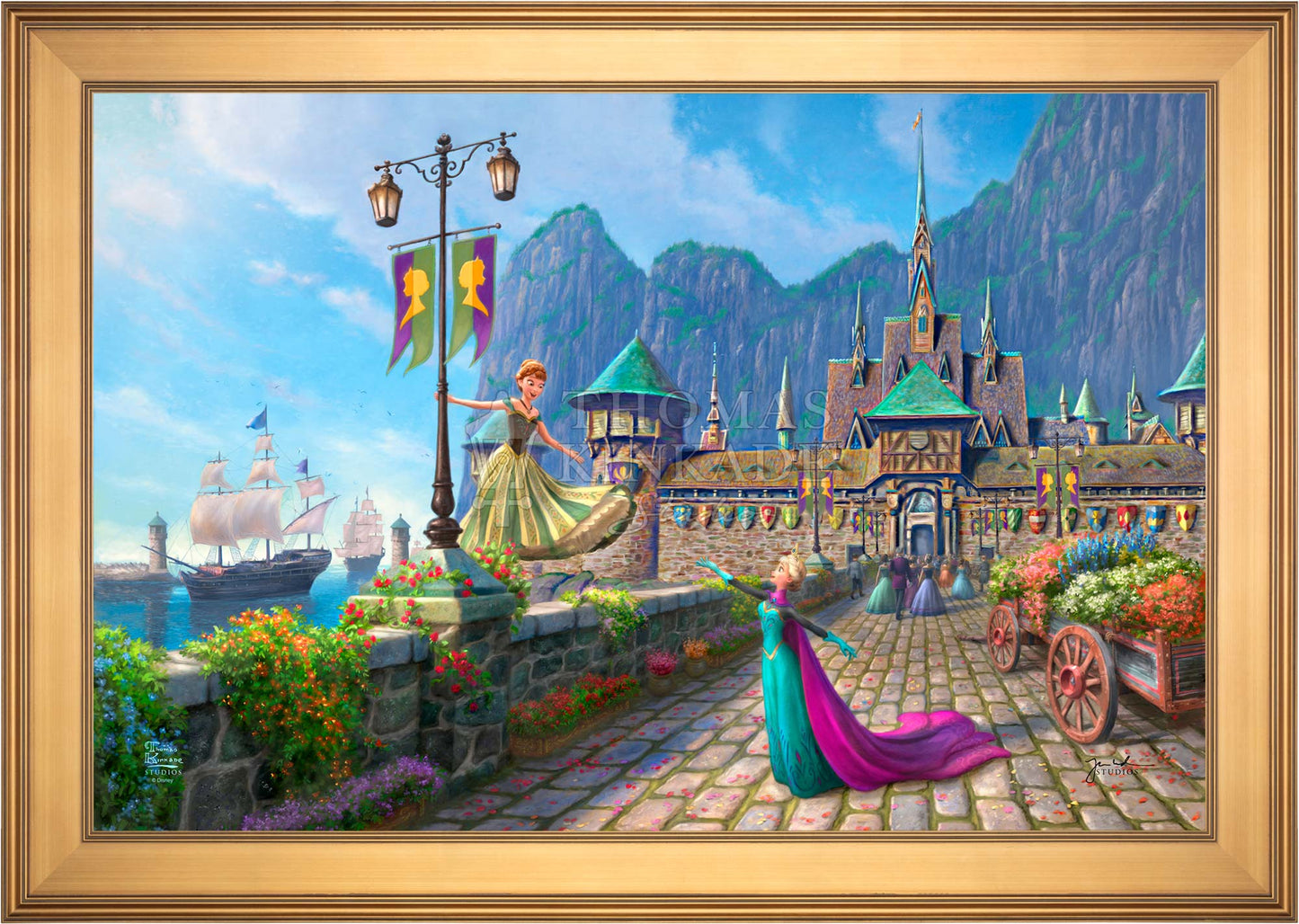 In Disney's Frozen , the kingdom of Arendelle had sadly lost their regents when the sailing vessel they were on sank in a ferocious storm. The country’s time of mourning has passed, and the kingdom of Arendelle has invited everyone, near and far, to join them in celebrating the coronation of the eldest daughter, Princess Elsa. A grand one-day fête has been planned, and the kingdom has been festooned with colorful flowers and flags. Thomas Kinkade Studios is pleased to present Disney Frozen Celebration in Arendelle .