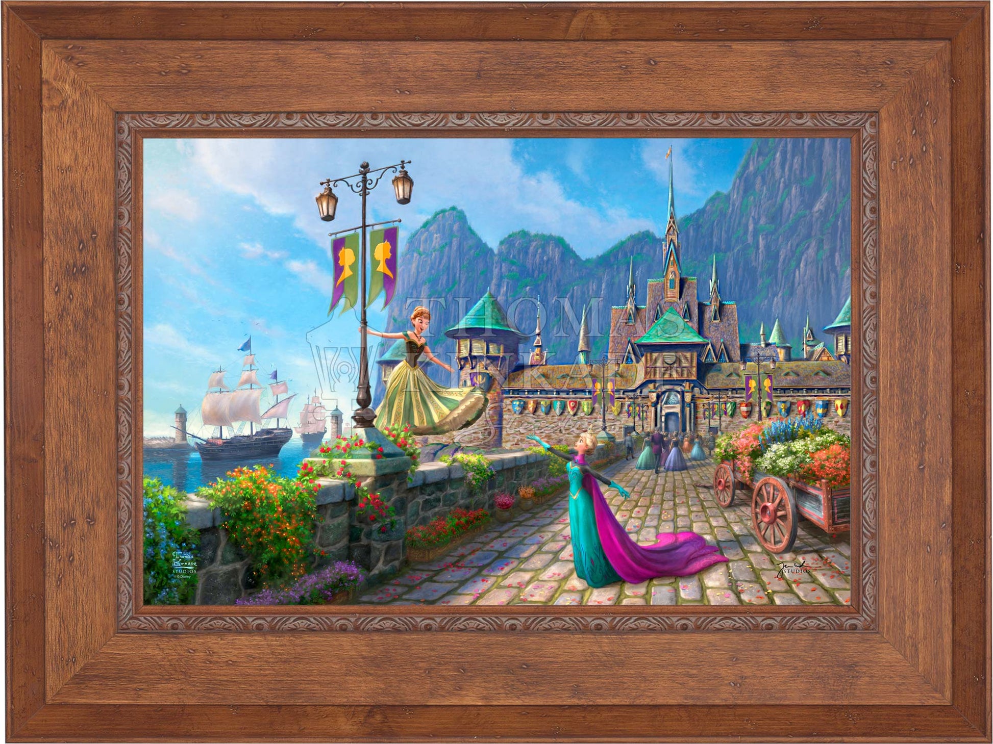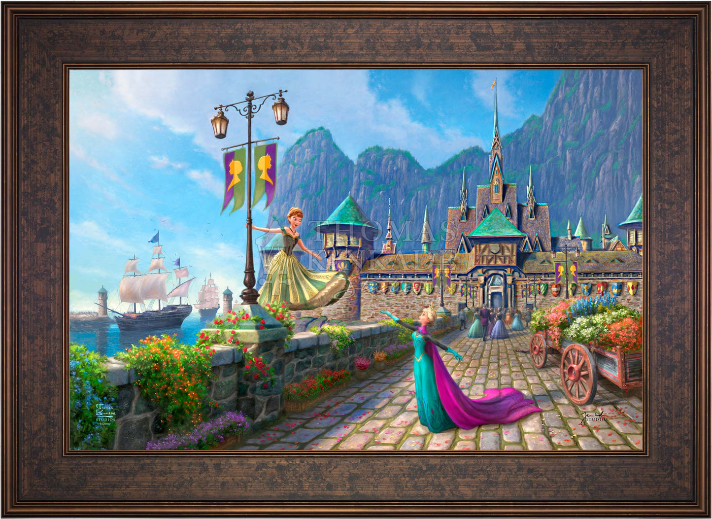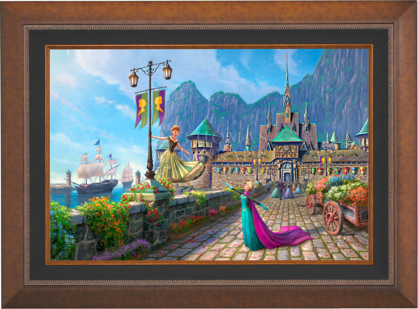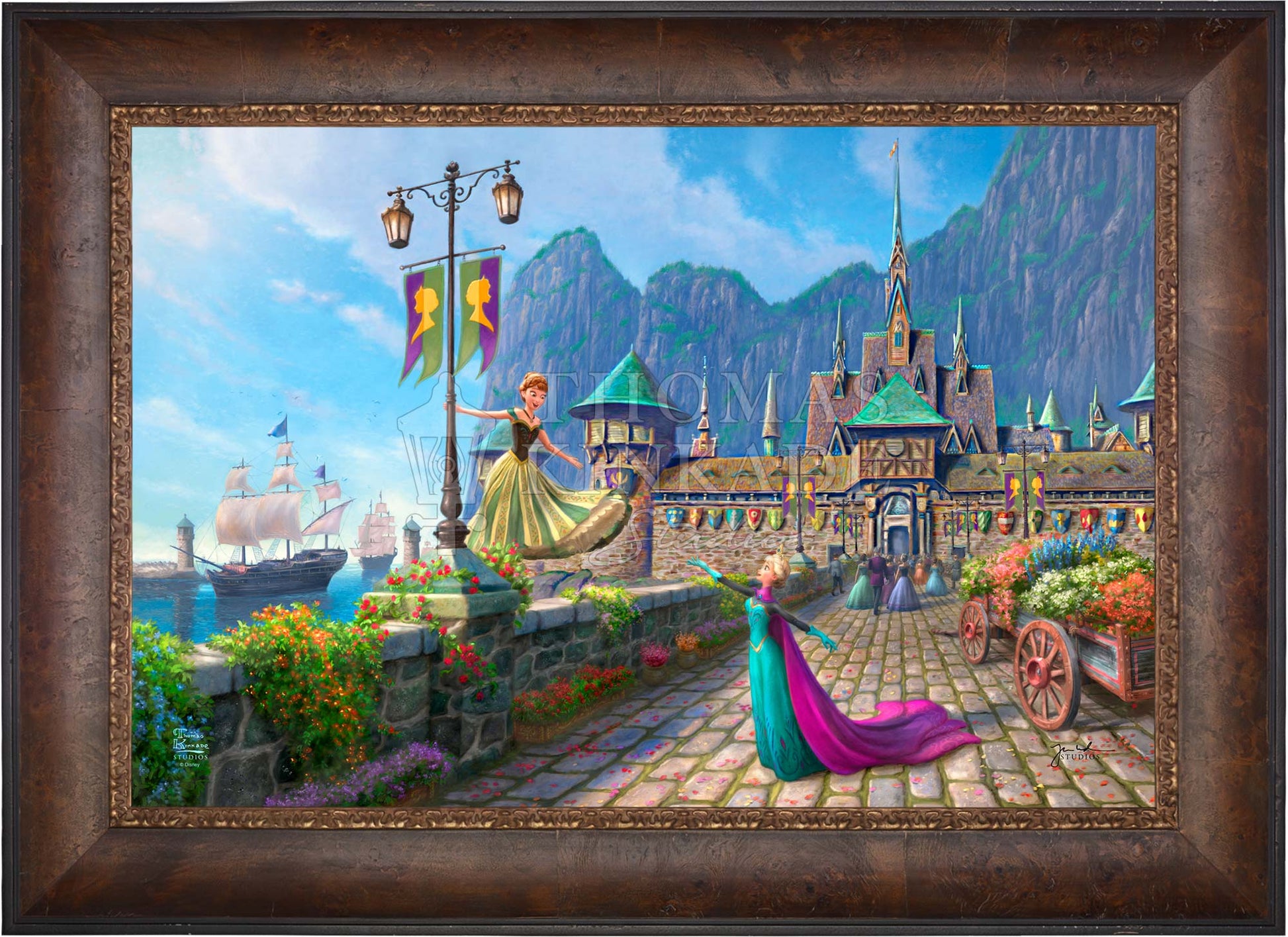 In Disney's Frozen , the kingdom of Arendelle had sadly lost their regents when the sailing vessel they were on sank in a ferocious storm. The country’s time of mourning has passed, and the kingdom of Arendelle has invited everyone, near and far, to join them in celebrating the coronation of the eldest daughter, Princess Elsa. A grand one-day fête has been planned, and the kingdom has been festooned with colorful flowers and flags. Thomas Kinkade Studios is pleased to present Disney Frozen Celebration in Arendelle .