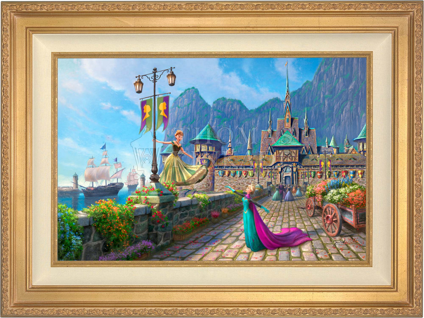 In Disney's Frozen, the kingdom of Arendelle had sadly lost their regents when the sailing vessel they were on sank in a ferocious storm. The country’s time of mourning has passed, and the kingdom of Arendelle has invited everyone, near and far, to join them in celebrating the coronation of the eldest daughter, Princess Elsa. A grand one-day fête has been planned, and the kingdom has been festooned with colorful flowers and flags. Thomas Kinkade Studios is pleased to present Disney Frozen Celebration in Arendelle.