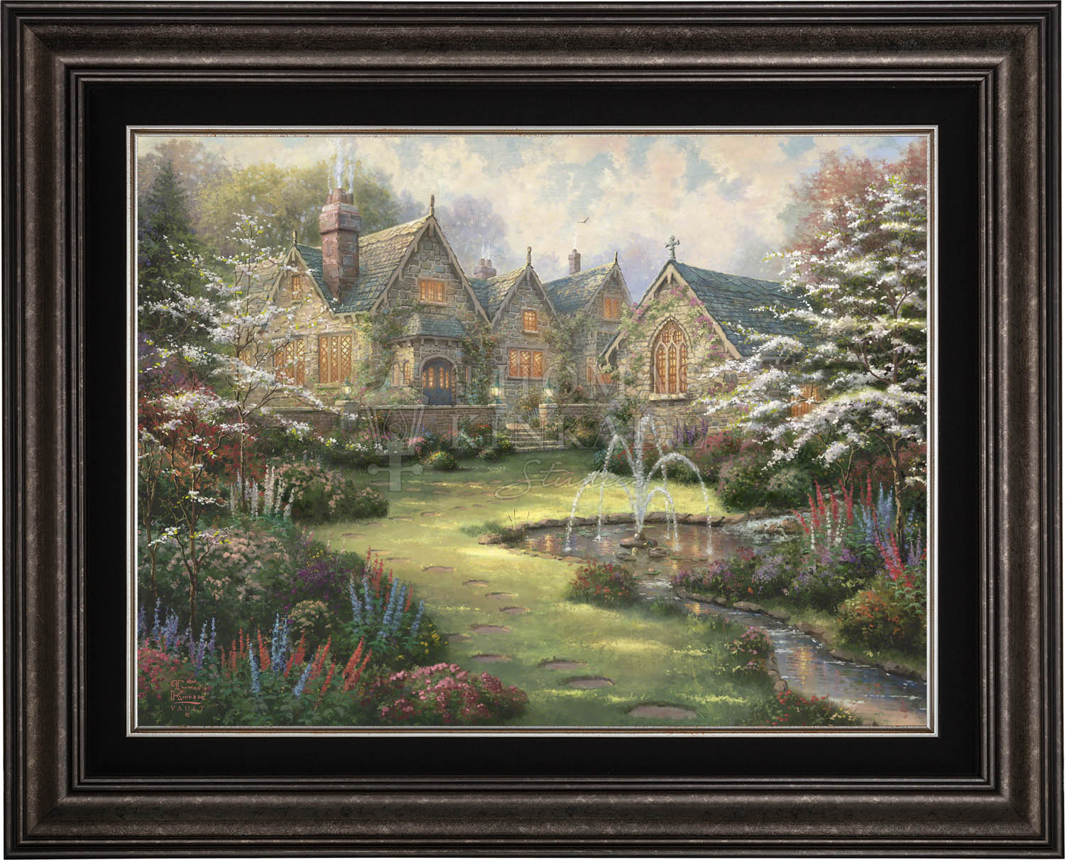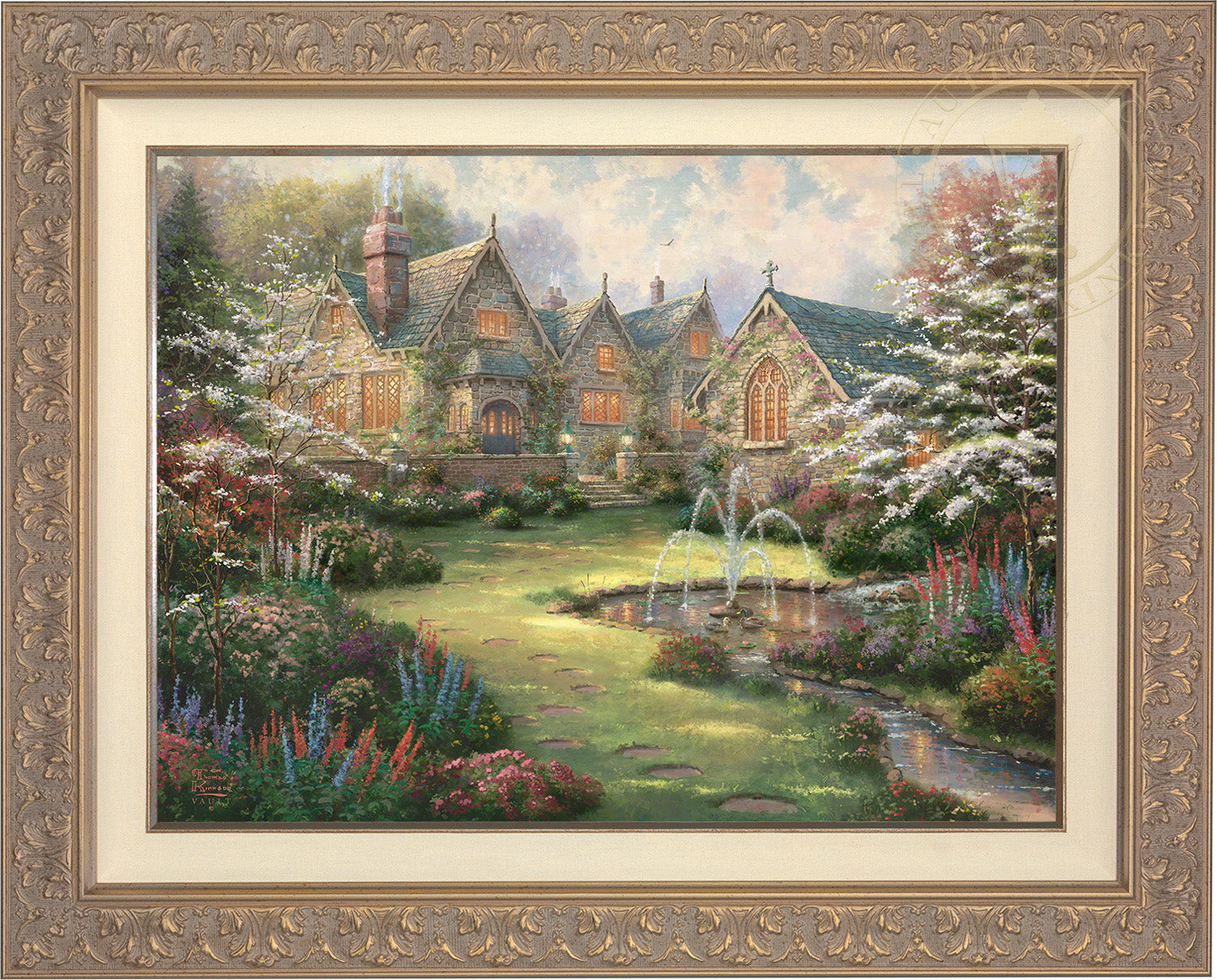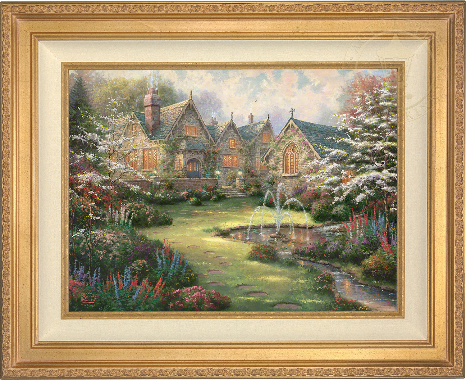 The English Manor House was a long-time favorite subject of Thomas Kinkade. He was charmed by the stateliness of the architecture and romanced by what he imagined life was like for the couple who lived there. The bright and glowing windows spoke of family and a loving togetherness that gave special meaning to the passing of each day. The flower gardens surrounding the manor are so lovingly cared for giving evidence to the nurturing hands that tend to the home. Thom loved traveling to England and with each trip he would return with a trove of ideas that he hoped to translate into a masterwork in oil. In addition to Thom’s travels, the inspiration behind his Mansions in Paradise series came from the Biblical verse, John 14:2, "in my Father’s house are many mansions