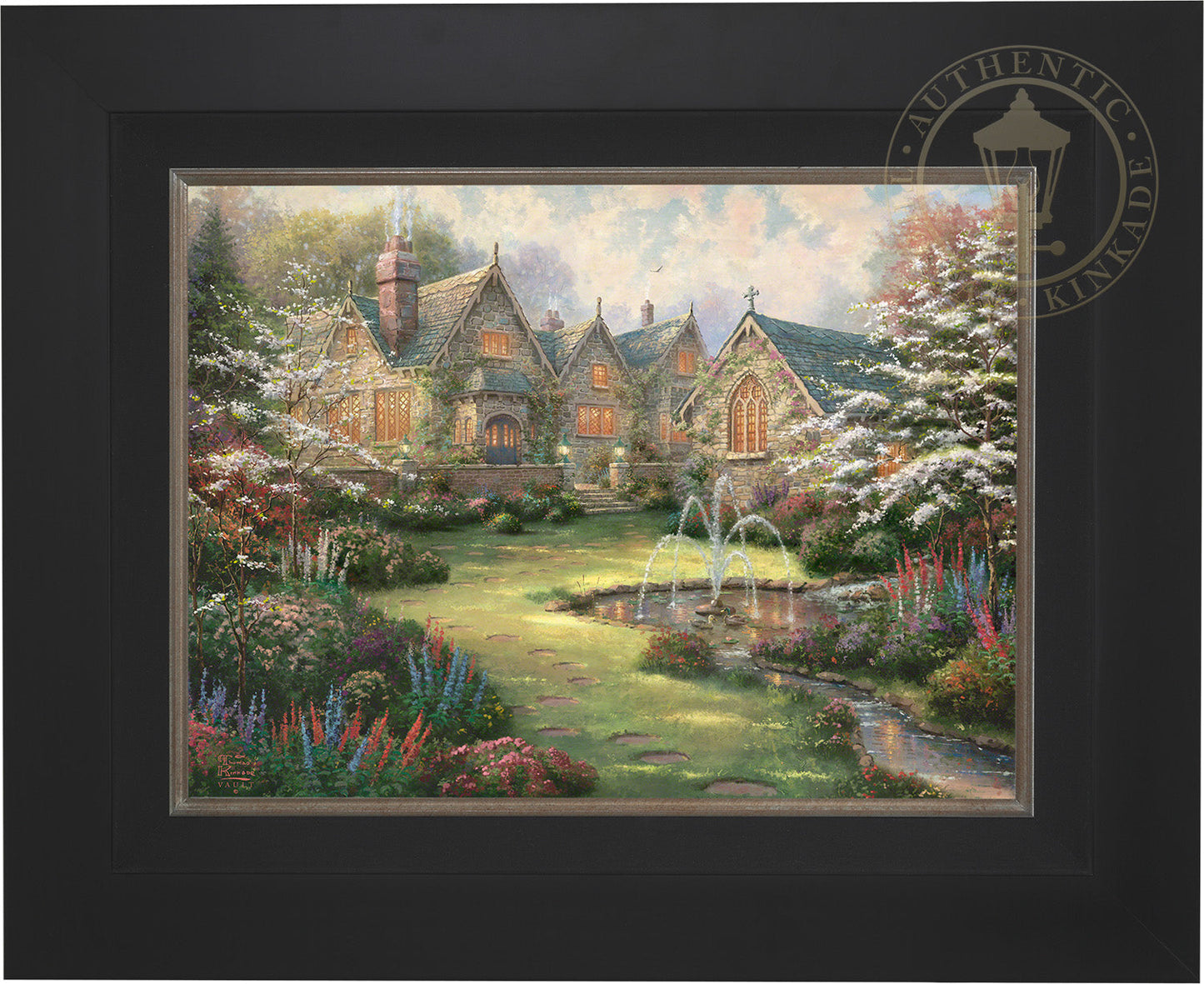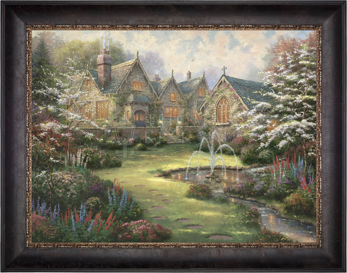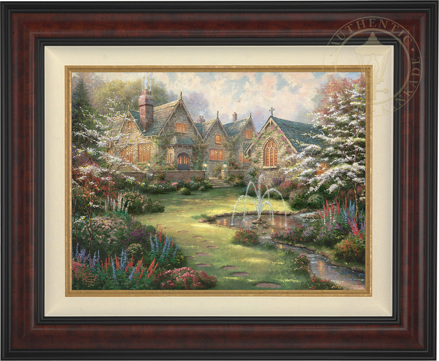 The English Manor House was a long-time favorite subject of Thomas Kinkade. He was charmed by the stateliness of the architecture and romanced by what he imagined life was like for the couple who lived there. The bright and glowing windows spoke of family and a loving togetherness that gave special meaning to the passing of each day. The flower gardens surrounding the manor are so lovingly cared for giving evidence to the nurturing hands that tend to the home. Thom loved traveling to England and with each trip he would return with a trove of ideas that he hoped to translate into a masterwork in oil. In addition to Thom’s travels, the inspiration behind his Mansions in Paradise series came from the Biblical verse, John 14:2, "in my Father’s house are many mansions
