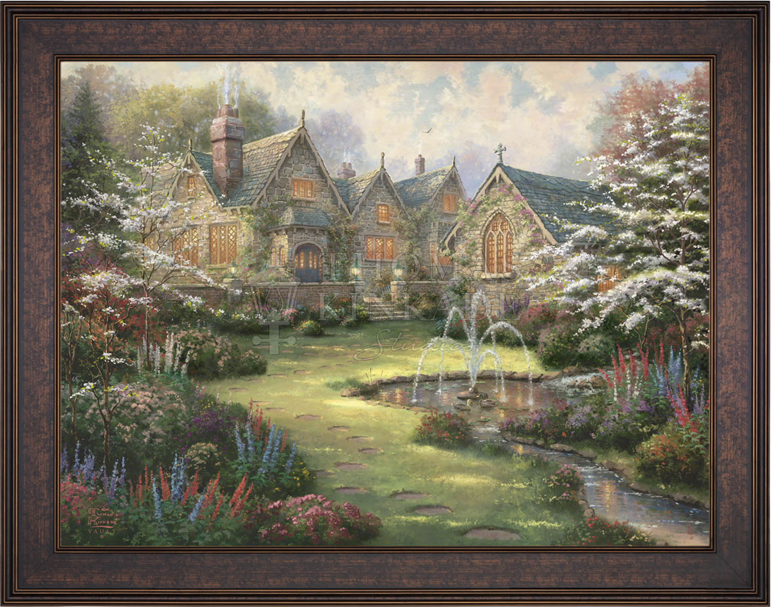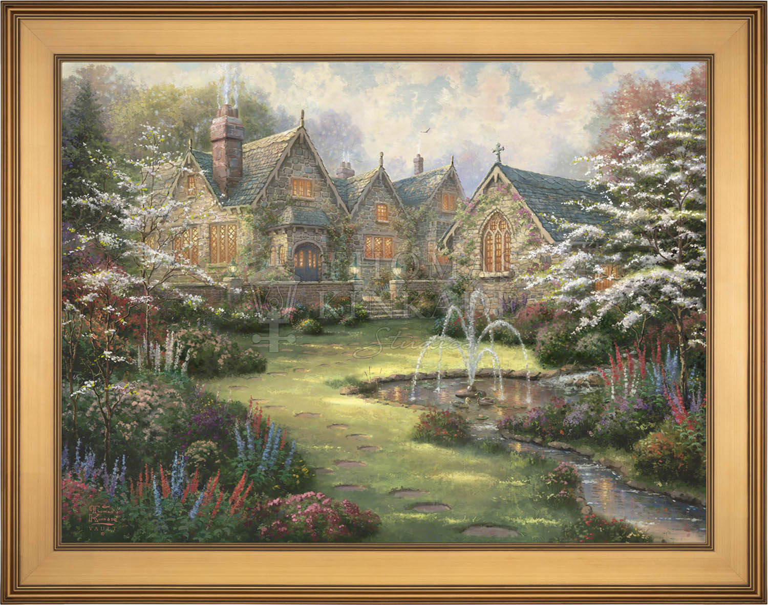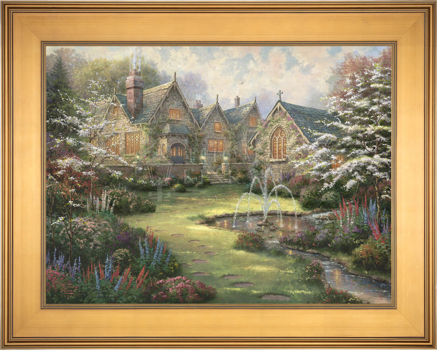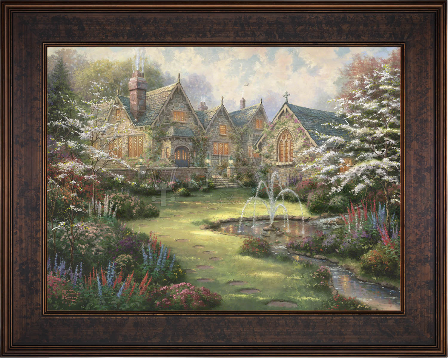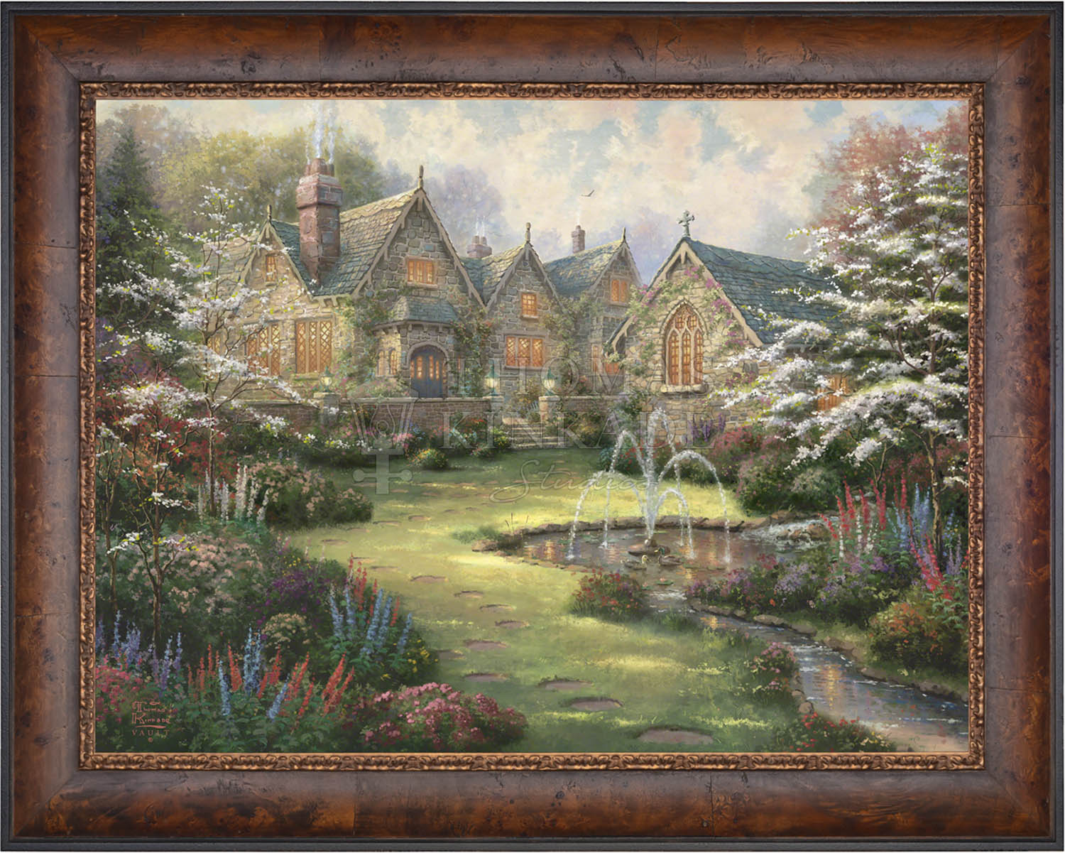Garden Manor , the second release in this series and a companion to Thom’s popular painting Lakeside Manor . One can almost smell the flowers and feel the brisk air as you allow your eyes to stroll up the grassy path to the inviting door of this exquisite home. The splashing of the water from the fountain entertains your ear while the anticipation grows for the glorious gathering of family and friends waiting just beyond the threshold. Join us at Garden Manor and celebrate life as God intended, serenely happy and wrapped in the comforting surroundings of a life well lived.