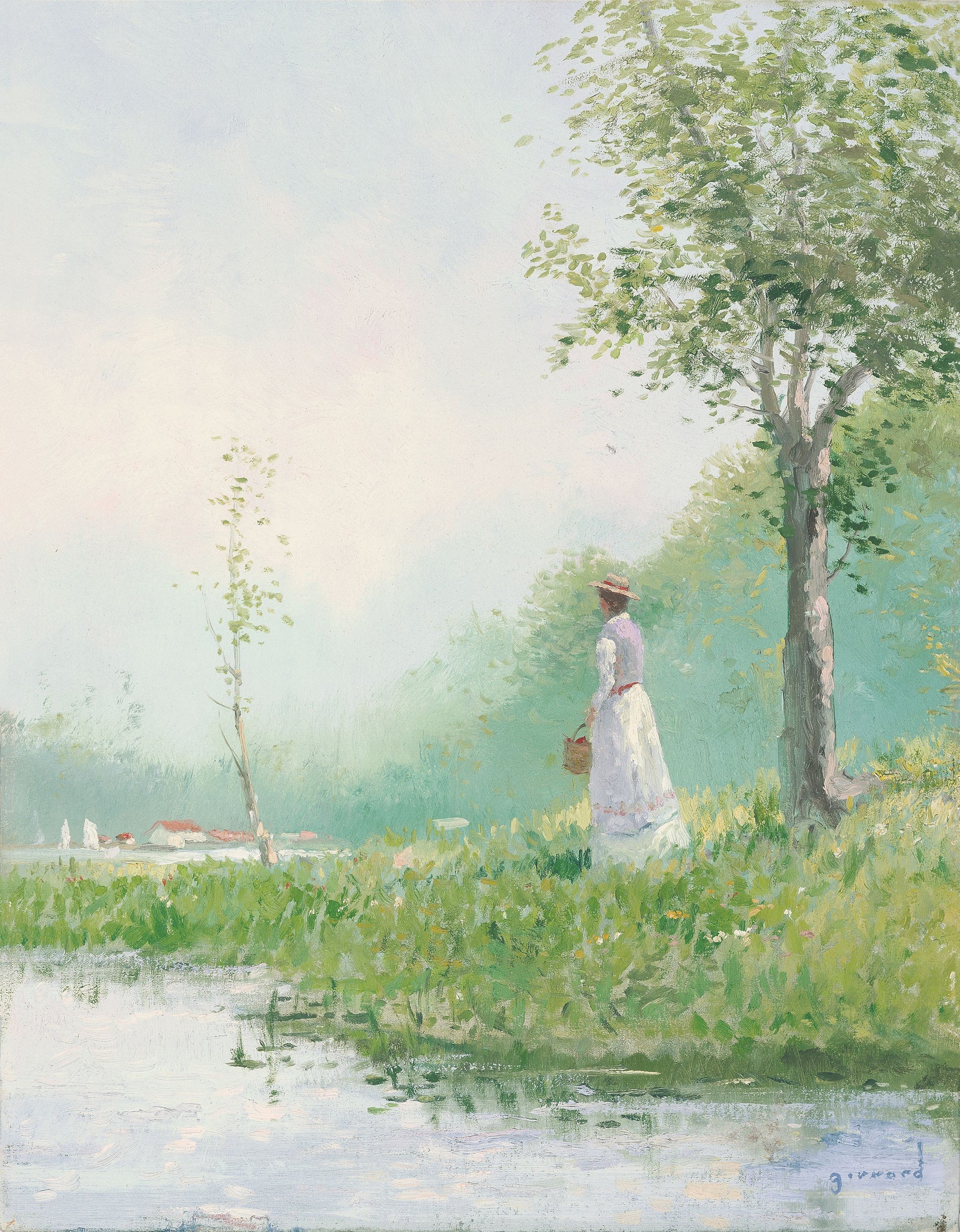 Call UsGazing takes us to just such an exquisite French vista as inspired the original Impressionists. A lithe, graceful young lady, dressed in white and wearing a bonnet, gazes out across a glittering lake toward a distant village. She stands under a single, slender tree, entirely absorbed in the scene that captures her gaze. The mood is one of breathless anticipation. It is not only the girl who holds her breath in order to enter into the perfect tranquility of the moment; it is us as well. As she gazes at far horizons, we, in turn, gaze at her, hoping to join in her beautiful world. \n \n-Thomas Kinkade \n \nLimited Edition Canvas \nThomas Kinkade Limited Edition Canvases combine old world craftsmanship with the finest materials and latest production technologies to produce extraordinary canvas artwork. Our reproduction process captures not only the color and mood of the enchanting original painting but the actual brushwork as well. Every piece is hand-retouched by skilled artisans, giving the painting a look almost identical to the artist’s on-easel original. Vibrant colors, rich textures and color tones are the hallmarks of your finished piece. \n \nFeatures \n