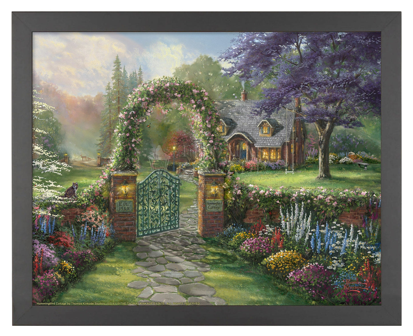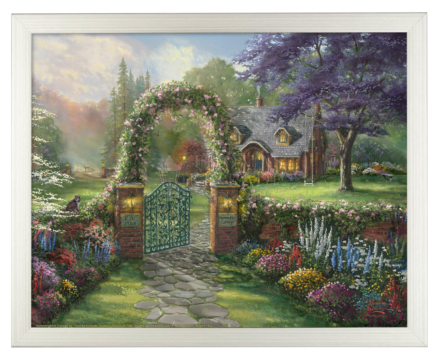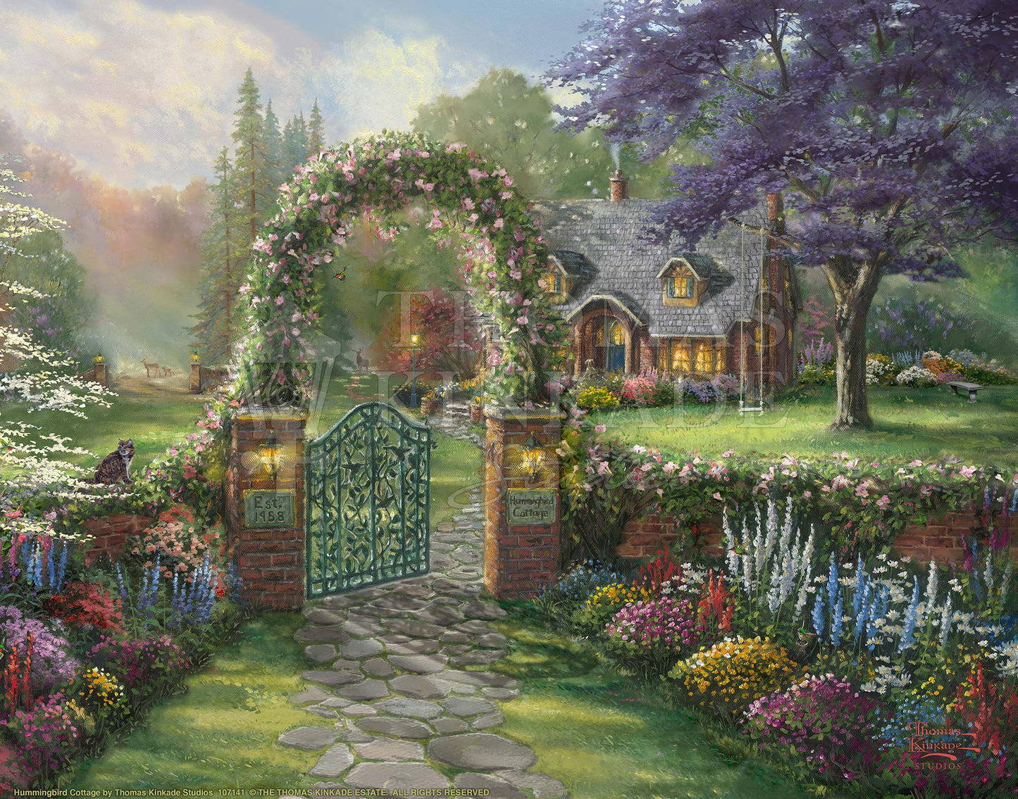 “Hummingbirds are small angels of fleeting joy” If you stroll down Hummingbird Lane on a quiet day, you may encounter the charm of hummingbirds enjoying the sweet nectar of garden flowers. The softness of the pink trumpet vines and the rainbow of colors are a kaleidoscope that draws not just the sweet hummingbirds, but a variety of other delightful characters, to the gardens. Thomas Kinkade Studios presents Hummingbird Cottage,