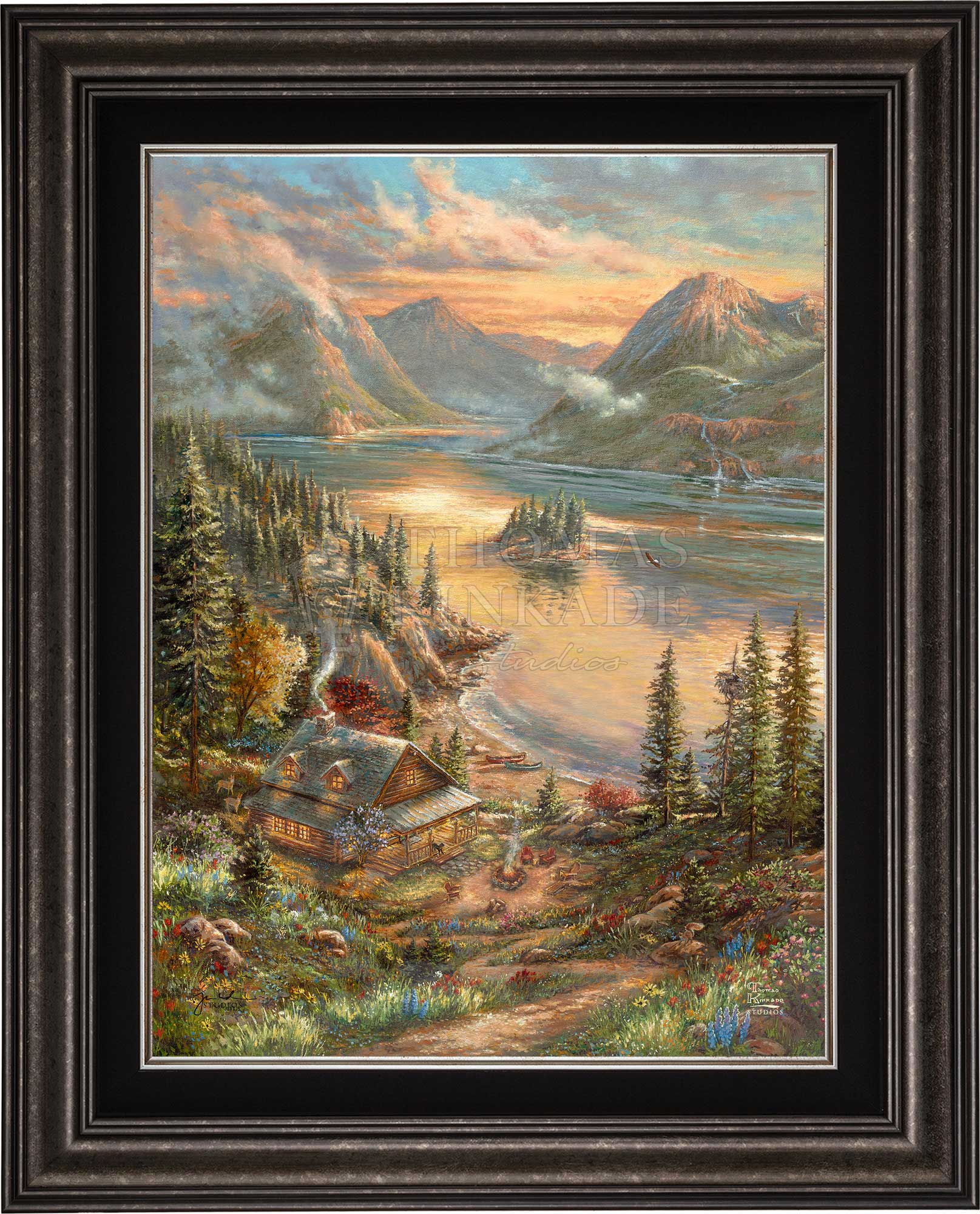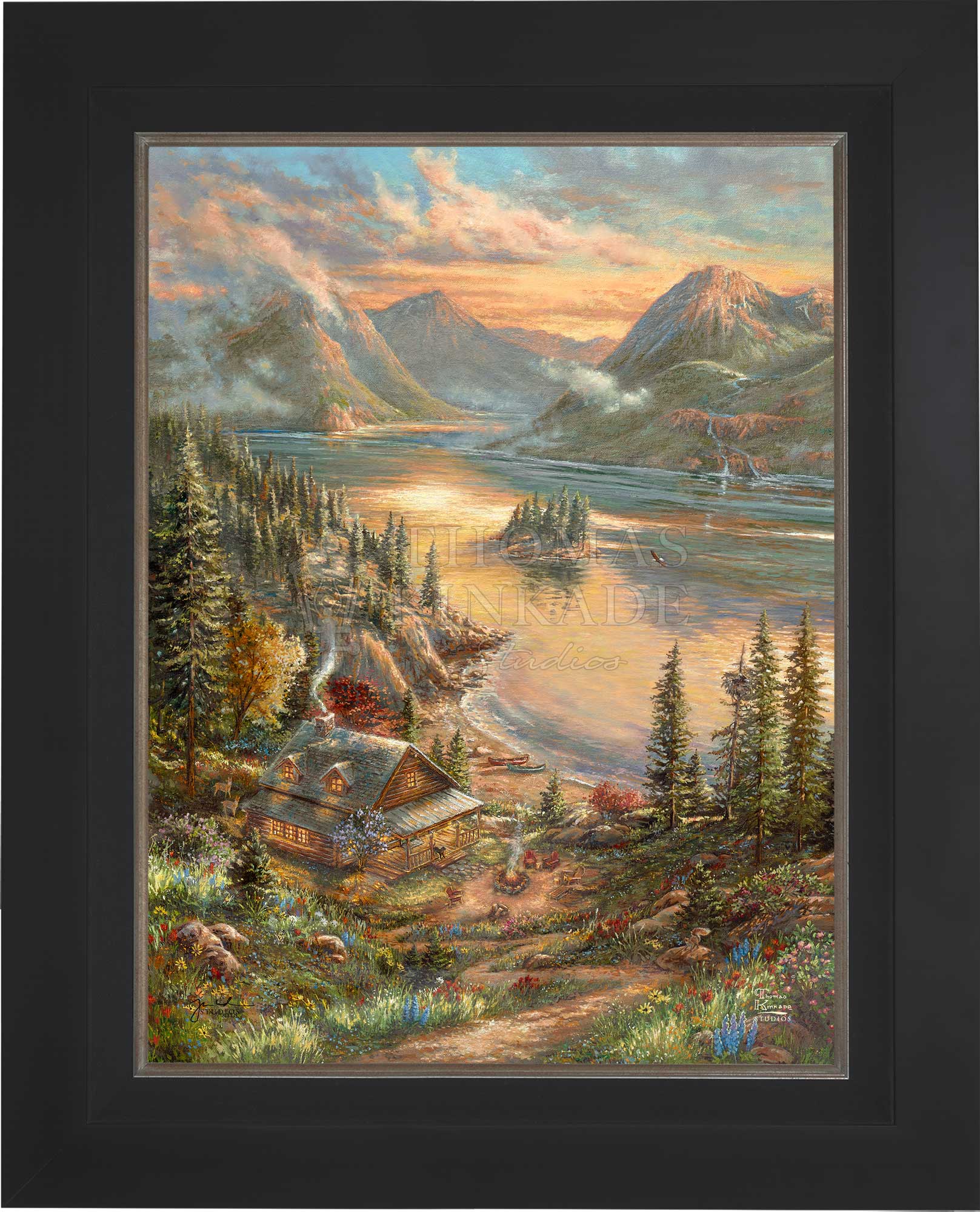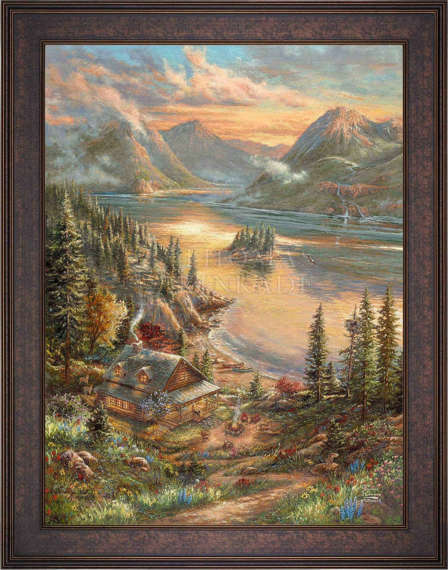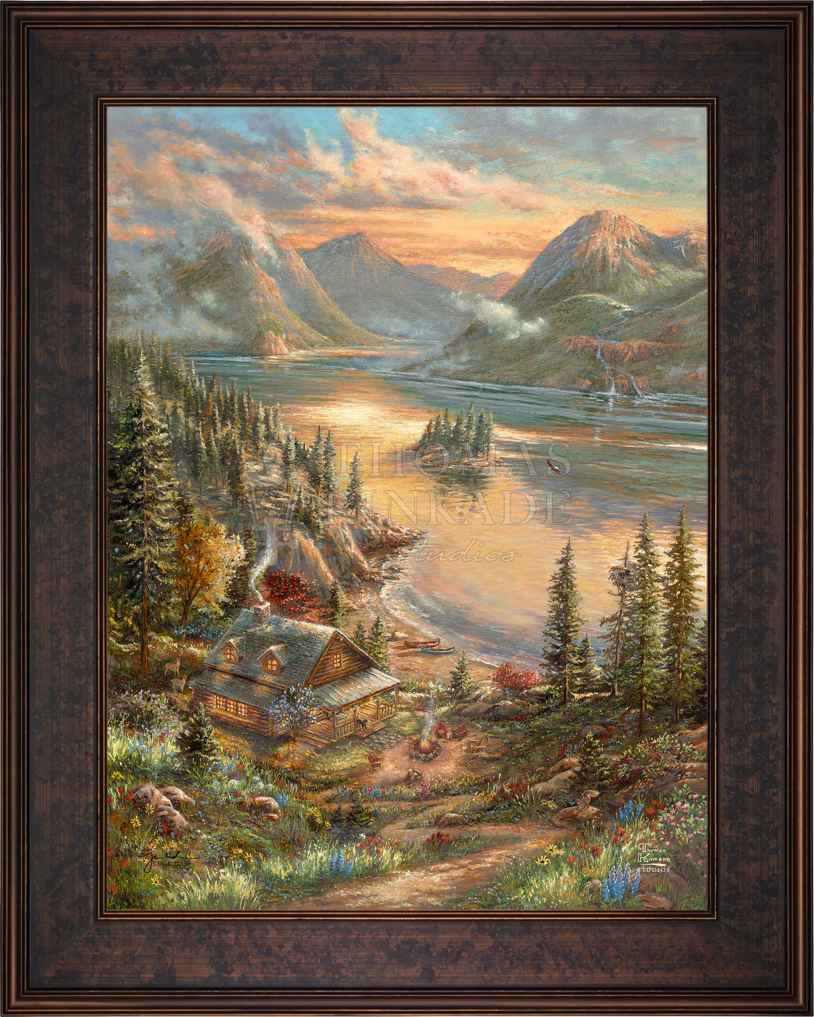 What constitutes living “the good life?” For some, it is living near the ocean, enjoying the relaxation of life at the beach. To others, it’s traveling around the world, exploring its wonders. For Thomas Kinkade, the good life was time spent at a cozy cabin near a tranquil lake nestled at the base of a mountain. Lakeside Splendor by Thomas Kinkade Studios captures his experience and that of so many who love nature.