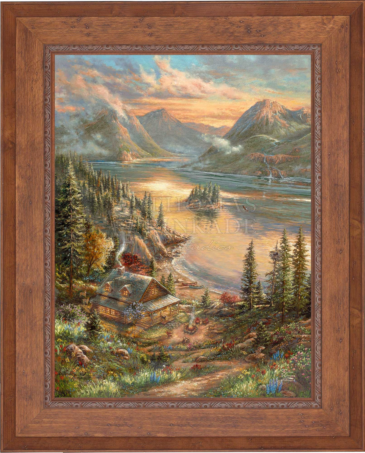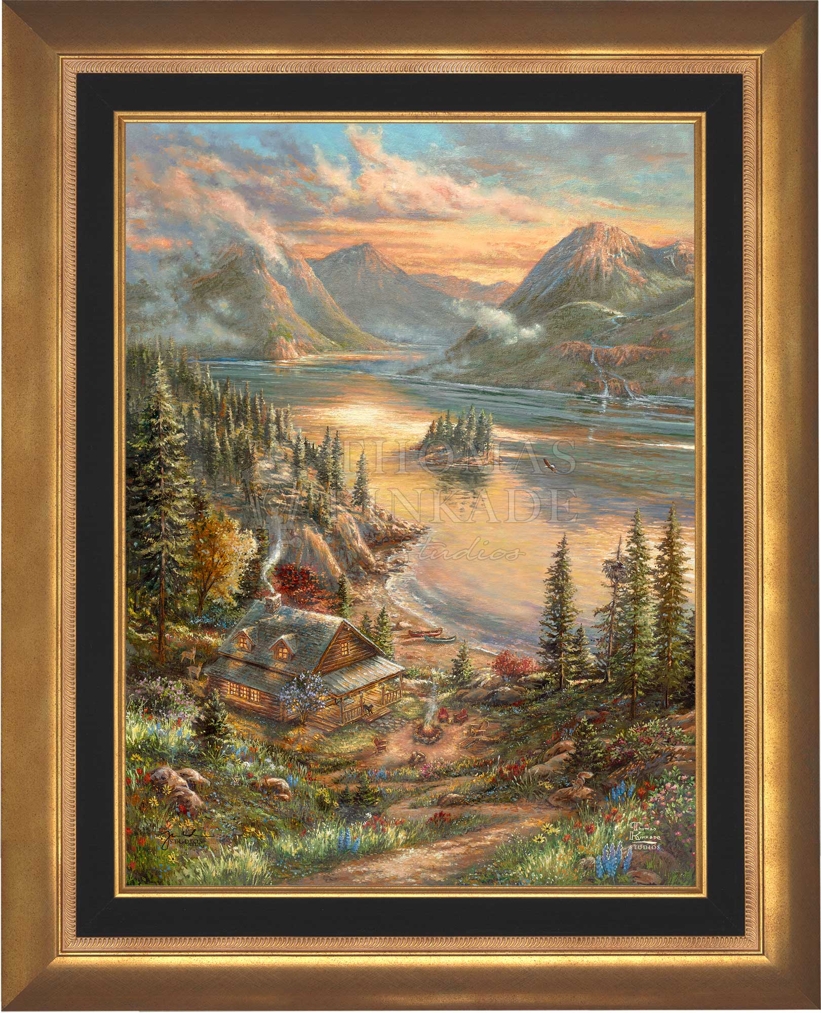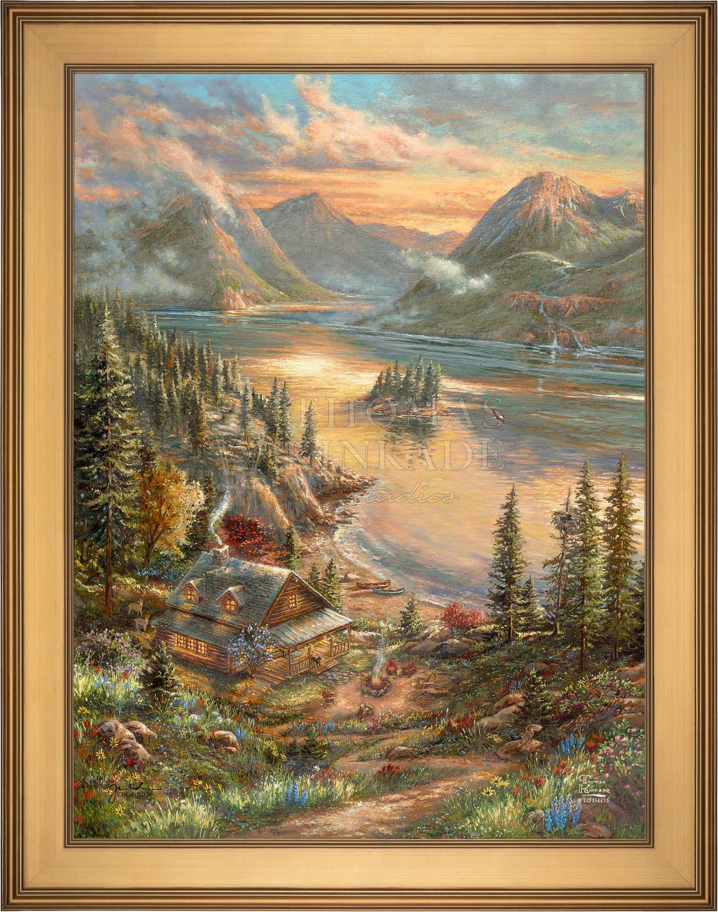 What constitutes living “the good life?” For some, it is living near the ocean, enjoying the relaxation of life at the beach. To others, it’s traveling around the world, exploring its wonders. For Thomas Kinkade, the good life was time spent at a cozy cabin near a tranquil lake nestled at the base of a mountain. Lakeside Splendor by Thomas Kinkade Studios captures his experience and that of so many who love nature.
