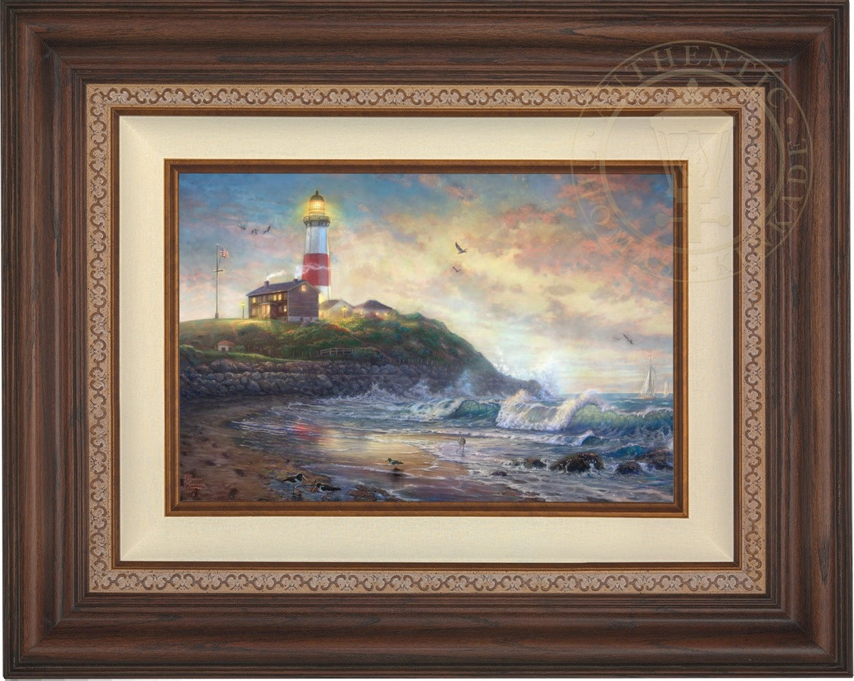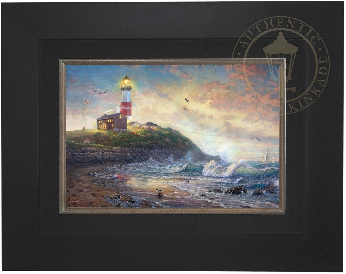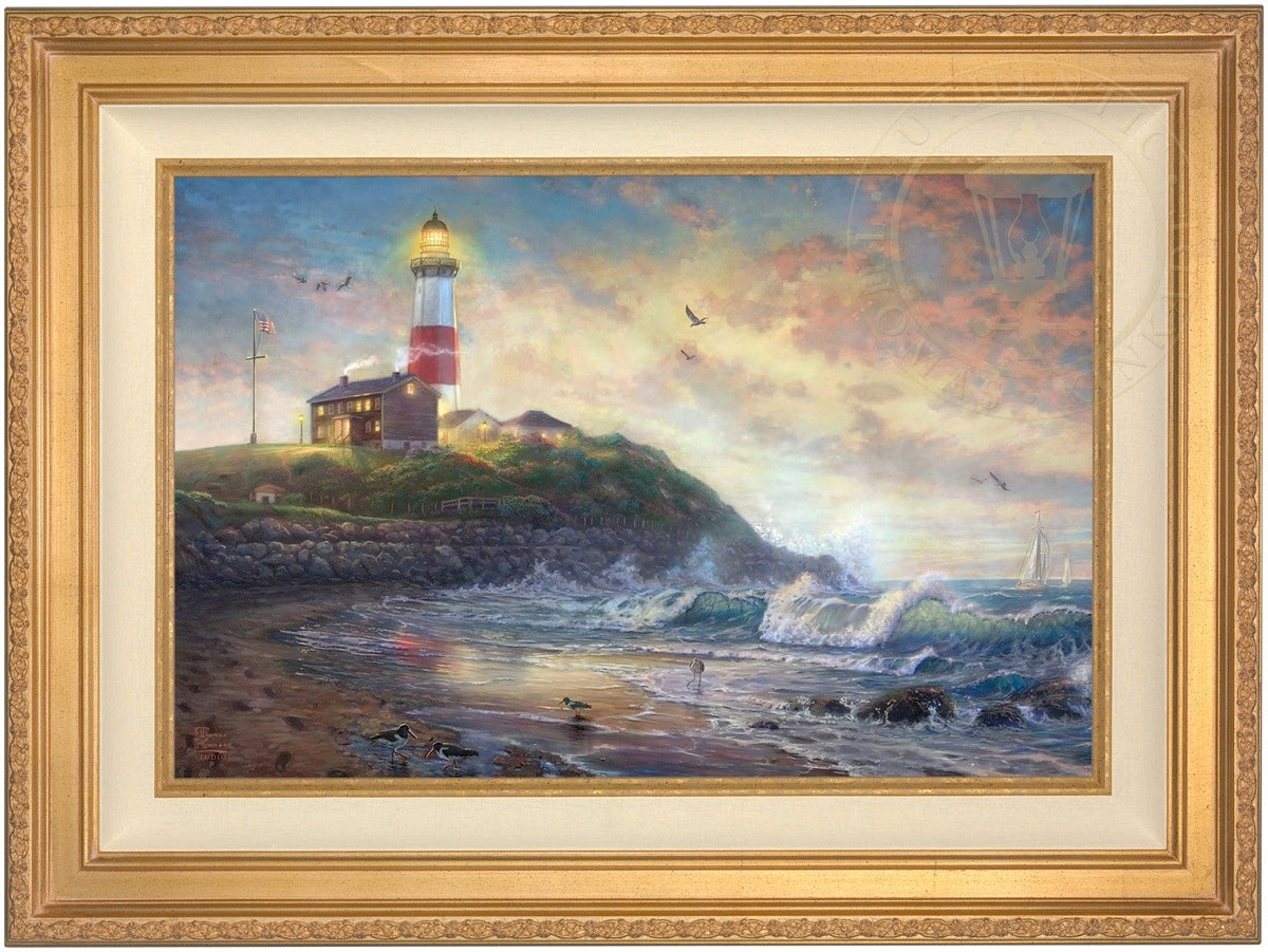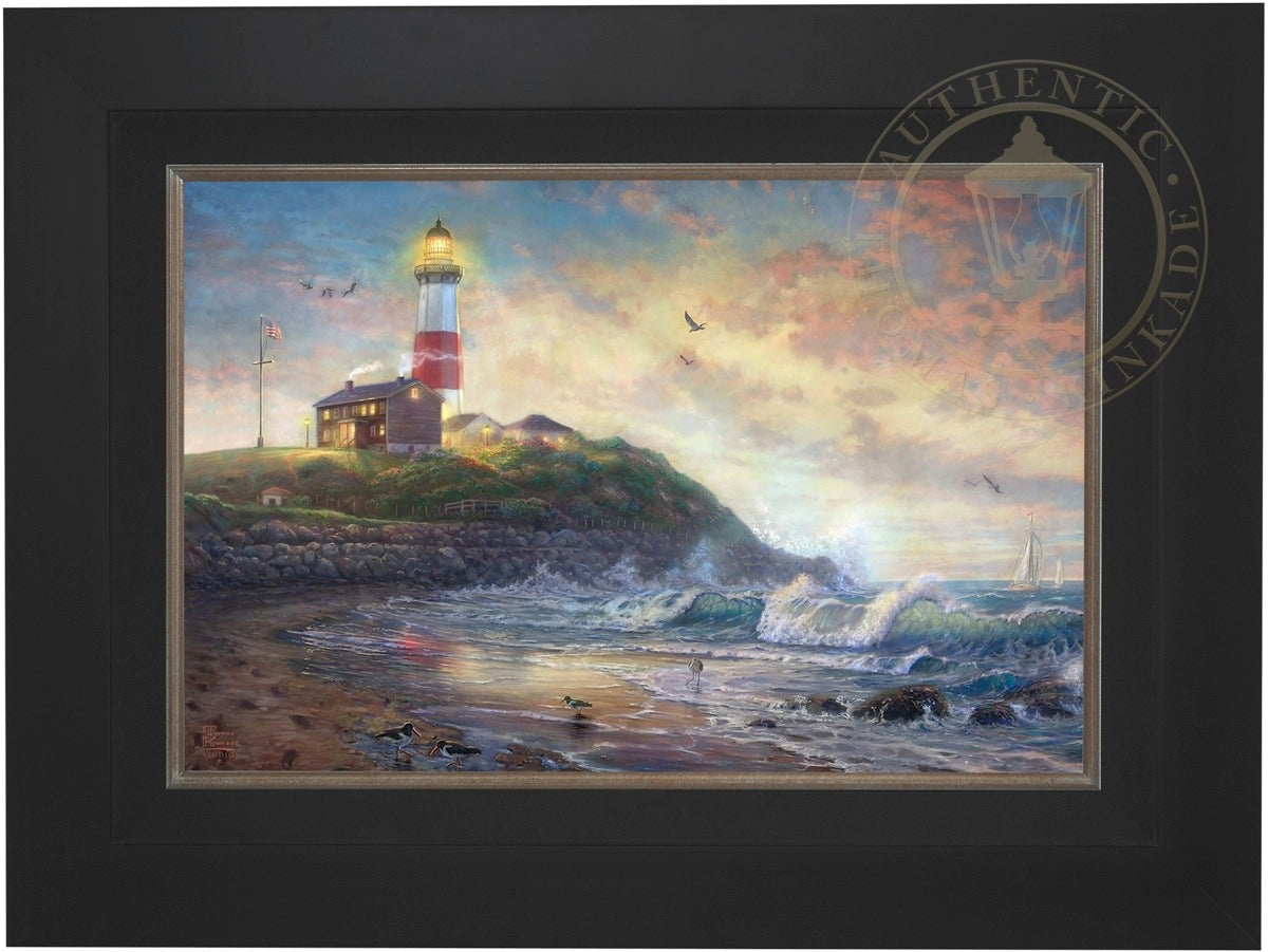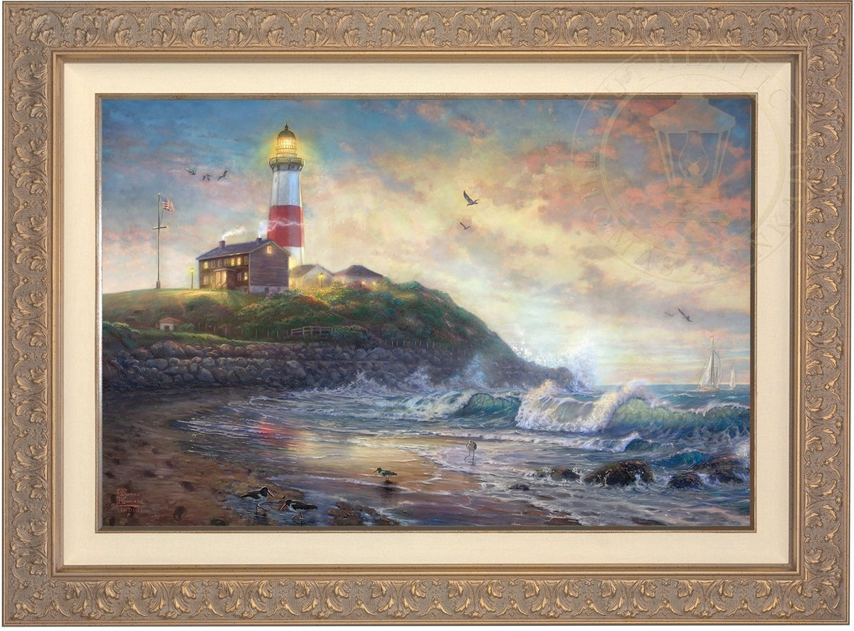 The lighthouse is a powerful symbol that has been consistently used in the artwork of Thomas Kinkade. In practical definition these structures are beacons built to safely steer ships and their crew clear of danger during raging storms or in the darkness of night. As the spiritual metaphor so often used by Thom, a lighthouse can be thought of as a guidepost in life, one operating in the face of personal trials and tribulations. And, whether perceived as coming from a friend advising us on our journey or from the Lord giving guidance to our lives, the message of the lighthouse is always the same. "I am here," it proclaims, "and you are not alone." We can all take comfort in that simple realization; knowing that even in our darkest hour or most savage life-storm, a light will always be there, shining forth, to show a way to safe harbor. In Light of Hope this classic Kinkade theme is reverently brought to life by the Thomas Kinkade Studios and in the greatest tradition of the artist himself. The evening sky is ablaze as the day's last light shines through the ocean's waves and shimmers across the flowered cape that hosts this silent sentinel. From all of us in the Thomas Kinkade Studios, we hope you enjoy Light of Hope !