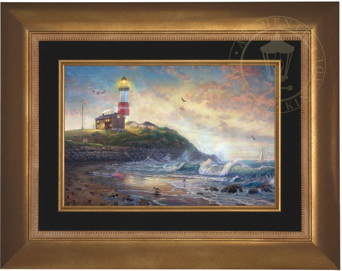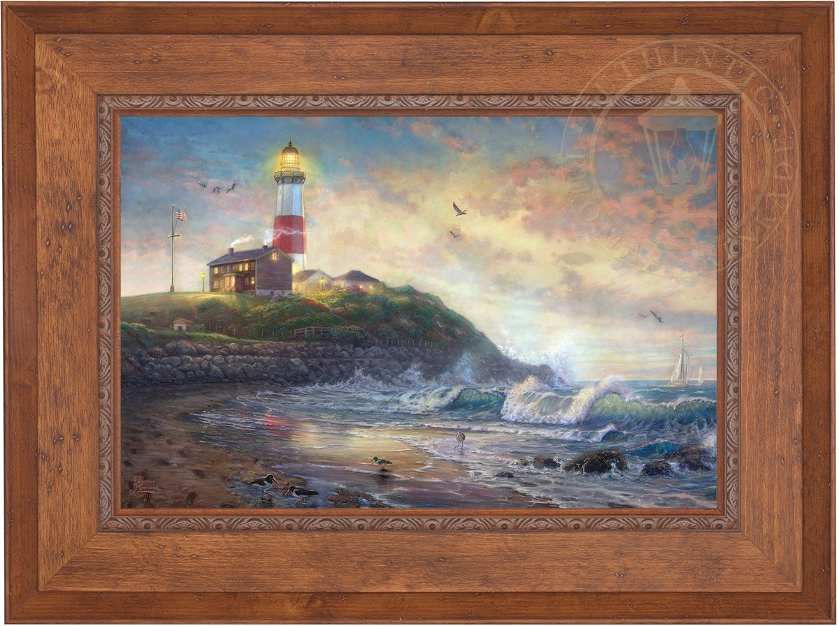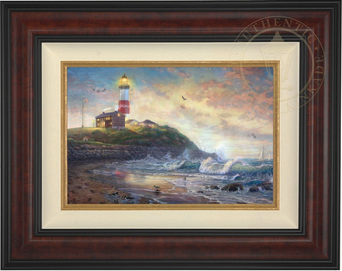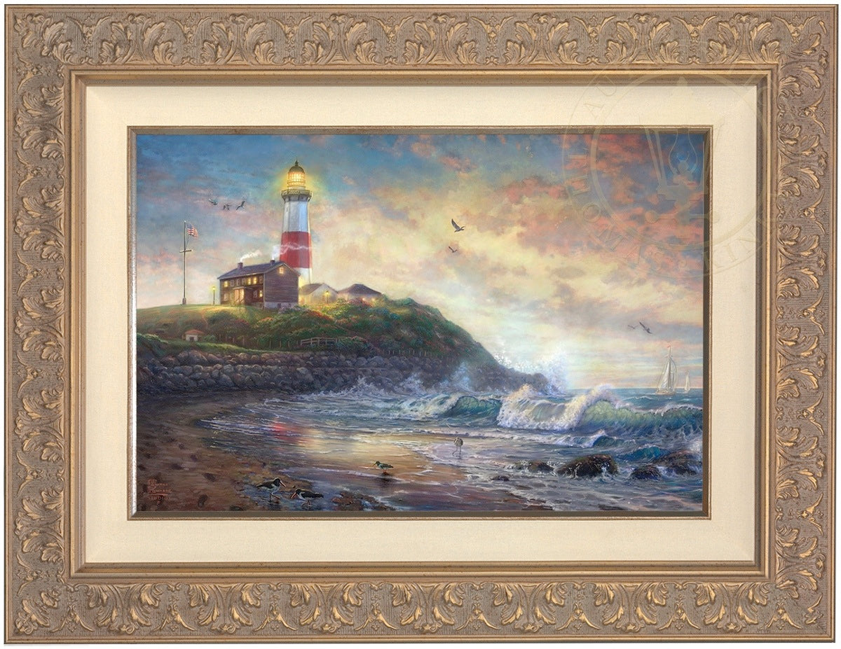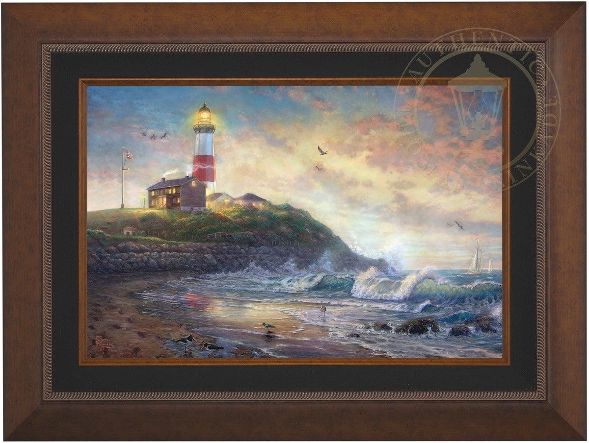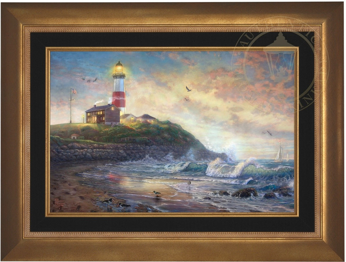 The lighthouse is a powerful symbol that has been consistently used in the artwork of Thomas Kinkade. In practical definition these structures are beacons built to safely steer ships and their crew clear of danger during raging storms or in the darkness of night. As the spiritual metaphor so often used by Thom, a lighthouse can be thought of as a guidepost in life, one operating in the face of personal trials and tribulations. And, whether perceived as coming from a friend advising us on our journey or from the Lord giving guidance to our lives, the message of the lighthouse is always the same. "I am here," it proclaims, "and you are not alone." We can all take comfort in that simple realization; knowing that even in our darkest hour or most savage life-storm, a light will always be there, shining forth, to show a way to safe harbor. In Light of Hope this classic Kinkade theme is reverently brought to life by the Thomas Kinkade Studios and in the greatest tradition of the artist himself. The evening sky is ablaze as the day's last light shines through the ocean's waves and shimmers across the flowered cape that hosts this silent sentinel. From all of us in the Thomas Kinkade Studios, we hope you enjoy Light of Hope !