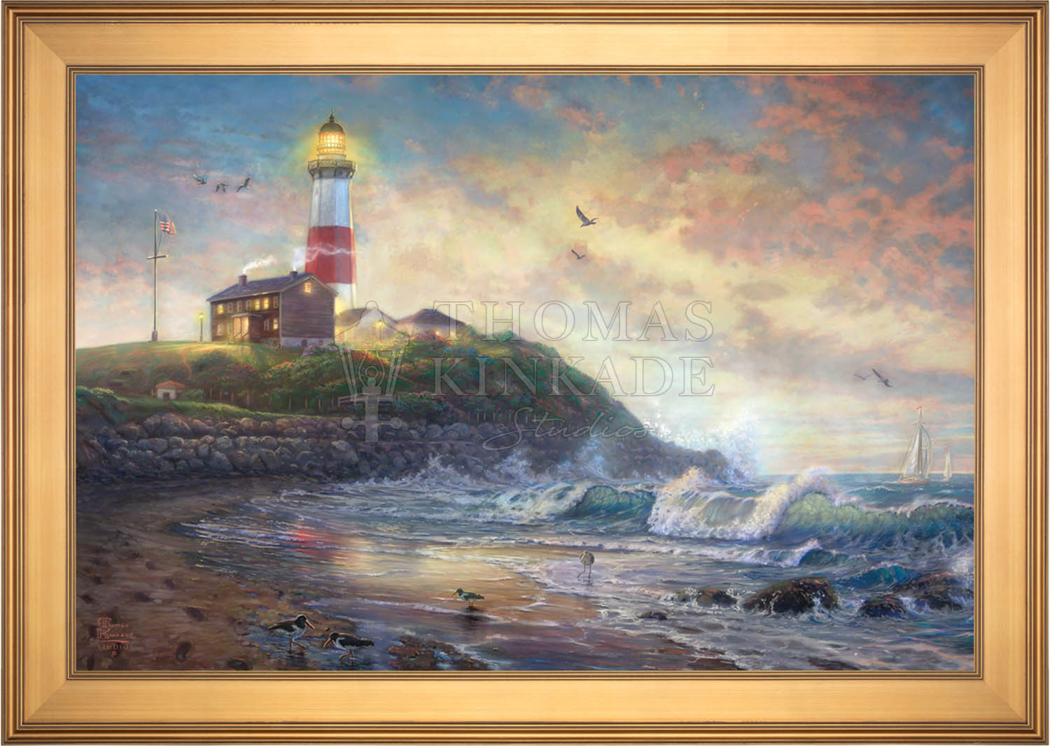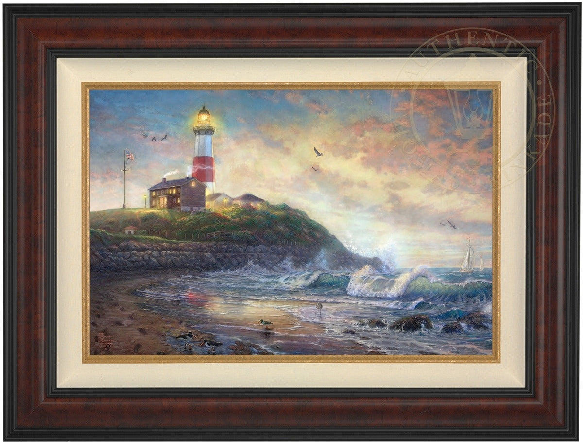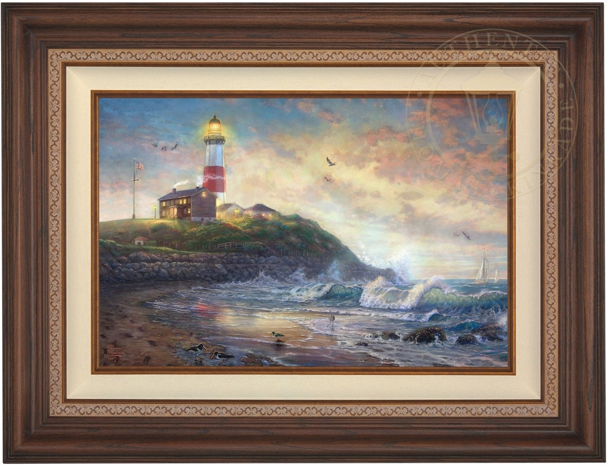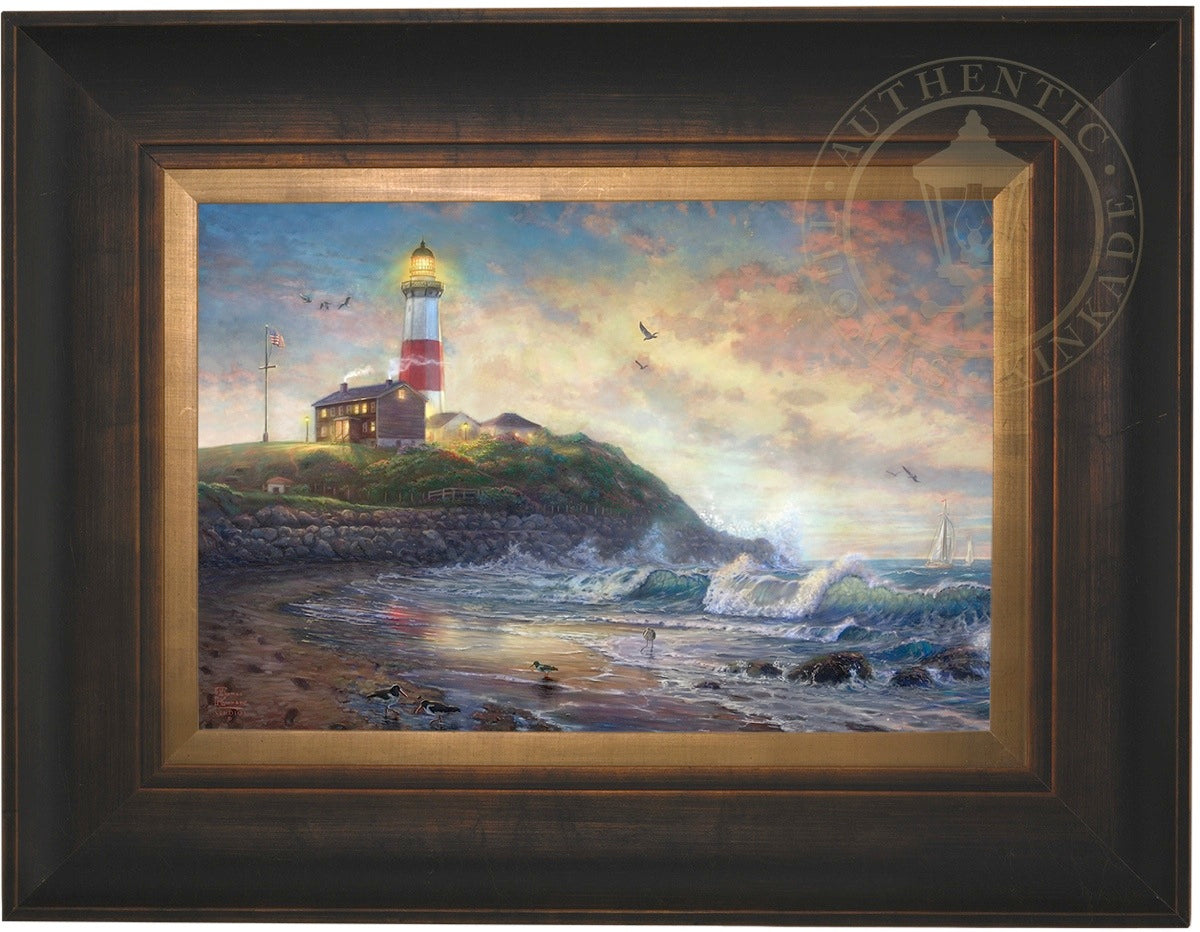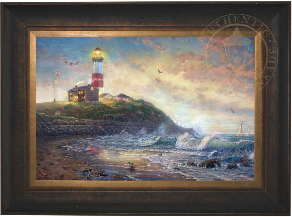 The lighthouse is a powerful symbol that has been consistently used in the artwork of Thomas Kinkade. In practical definition these structures are beacons built to safely steer ships and their crew clear of danger during raging storms or in the darkness of night. As the spiritual metaphor so often used by Thom, a lighthouse can be thought of as a guidepost in life, one operating in the face of personal trials and tribulations. And, whether perceived as coming from a friend advising us on our journey or from the Lord giving guidance to our lives, the message of the lighthouse is always the same. "I am here," it proclaims, "and you are not alone." We can all take comfort in that simple realization; knowing that even in our darkest hour or most savage life-storm, a light will always be there, shining forth, to show a way to safe harbor. In Light of Hope this classic Kinkade theme is reverently brought to life by the Thomas Kinkade Studios and in the greatest tradition of the artist himself. The evening sky is ablaze as the day's last light shines through the ocean's waves and shimmers across the flowered cape that hosts this silent sentinel. From all of us in the Thomas Kinkade Studios, we hope you enjoy Light of Hope !