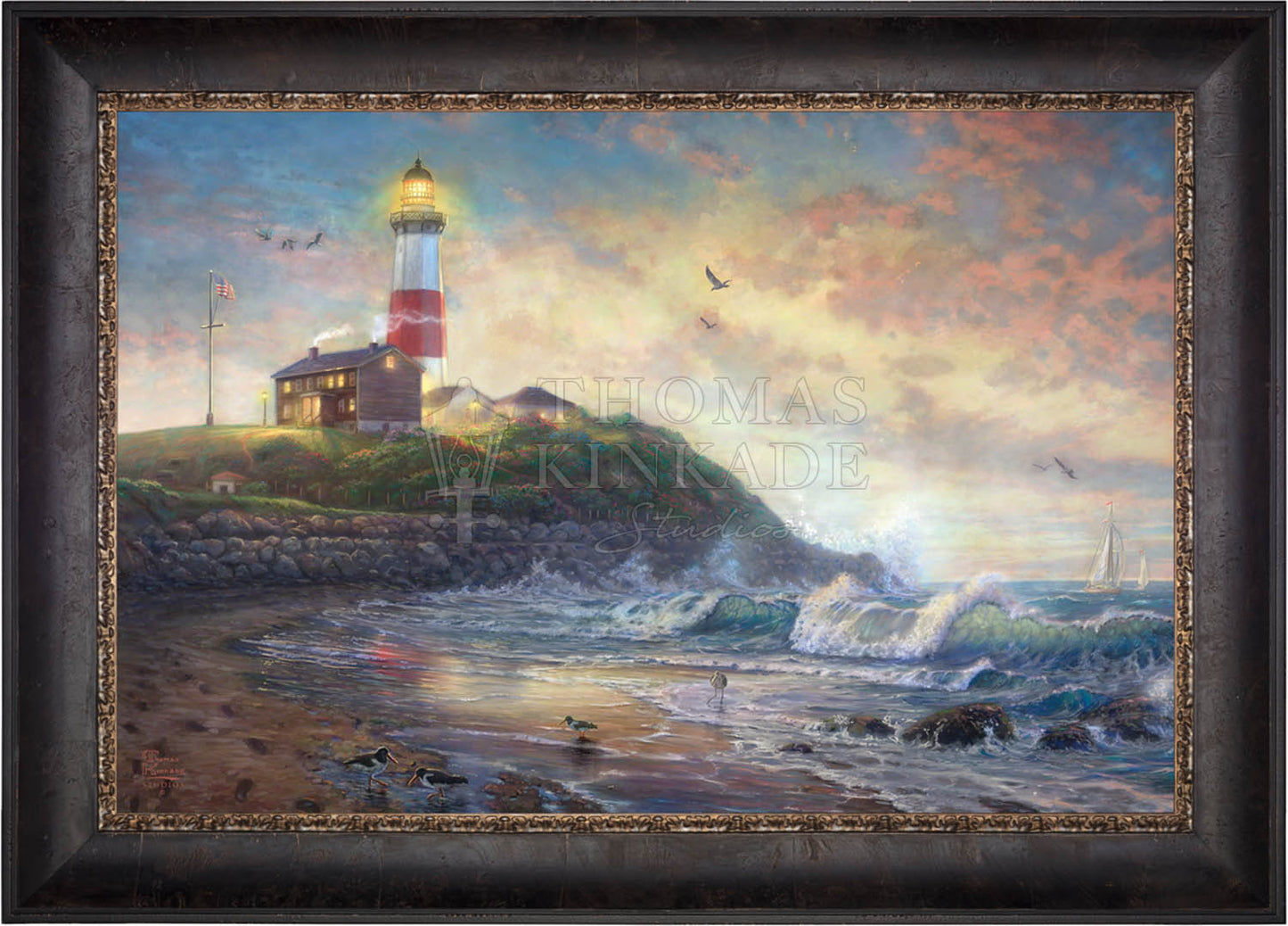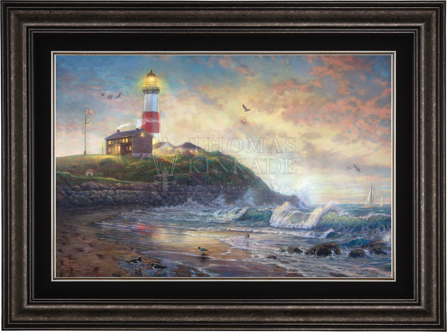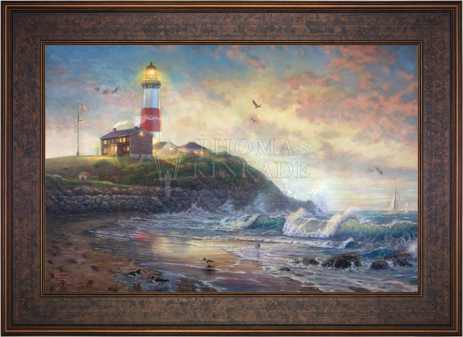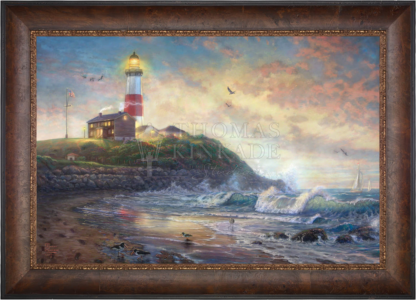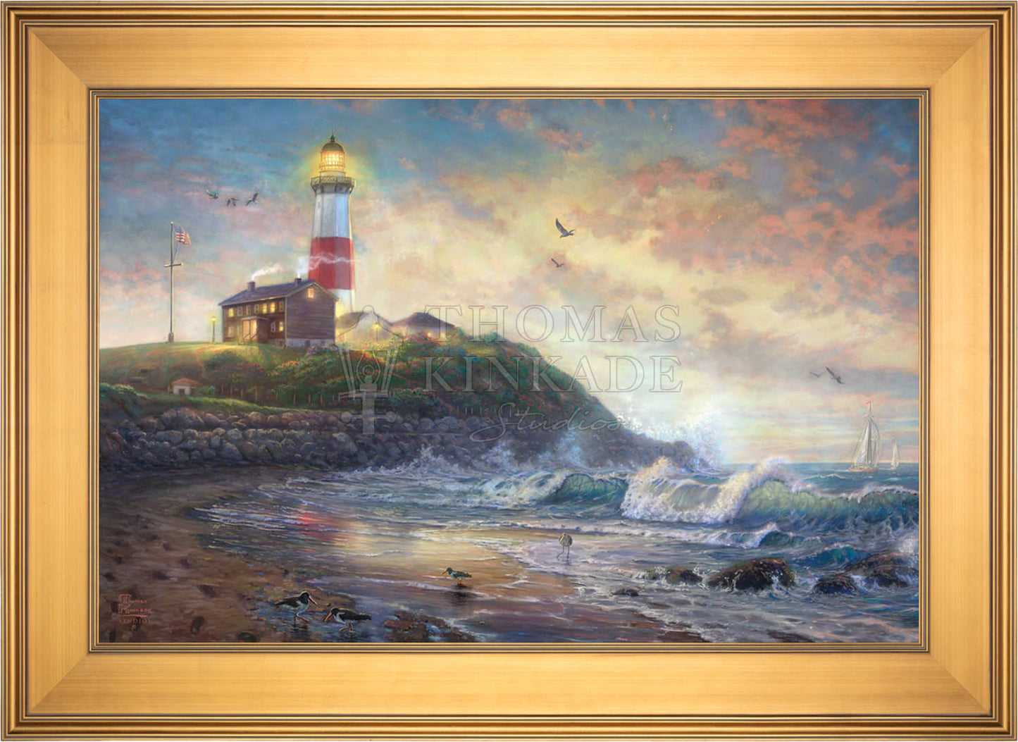 The lighthouse is a powerful symbol that has been consistently used in the artwork of Thomas Kinkade. In practical definition these structures are beacons built to safely steer ships and their crew clear of danger during raging storms or in the darkness of night. As the spiritual metaphor so often used by Thom, a lighthouse can be thought of as a guidepost in life, one operating in the face of personal trials and tribulations. And, whether perceived as coming from a friend advising us on our journey or from the Lord giving guidance to our lives, the message of the lighthouse is always the same. "I am here," it proclaims, "and you are not alone." We can all take comfort in that simple realization; knowing that even in our darkest hour or most savage life-storm, a light will always be there, shining forth, to show a way to safe harbor. In Light of Hope this classic Kinkade theme is reverently brought to life by the Thomas Kinkade Studios and in the greatest tradition of the artist himself. The evening sky is ablaze as the day's last light shines through the ocean's waves and shimmers across the flowered cape that hosts this silent sentinel. From all of us in the Thomas Kinkade Studios, we hope you enjoy Light of Hope !