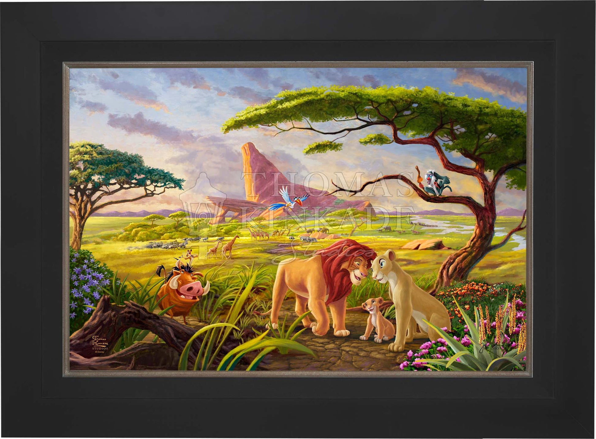 “You’re Mufasa’s boy,” is a quintessential quote regarding true destiny, and a magnificent moment in Disney’s The Lion King movie. Thomas Kinkade originally painted Disney The Lion King in 2011 as an homage to this beautiful and amazing story. The Thomas Kinkade Studios continue this tribute with Disney The Lion King Remember Who You Are . The lush and colorful plain of Africa stretches far behind Kiara, Nala and Simba, as the circle of life continues in harmony and balance.