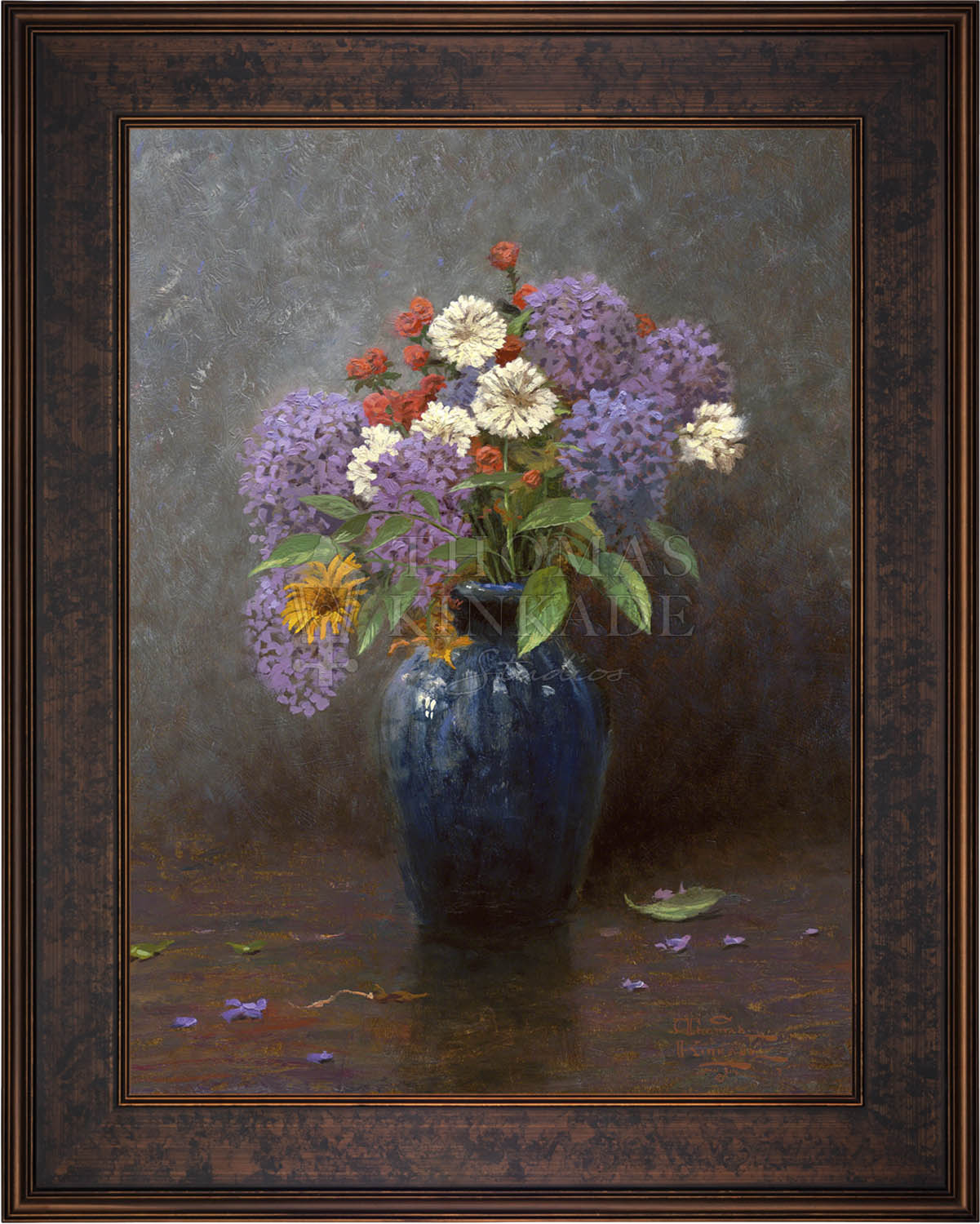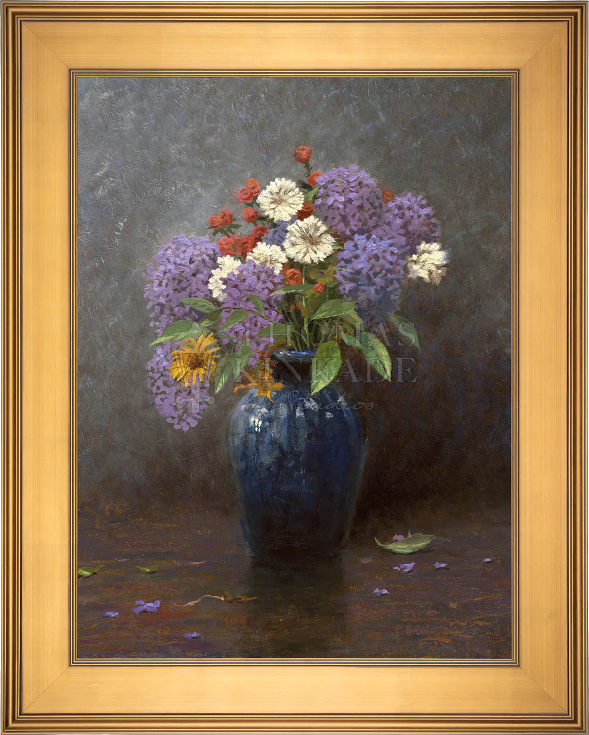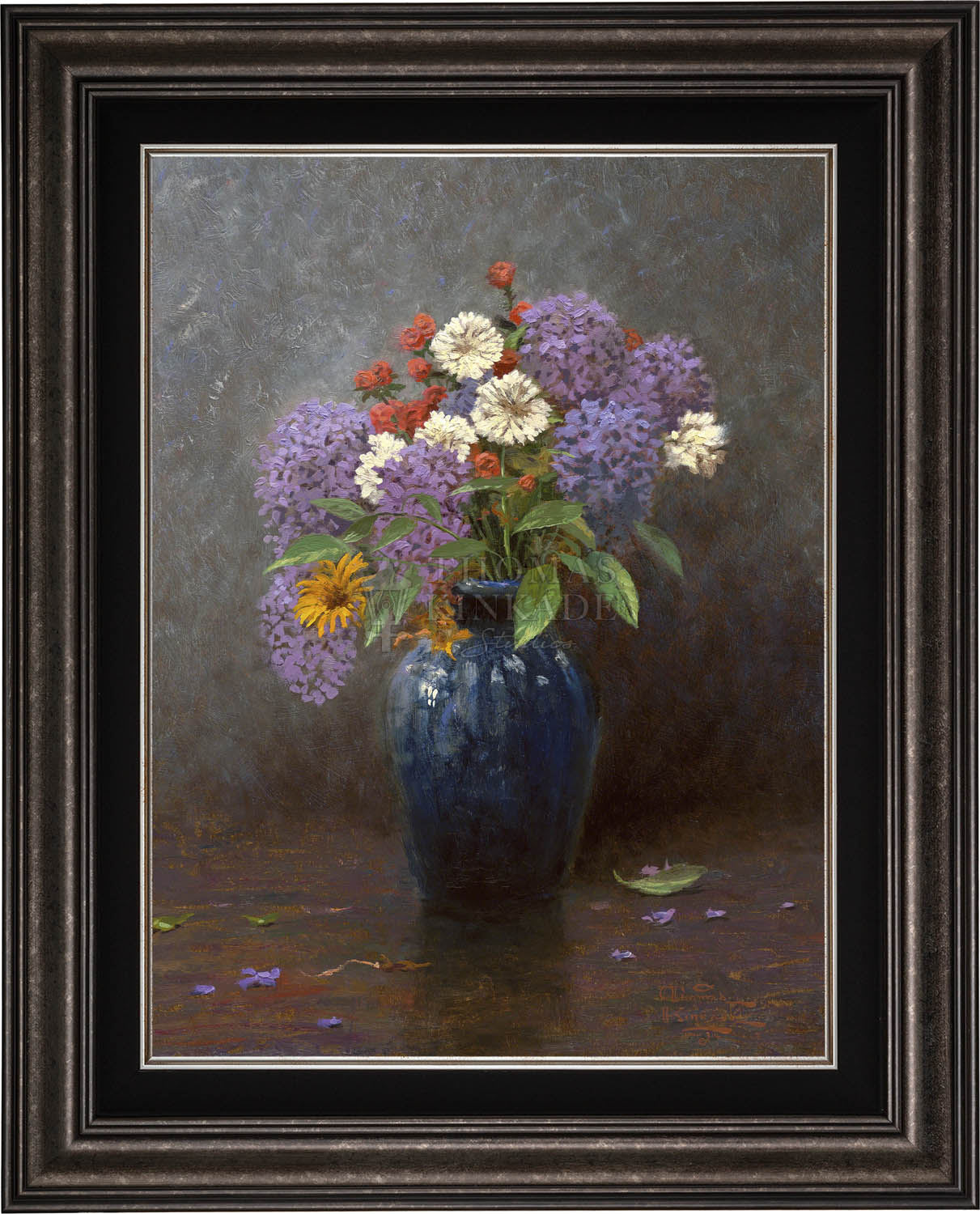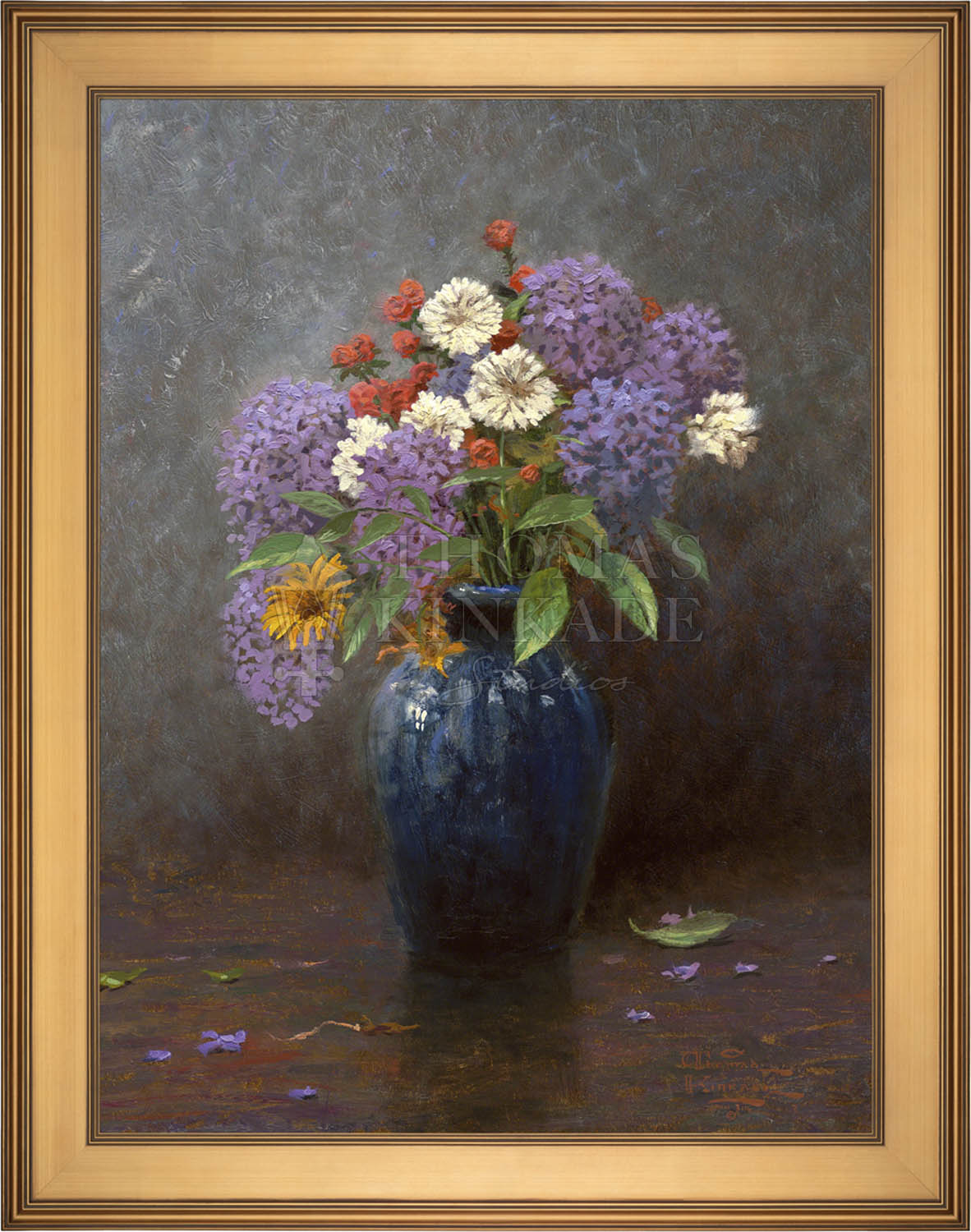 Call UsRarely do I narrow my focus to still life, in essence bringing the glory of nature indoors. My challenge in Lilac Bouquet is to convey the sensual experience of the garden in my portrayal of this lavish bouquet. I want my viewers to delight at the delicate contrast of mauves and purples, to sense the rich perfume of lilacs wafting on the breeze, to imagine the buzz of bees hovering about the flowers.