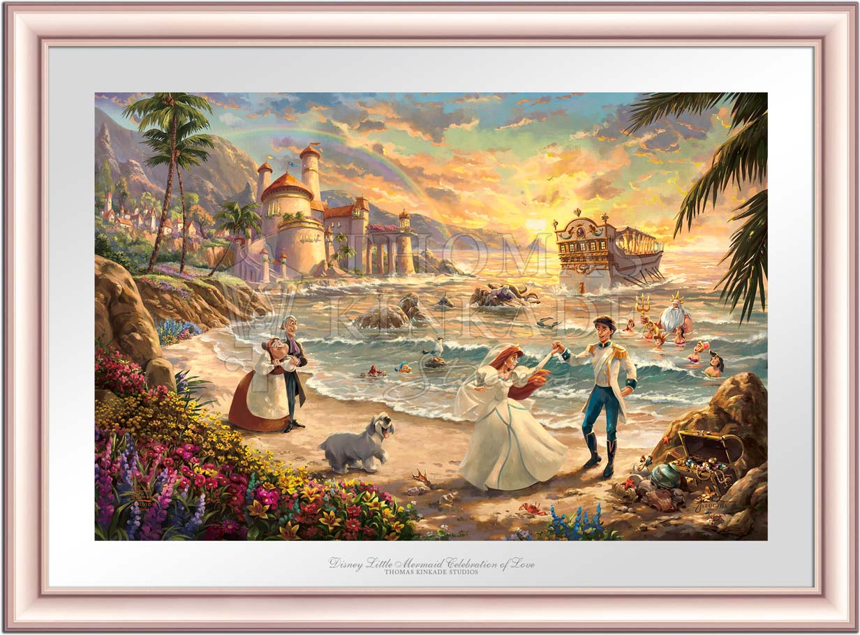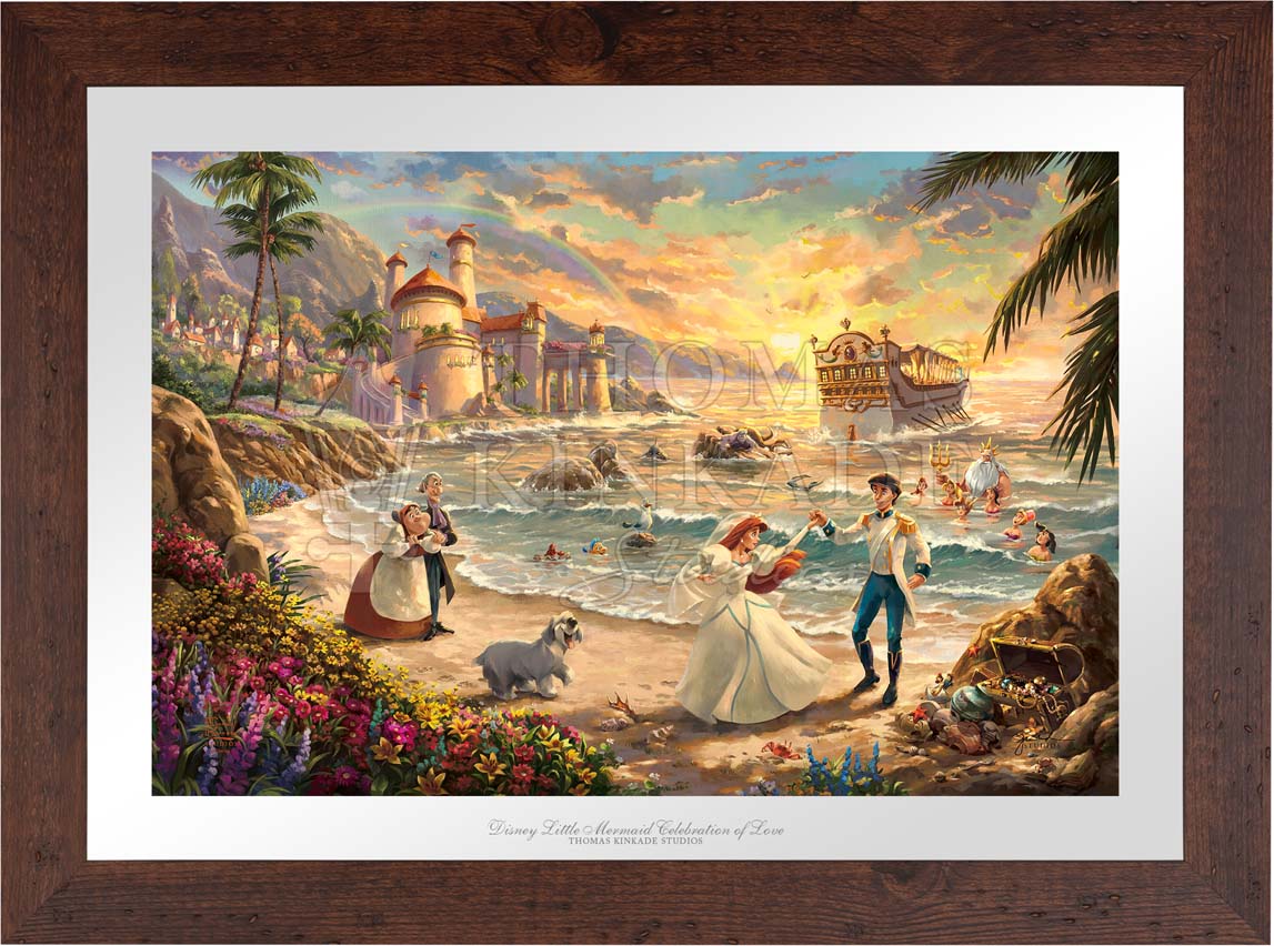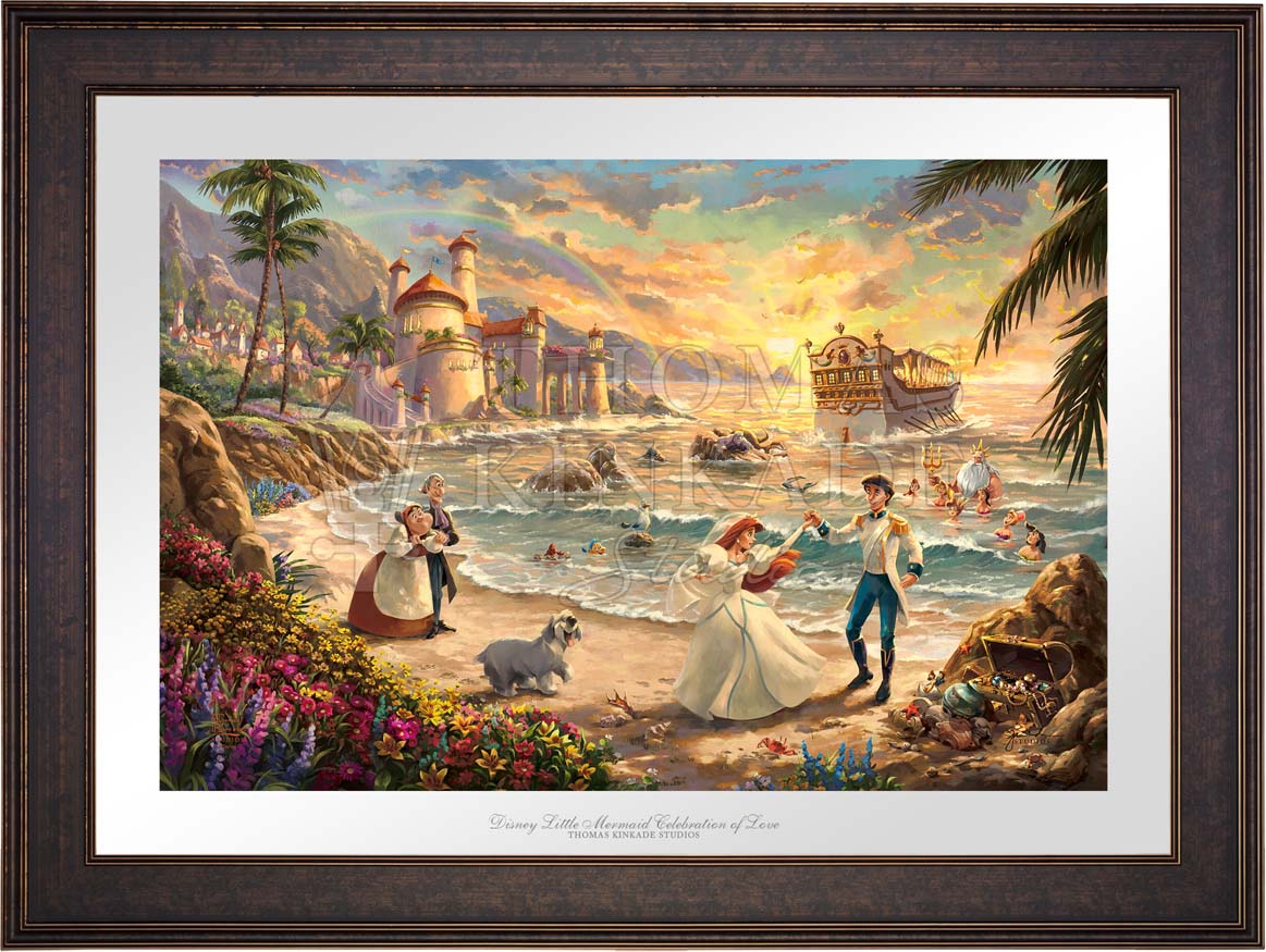 Call UsWhen the world says “give up,” Hope whispers, “try one more time.” - unknown Many children dream of finding their one true love, a love that lasts forever. Thomas Kinkade Studios captures the essence of finding this true love in our collaboration, Disney The Little Mermaid Celebration of Love. The sun has started to set, and a rainbow sparkles with magnificent color as Ariel dances on the sand with her one true love Prince Eric. Max is happily dancing beside them as Sebastian, Flounder, and Scuttle watch from the shore. Ariel’s father, King Triton, sweetly smiles beside his other daughters as they celebrate the love she has found. But nearby, Ursula plots her next move to undermine Ariel and Prince Eric’s happiness.