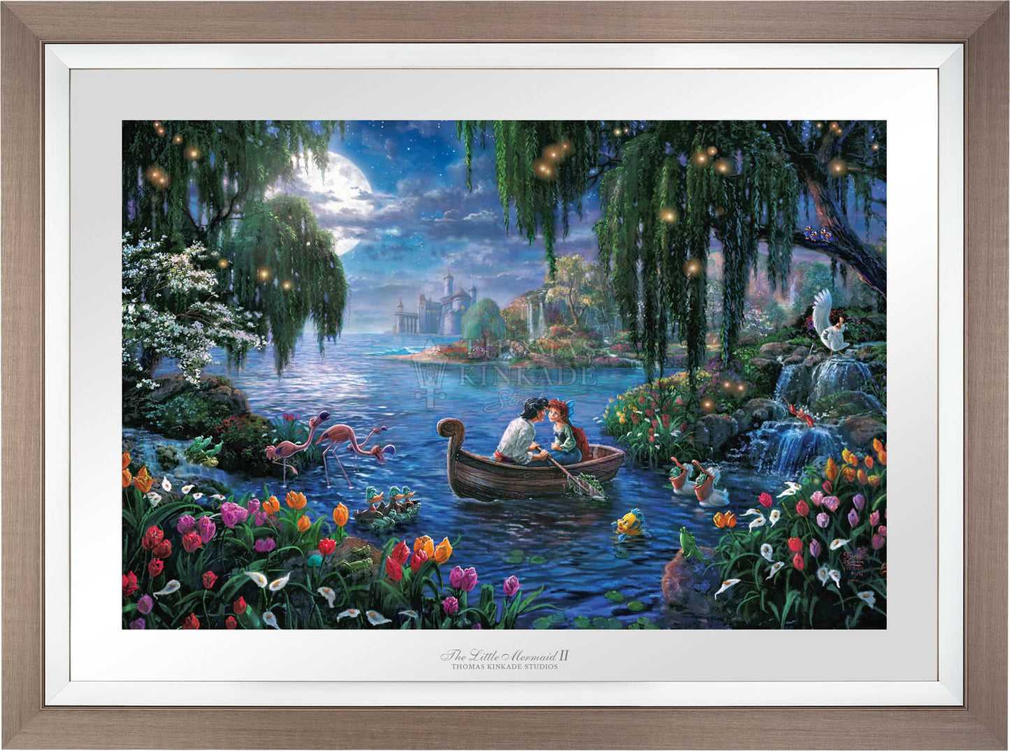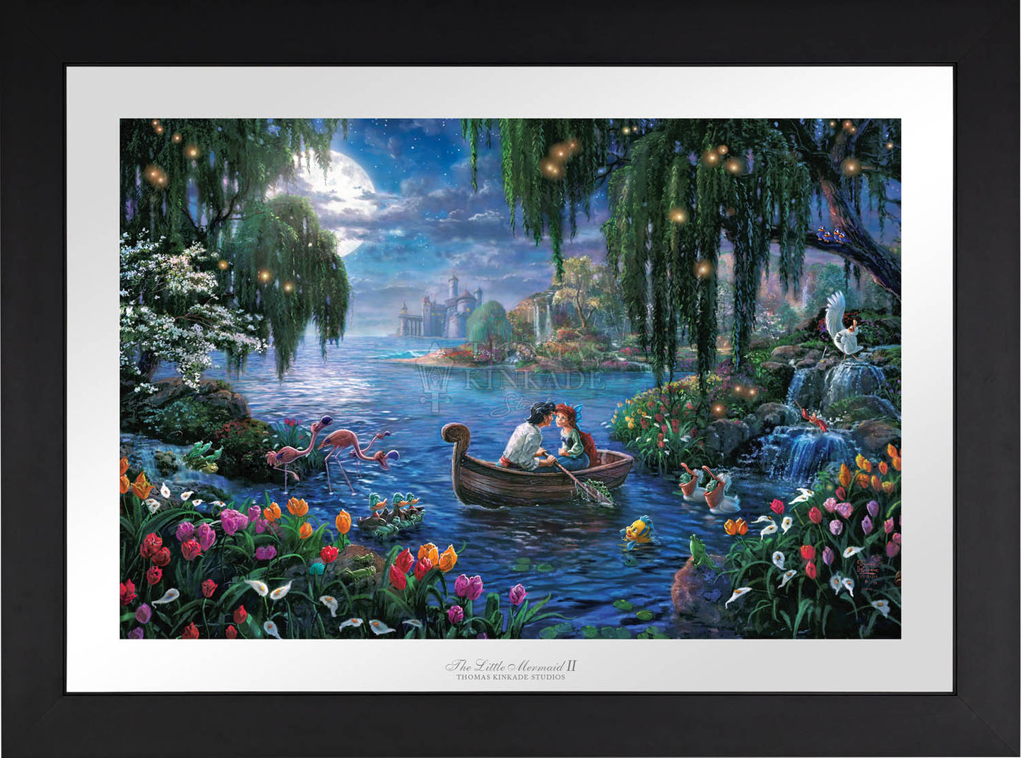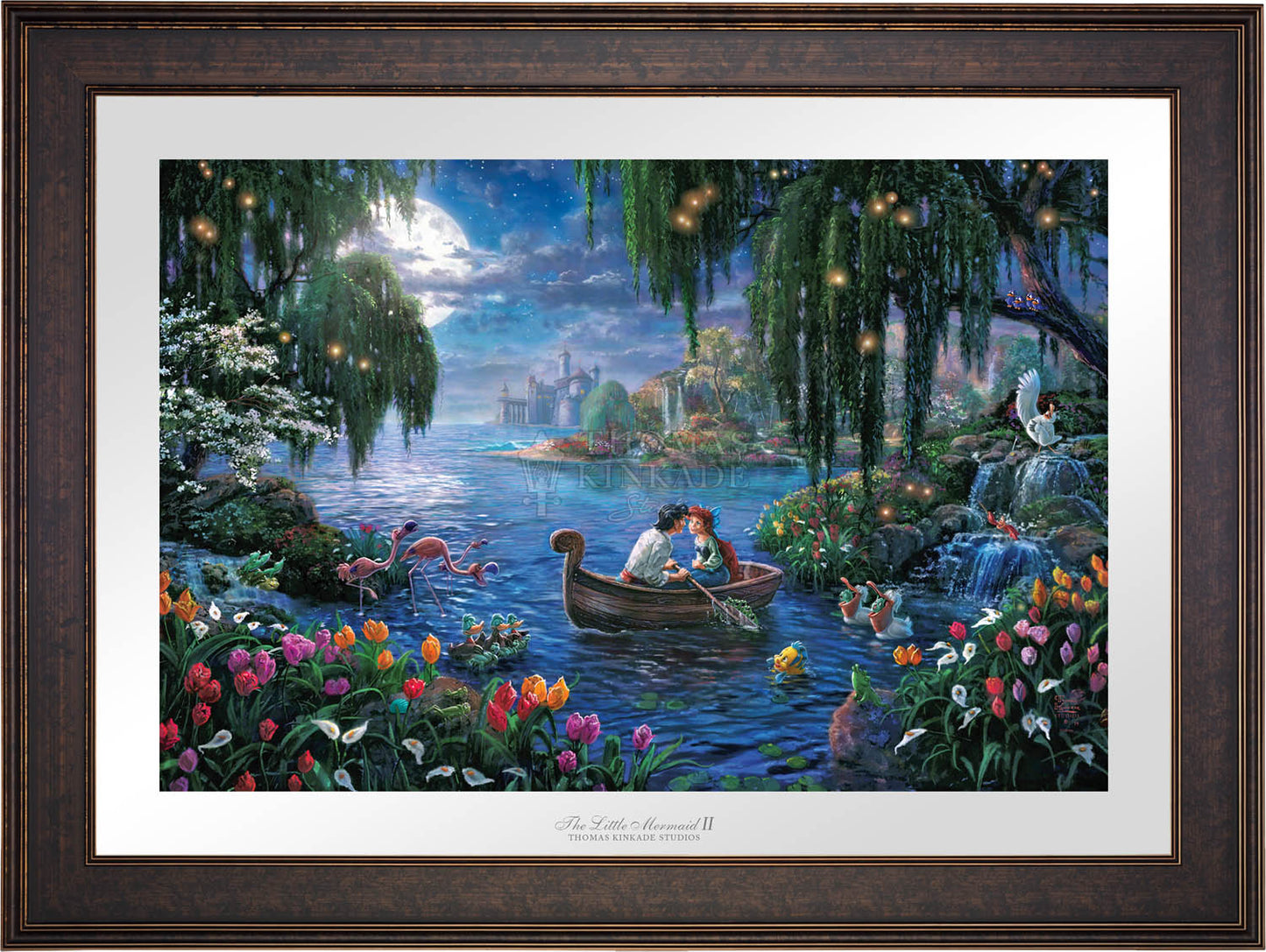 Call UsWhen Thomas Kinkade first took brush to canvas on his classic Disney painting, Disney The Little Mermaid, he paused to write that the film "captures the innocent nature of first love. Love is powerful, love is captivating and first love absolutely enchants!" And when first love becomes true love, it lasts forever. In Disney The Little Mermaid II, the Thomas Kinkade Studios capture the moment when love first awakens. Prince Eric and Ariel are on a boat in the blue lagoon surrounded by Scuttle, Sebastian, Flounder and friends who have prepared the mood in hopes that the couple will find their enchanted love. There she sits across the way, will he kiss the girl? Join us in celebrating this magical moment between Prince Eric and Ariel.