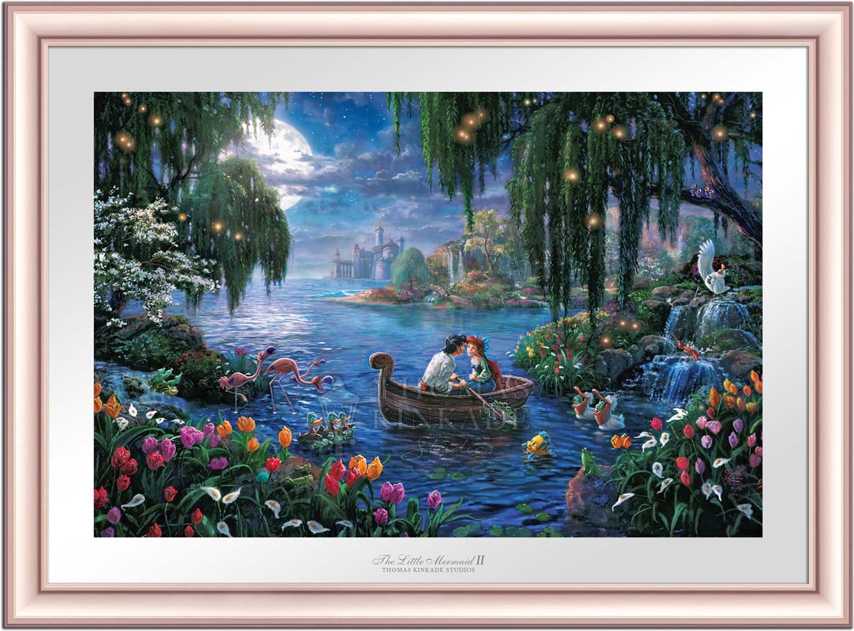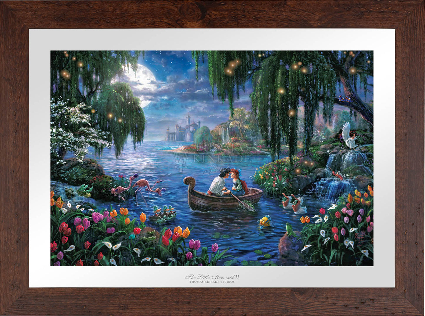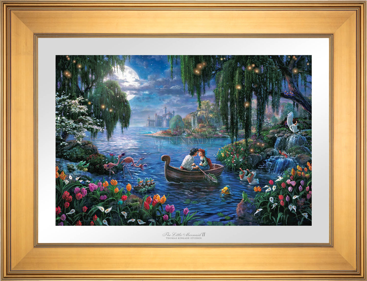 Call UsWhen Thomas Kinkade first took brush to canvas on his classic Disney painting, Disney The Little Mermaid, he paused to write that the film "captures the innocent nature of first love. Love is powerful, love is captivating and first love absolutely enchants!" And when first love becomes true love, it lasts forever. In Disney The Little Mermaid II, the Thomas Kinkade Studios capture the moment when love first awakens. Prince Eric and Ariel are on a boat in the blue lagoon surrounded by Scuttle, Sebastian, Flounder and friends who have prepared the mood in hopes that the couple will find their enchanted love. There she sits across the way, will he kiss the girl? Join us in celebrating this magical moment between Prince Eric and Ariel.