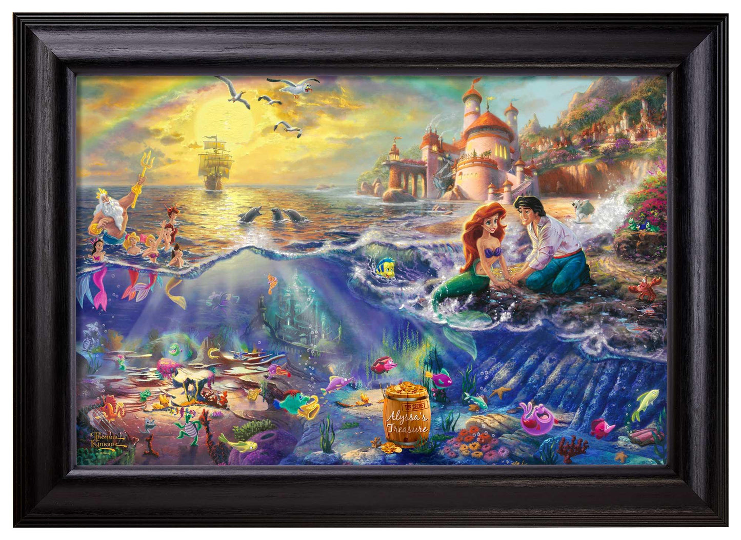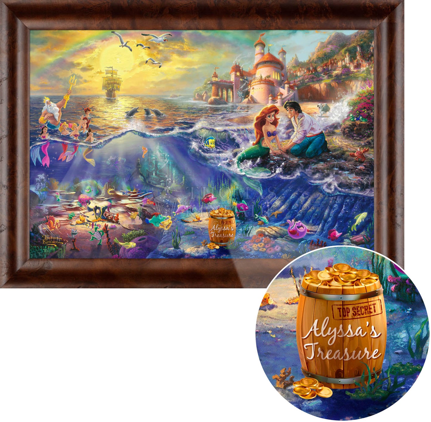 Disney Dreams Collection by Thomas Kinkade Studios is now available as a personalized framed canvas! Specify a line of personalization to the barrel of treasures in the image and you or someone special will feel part of this famous love story! Personalization information will be entered in your shopping cart during the checkout process, or please contact us for additional personalization requests. Open edition canvas framed. Available with multiple frame choices in multiple sizes. Open Edition Certificate of Authenticity included.