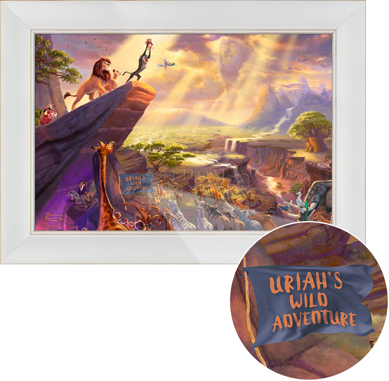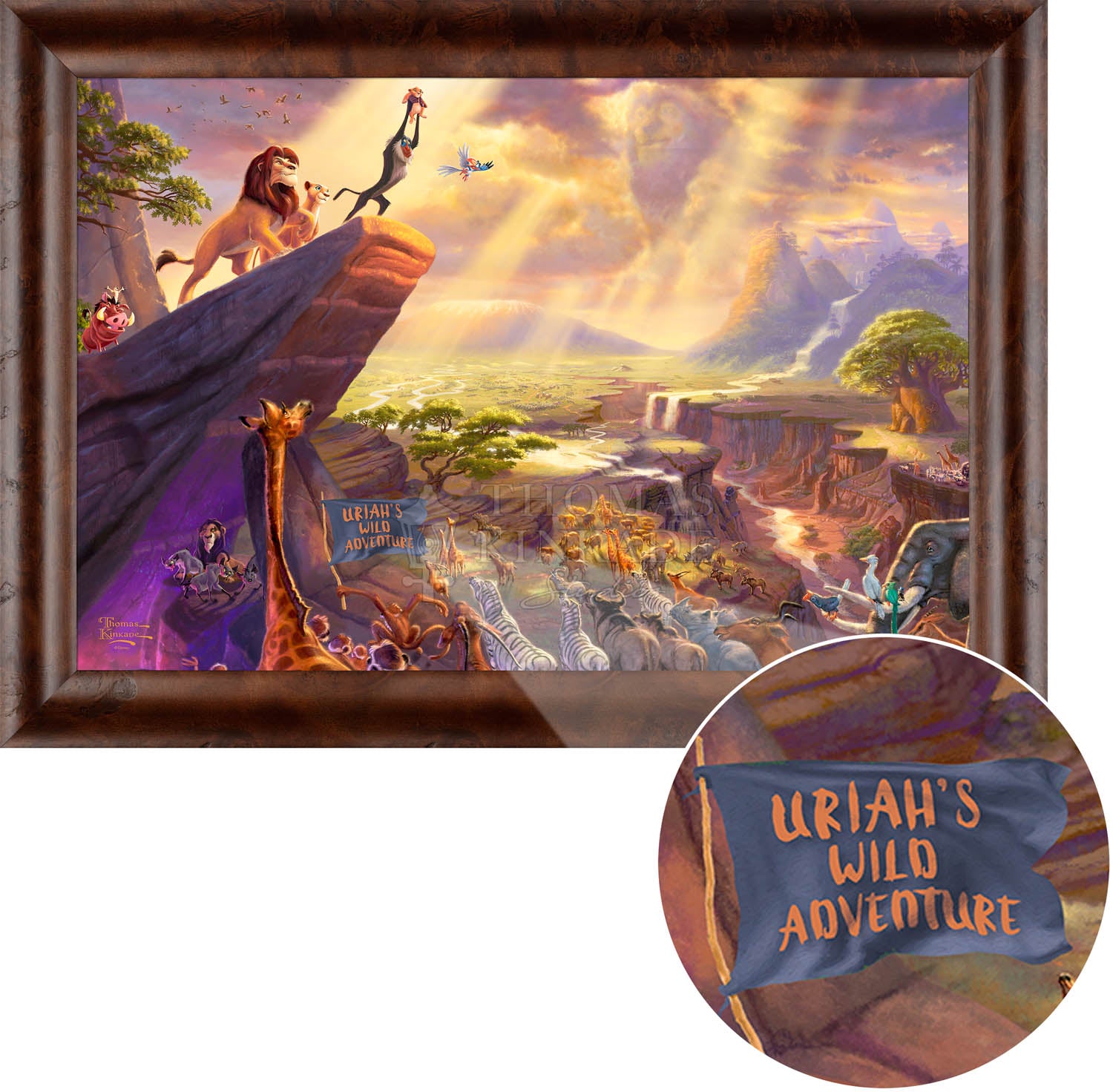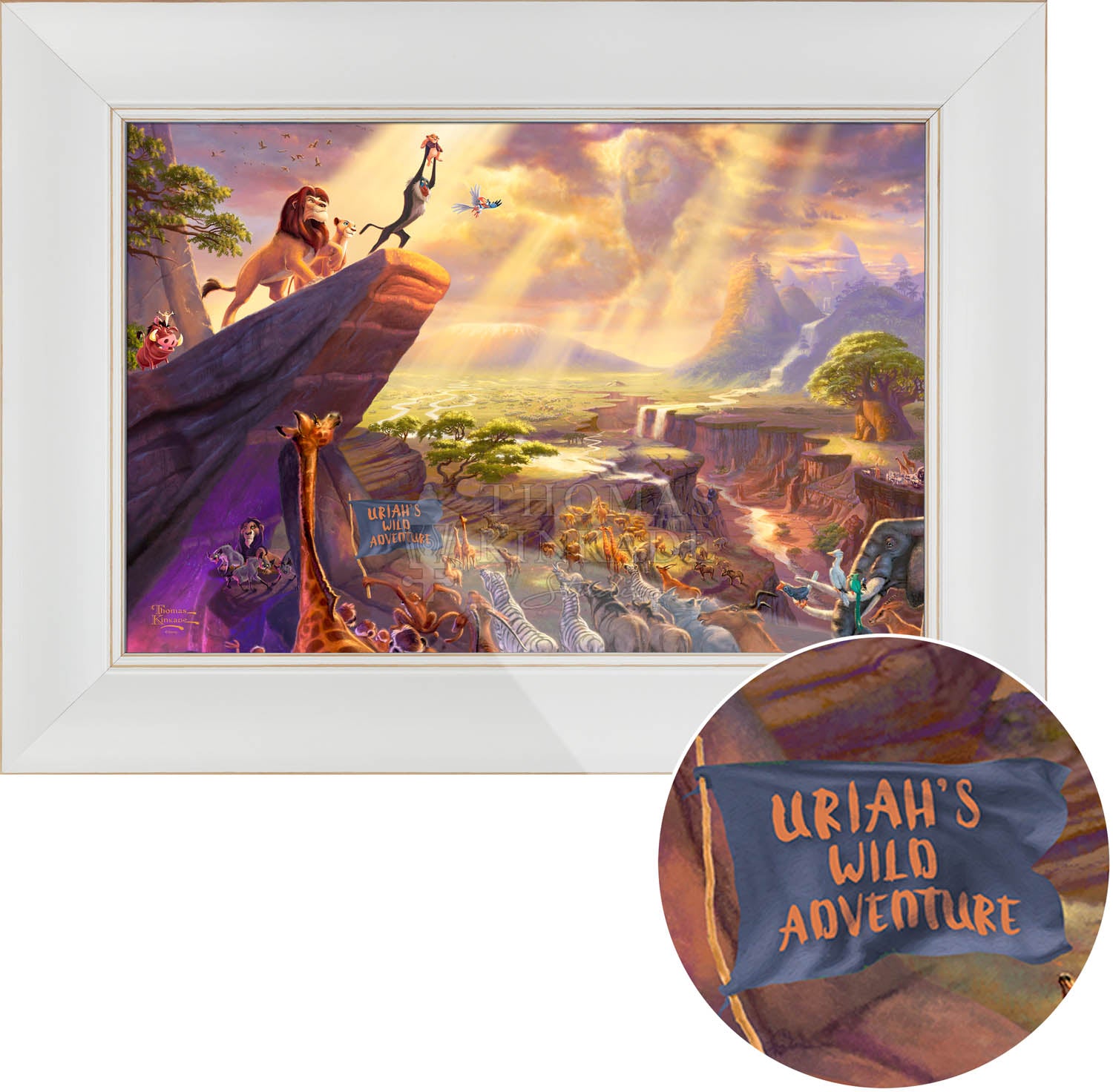 Disney Dreams Collection by Thomas Kinkade Studios now available as a personalized framed canvas! We'll add one line of personalization to the flag in the image so you or someone special can feel part of this adored love story! Specify personalization during checkout or contact us for additional personalization requests. Open edition canvas framed. Available with multiple frame choices in multiple sizes. Open Edition Certificate of Authenticity included.