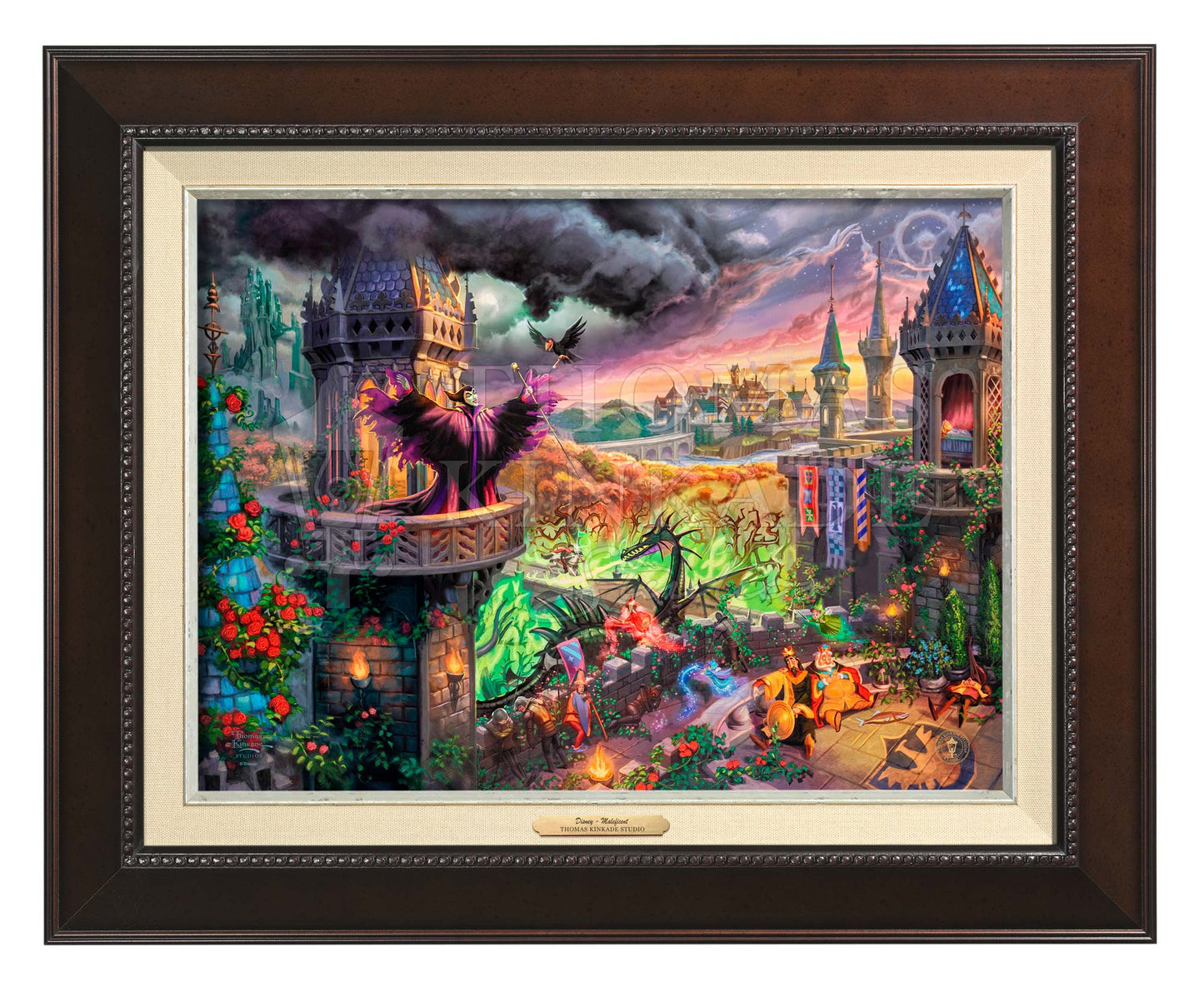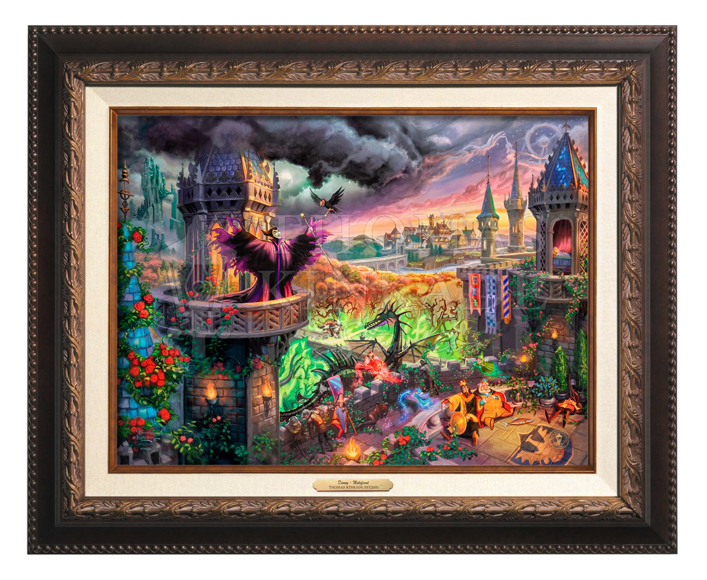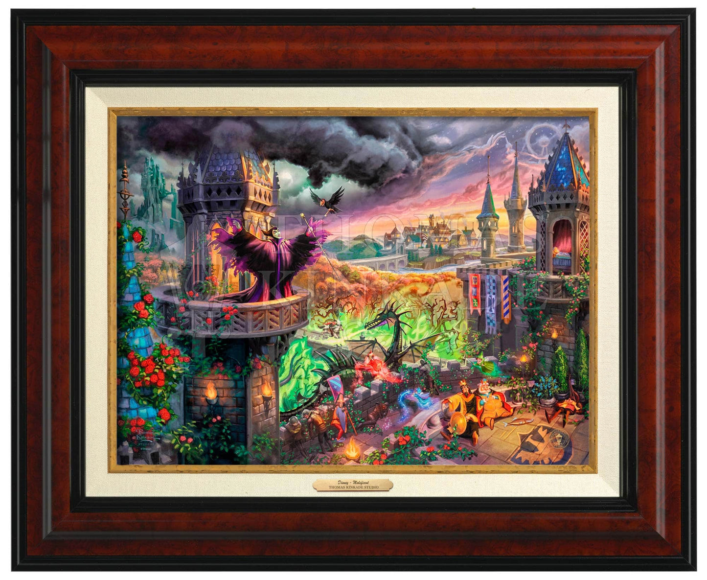 "I really felt quite distressed at not receiving an invitation.” - Maleficent Disney’s Sleeping Beauty has amazing characters that tell a story of how one’s destiny and true love can overcome all barriers, including someone’s animosity. King Stefan has incurred the wrath of Maleficent, the mistress of evil, by having excluded her from the christening of young Princess Aurora. Maleficent has cursed the youngster to an endless sleep by the pricking of her finger on a spinning wheel before her sixteenth birthday. Thomas Kinkade Studios is pleased to present Disney Maleficent, the story of Sleeping Beauty from Maleficent’s point of view after Princess Aurora pricks her finger on an enchanted spinning wheel in the castle tower. Maleficent, with The Raven flying to join her, stands triumphantly on a castle turret overlooking King Stefan and King Hubert who have fallen asleep. Flora, Fauna and Merryweather have snuck into Maleficent’s lair in the Forbidden Mountains to free Prince Philip who races to save Aurora, whose kiss can awaken her from the endless sleep.
