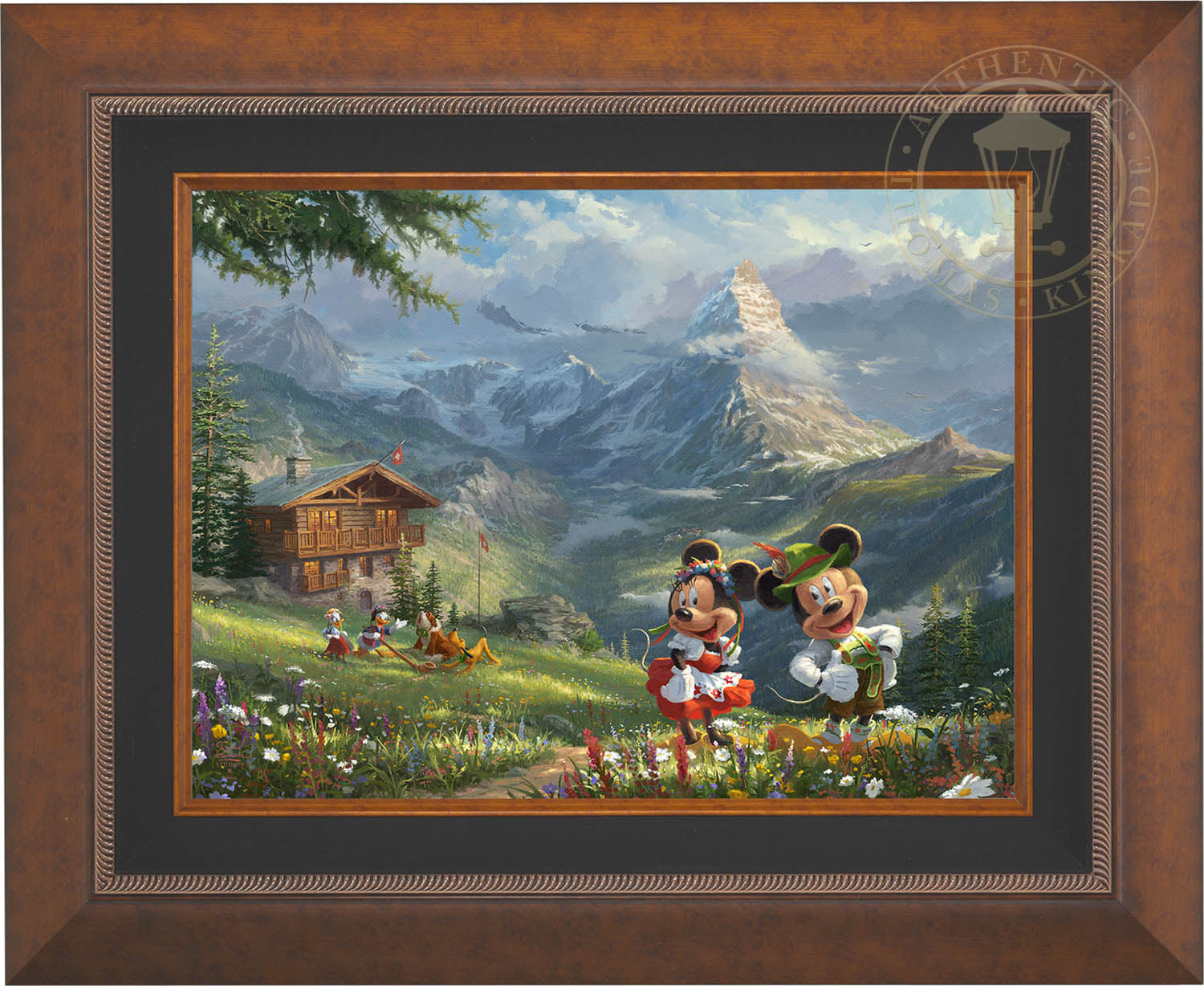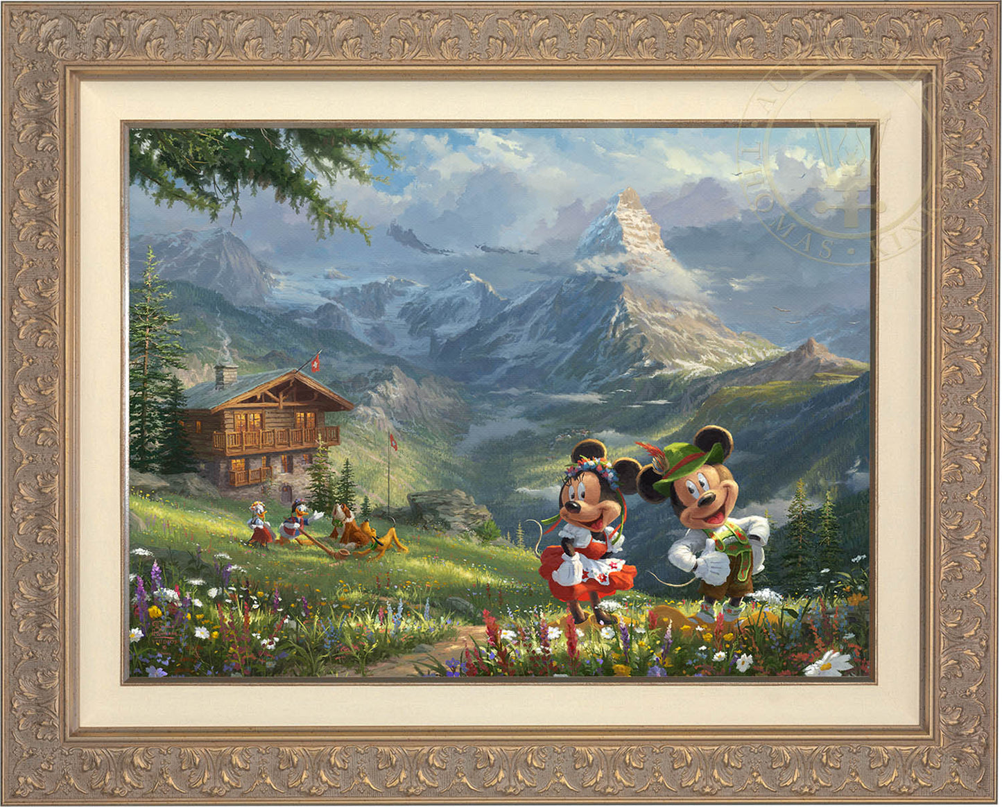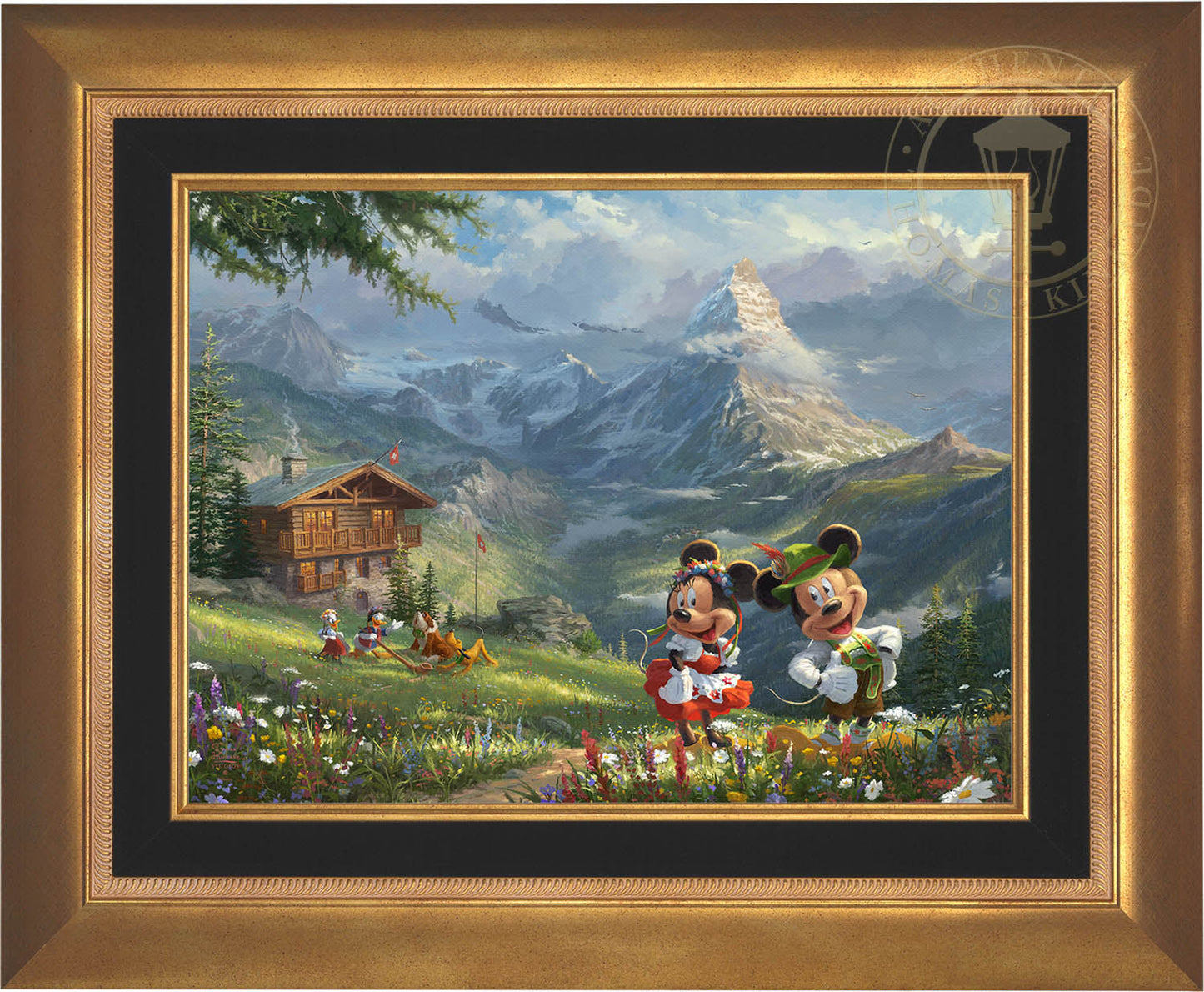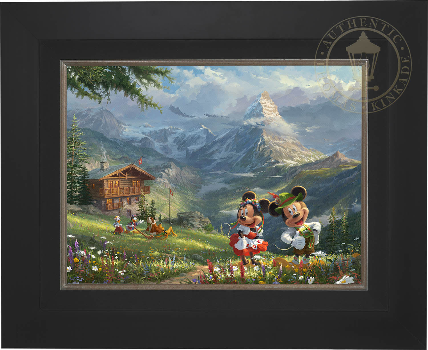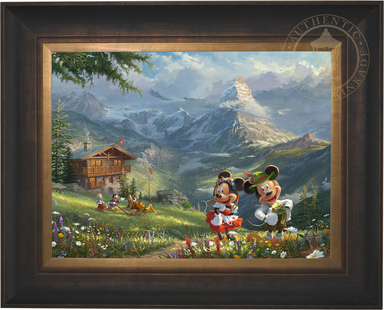 There is no adventure too great or too small for this troop, and that includes hiking into the Swiss Alps. As you can clearly see, Mickey, Minnie, and Daisey are all wearing traditional Swiss attire, but Donald has also found an alphorn, causing Pluto and his new friend, a mountain rescue dog, to start singing along. Their alpine bungalow offers a front row seat to one of the most inspiring mountains in the world, the Matterhorn. Mickey and Minnie in the Swiss Alps incorporates, not only your favorite Disney characters but also the awe-inspiring realism of notable landmarks, resulting in a beautiful piece of art.