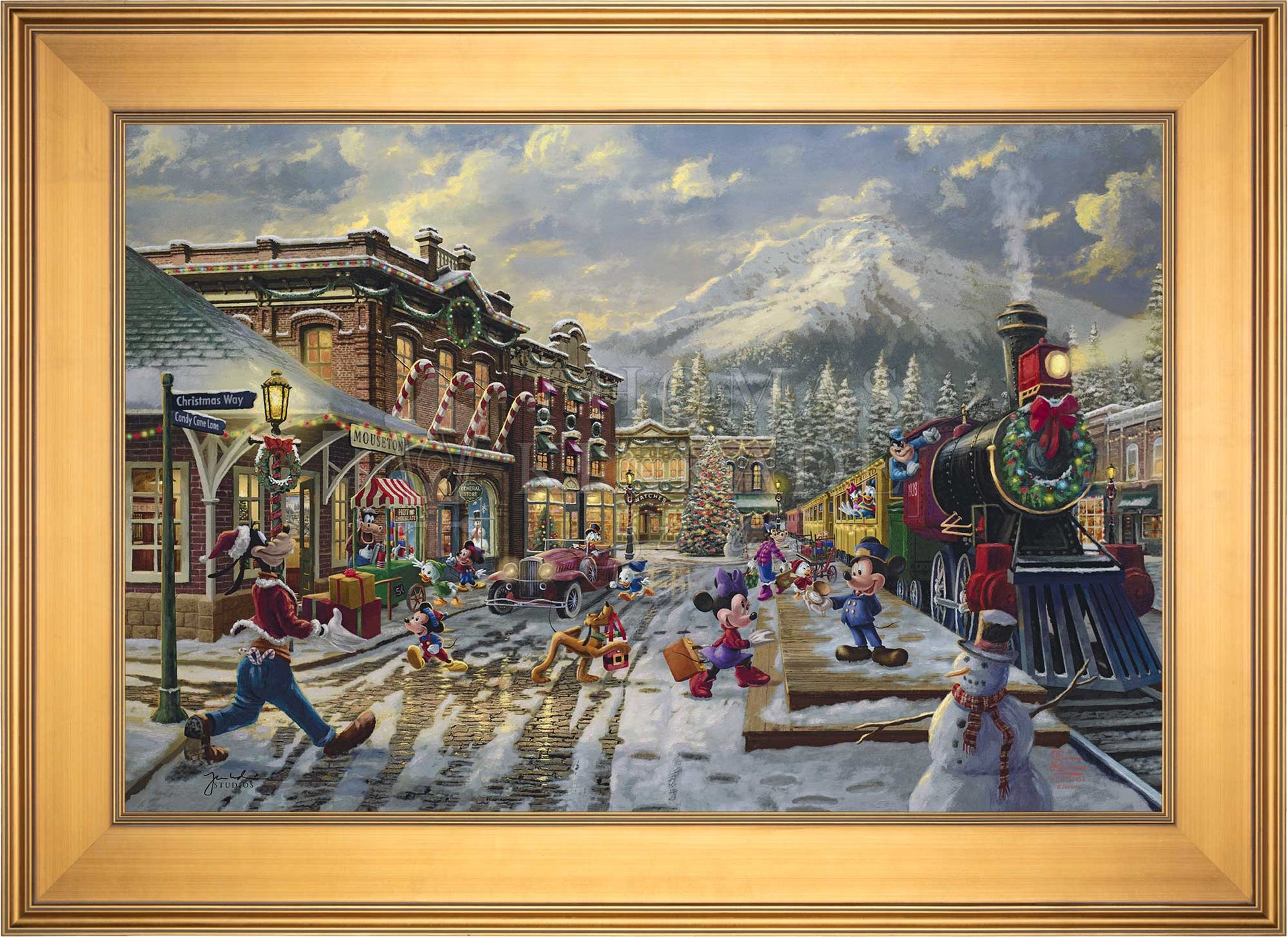 Thomas Kinkade Studios presents Disney Mickey and Minnie Candy Cane Express . The holiday lights sparkle and twinkle, and brilliant white snow glistens as some of our favorite Disney friends prepare to embark on a festive journey aboard the Candy Cane Express. Mickey Mouse the Train Conductor warmly greets Minnie Mouse as she prepares to board the Candy Cane Express, and Pluto carries the gift bag for her. Scrooge looks on as Huey hurries over to help Dewey bring hot chocolate to Louie, Uncle Donald Duck and Daisy Duck. Goofy strolls toward the platform to board the train, carefully carrying wrapped packages across the snow. Morty runs over to help Goofy with plans to be paid with one of the candy canes in Goofy’s back pocket.