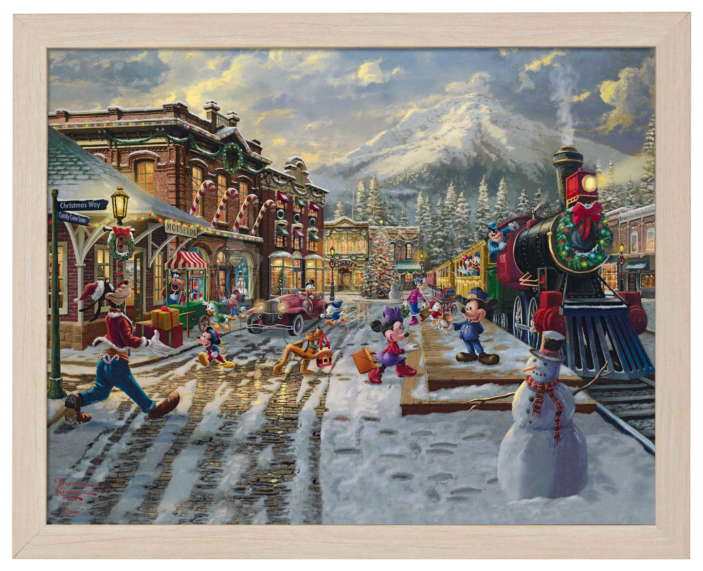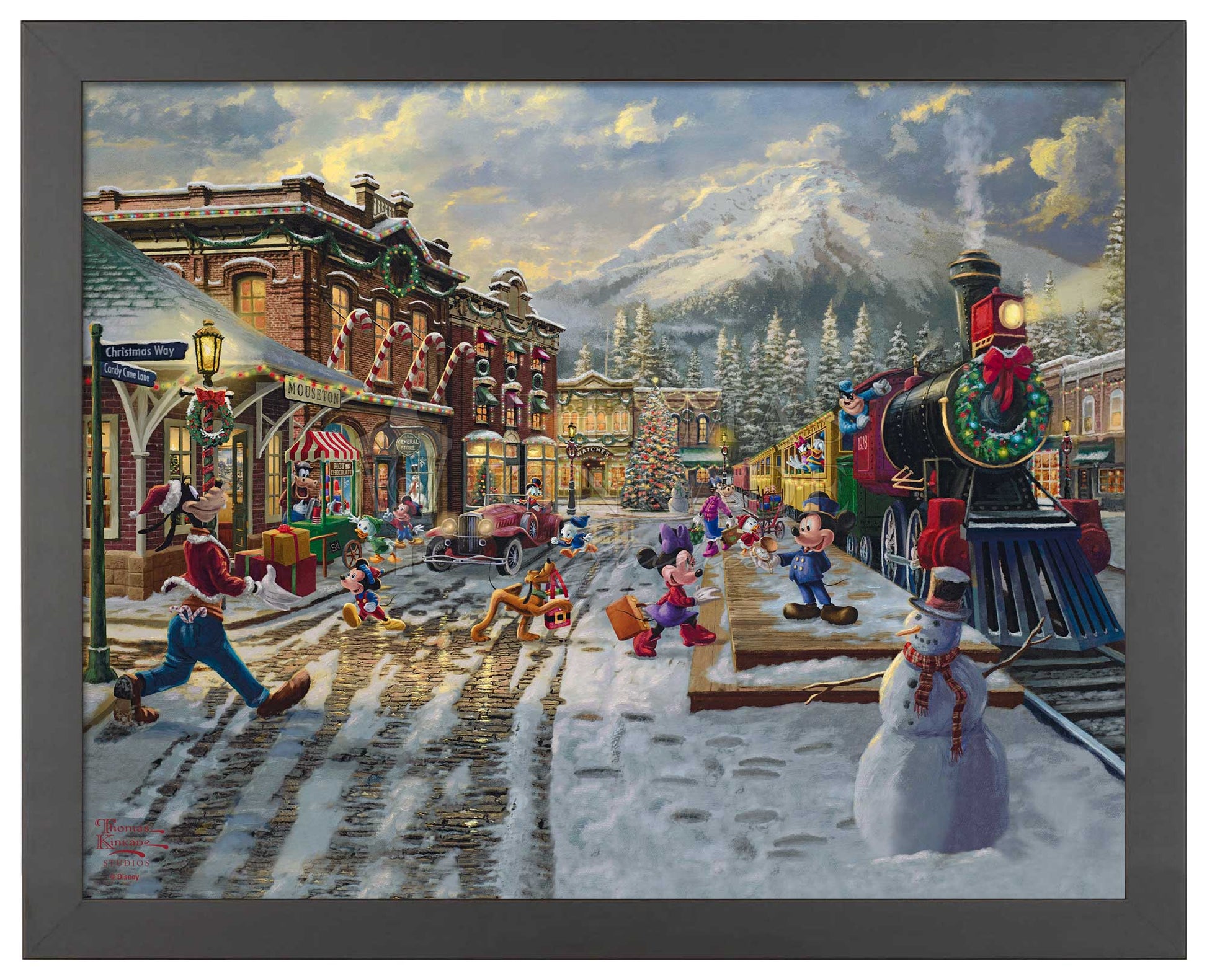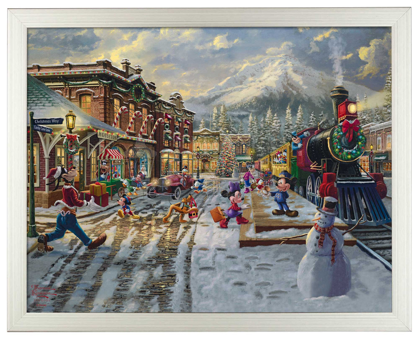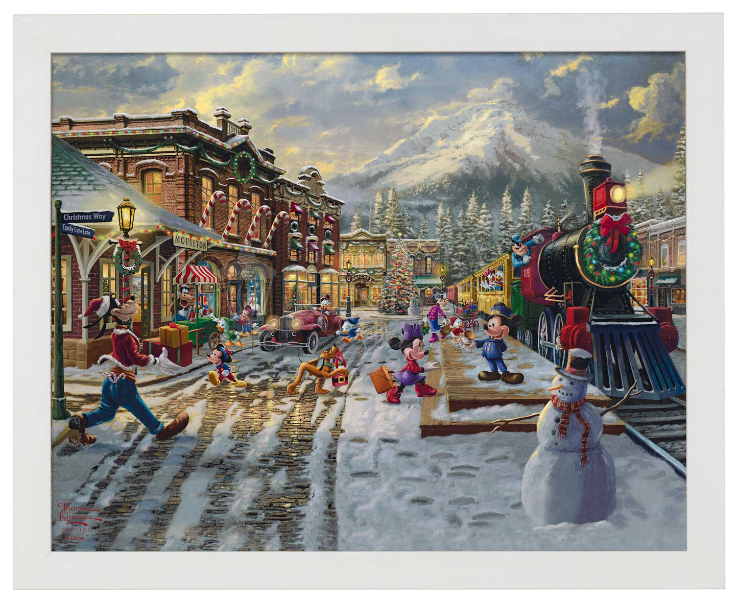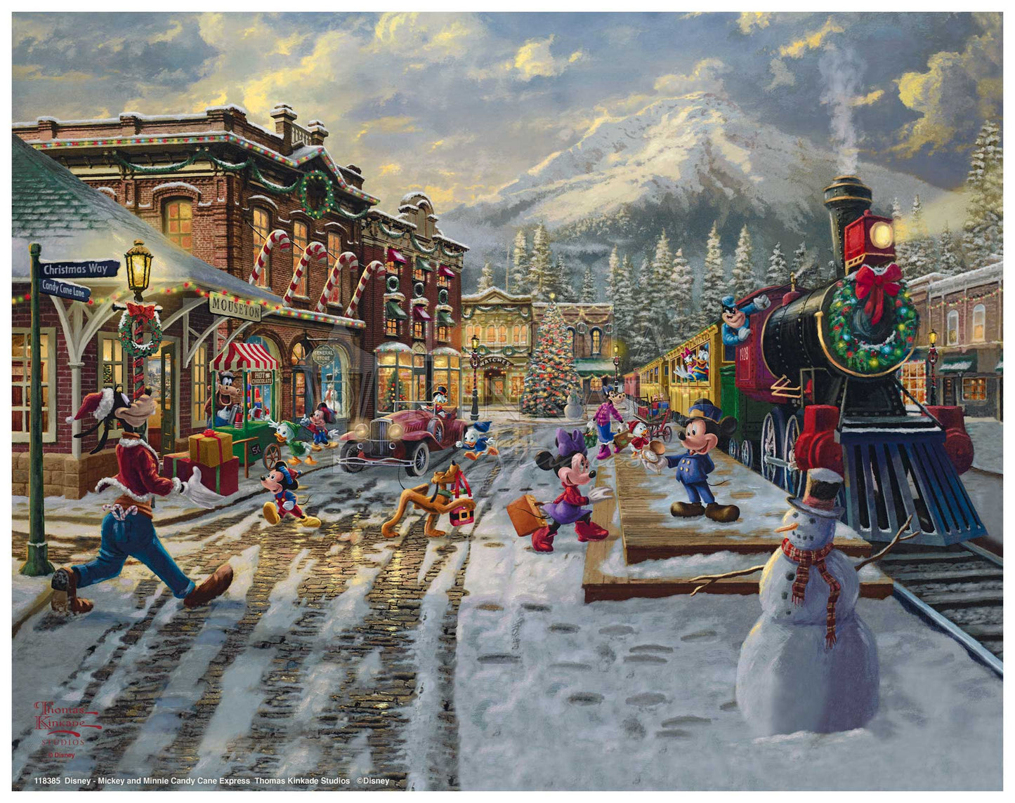 Thomas Kinkade Studios presents Disney Mickey and Minnie Candy Cane Express. The holiday lights sparkle and twinkle, and brilliant white snow glistens as some of our favorite Disney friends prepare to embark on a festive journey aboard the Candy Cane Express. Mickey Mouse the Train Conductor warmly greets Minnie Mouse as she prepares to board the Candy Cane Express, and Pluto carries the gift bag for her. Scrooge looks on as Huey hurries over to help Dewey bring hot chocolate to Louie, Uncle Donald Duck and Daisy Duck. Goofy strolls toward the platform to board the train, carefully carrying wrapped packages across the snow. Morty runs over to help Goofy with plans to be paid with one of the candy canes in Goofy’s back pocket.