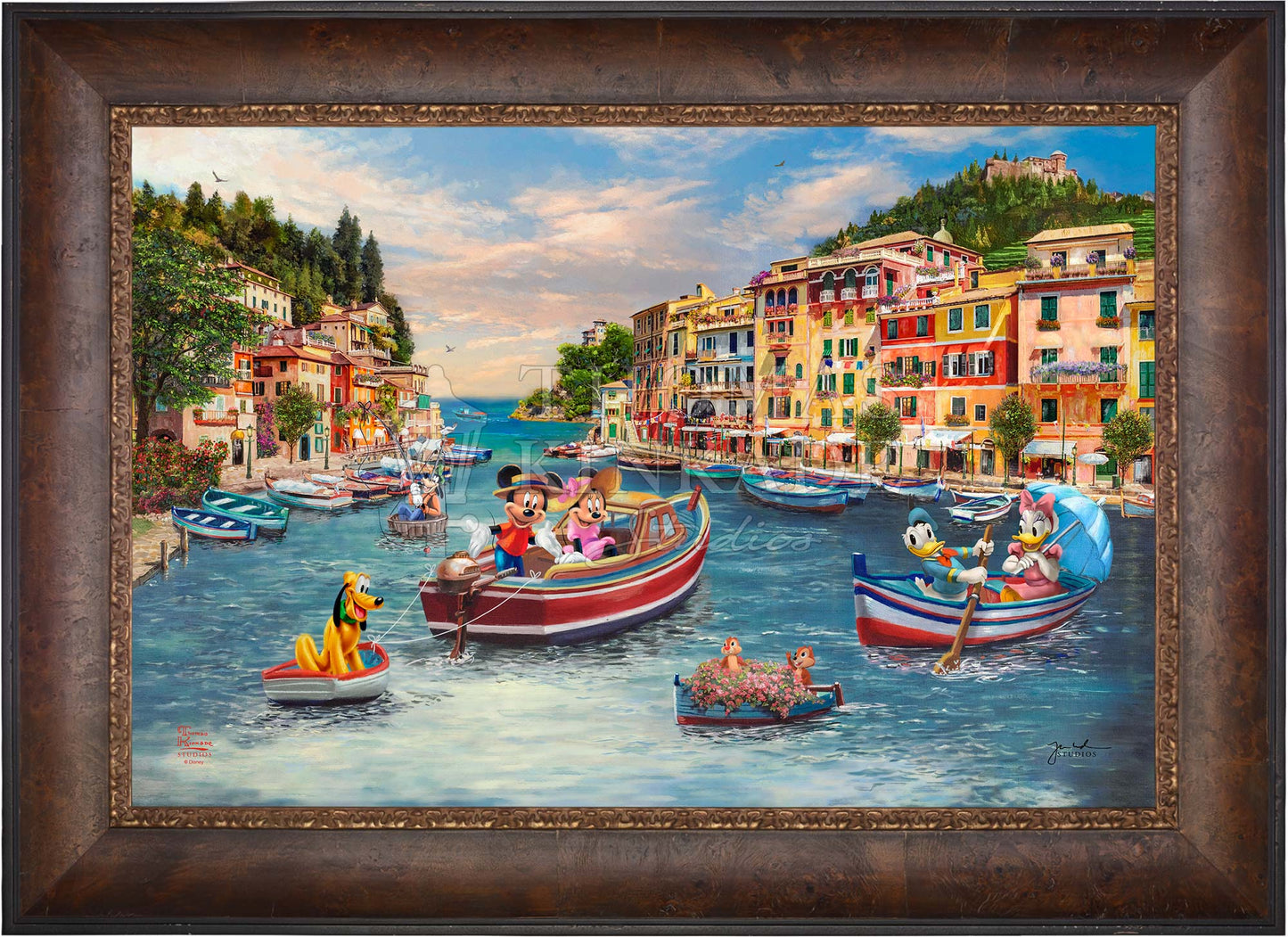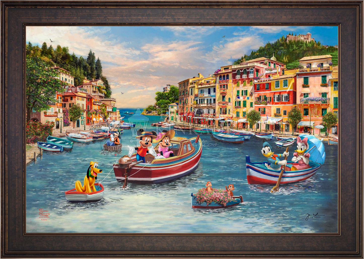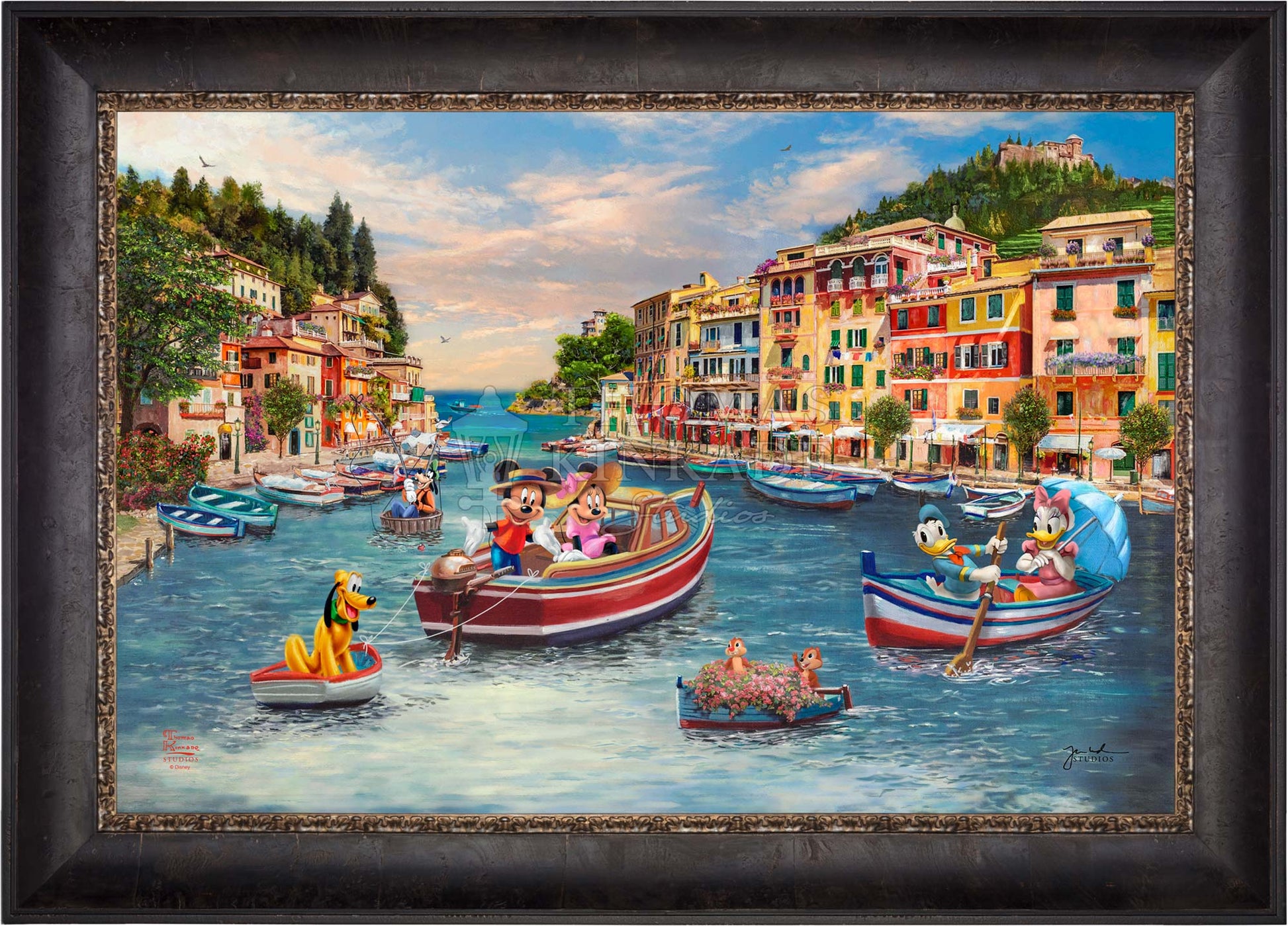 In Disney Mickey and Minnie in Italy by Thomas Kinkade Studios®, the bright sunshine is casting a soft warm glow over the dazzling blue of the Mediterranean Sea. Mickey Mouse and Minnie Mouse have set off in their motorized boat for a fun-filled afternoon adventure. Pluto is happily sitting in his own small boat being towed behind. All are admiring the flowers that Chip & Dale have placed aboard their small vessel. Daisy Duck is enjoying the warmth of the sun, as Donald Duck rows them towards Mickey and Minnie’s boat. Off on his own, Goofy has fashioned a functional watercraft out of a barrel and is happily fishing for his meal.