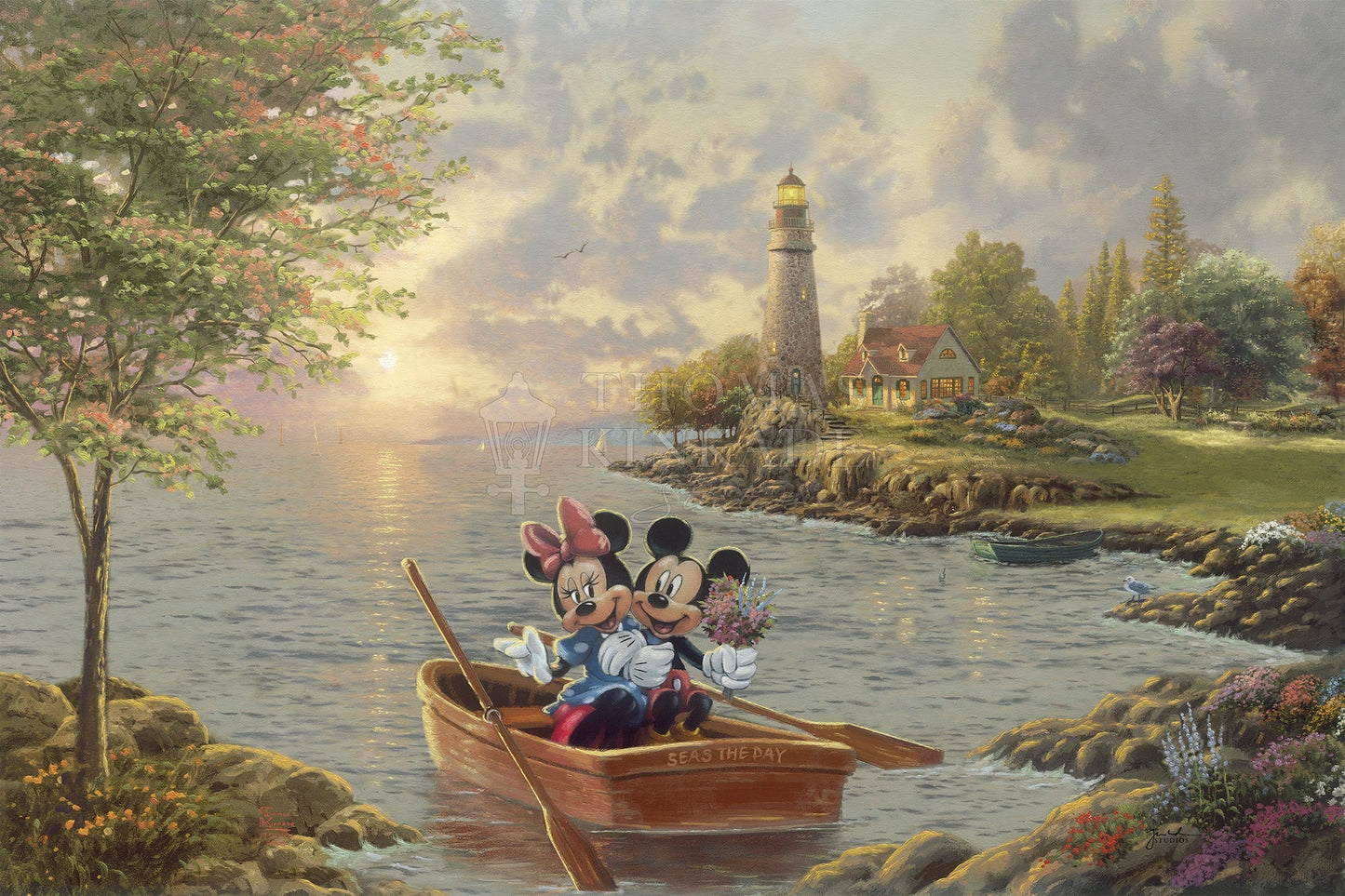 In Disney Mickey and Minnie Lighthouse Cove by Thomas Kinkade Studios, we find the pair enjoying each other’s company as the evening breeze softly blows the waves onto the rocks. The vibrant colors of the flowers and the verdant sea grass makes the time spent together even more beautiful.