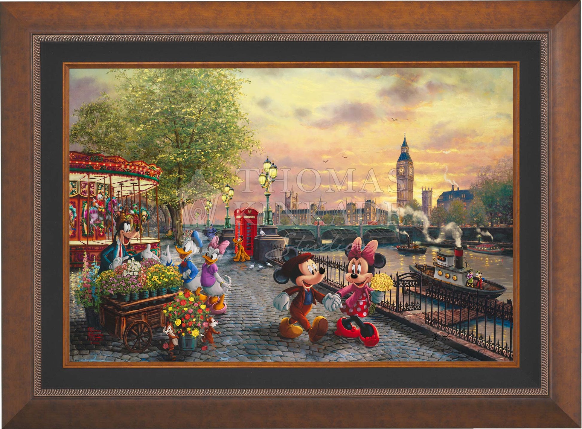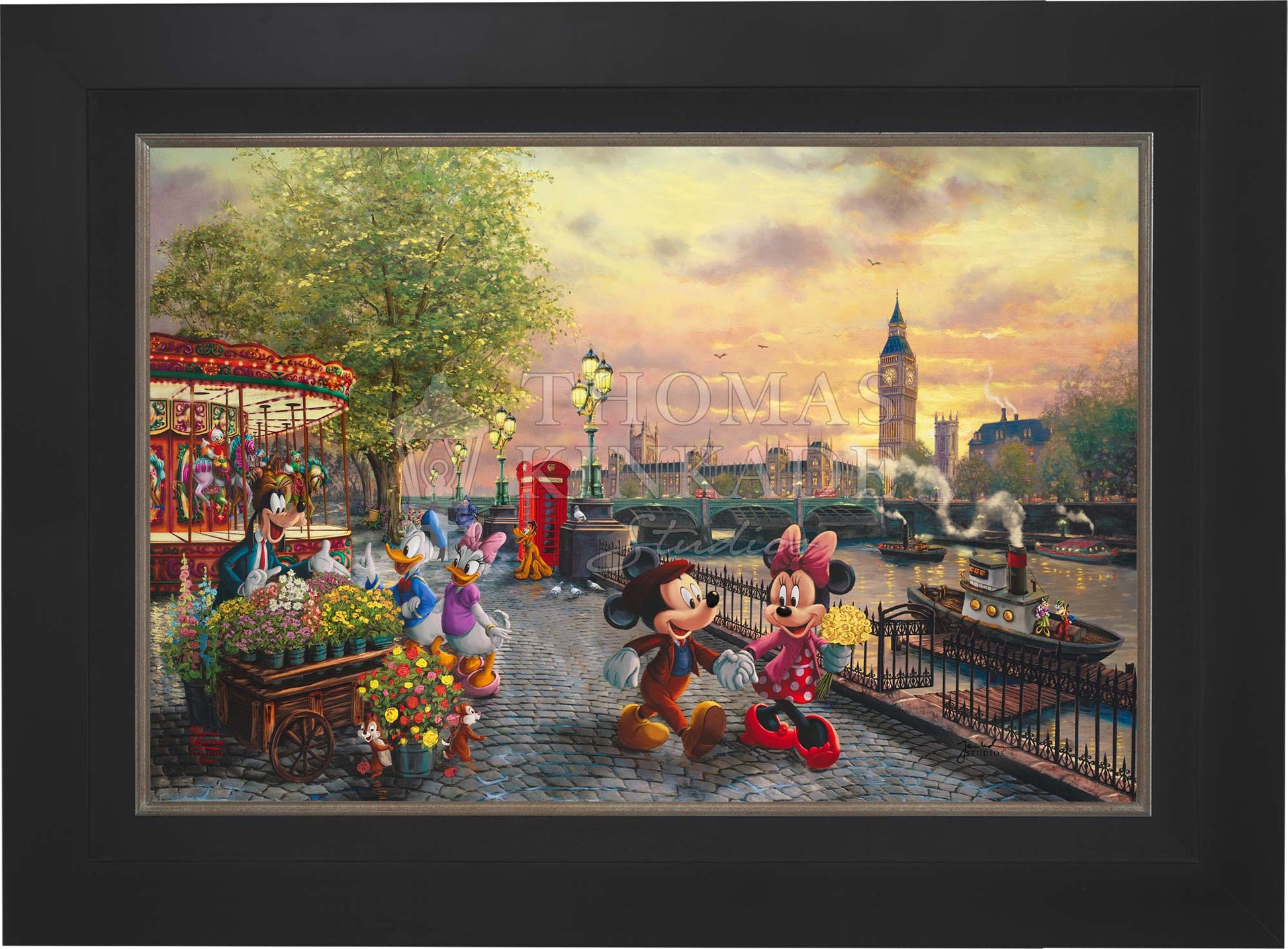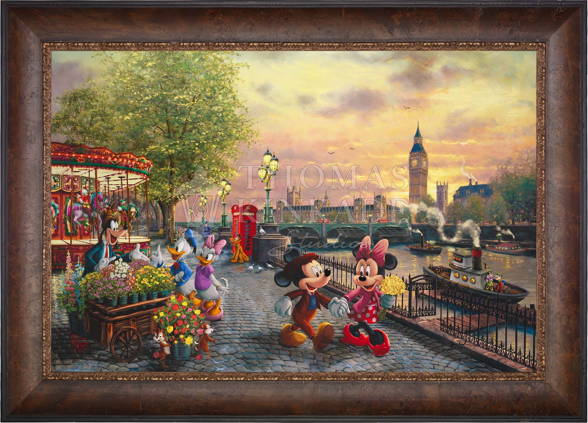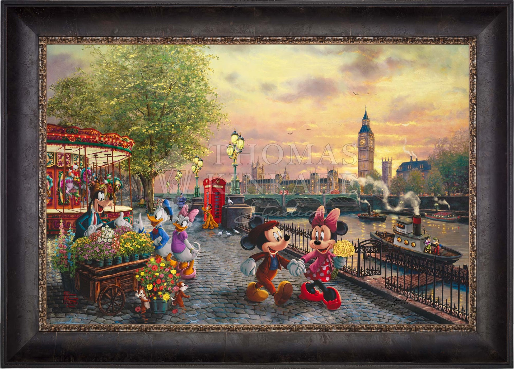 In Disney Mickey and Minnie in London by Thomas Kinkade Studios, Mickey Mouse and Minnie Mouse enjoy a beautiful crisp day walking along the Thames River. The chimes of Big Ben tolling the hour float on the air and blend with the music coming from the brightly lit carousel. Pluto waits for Huey, Dewey, and Louie to ride the carousel. Goofy’s Flower Cart has caught the attention of Donald Duck and Daisy Duck, as Chip and Dale playfully pull roses from the metal bucket.© Disney