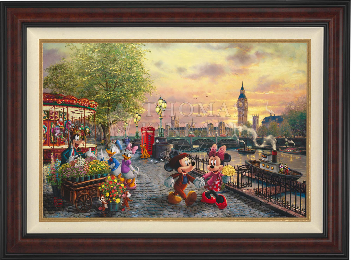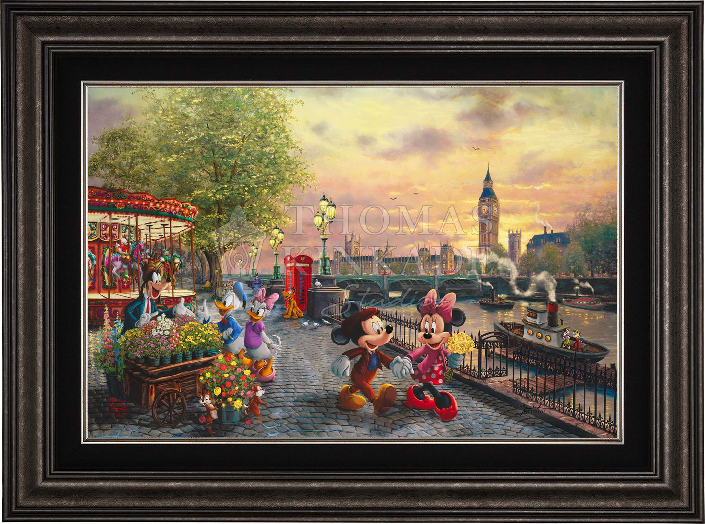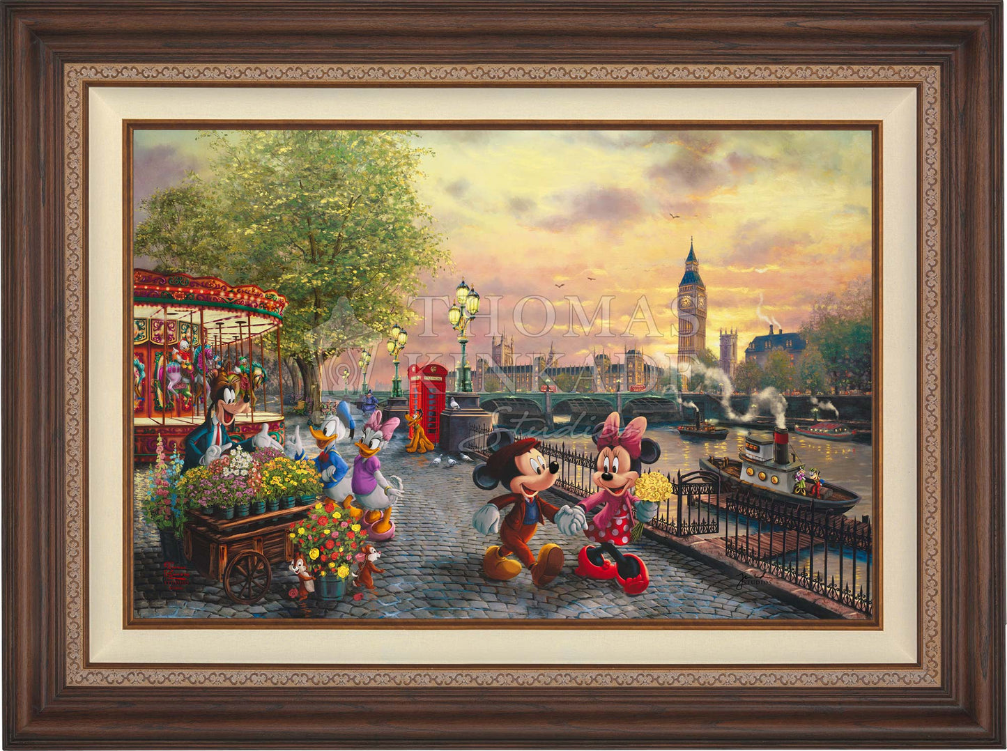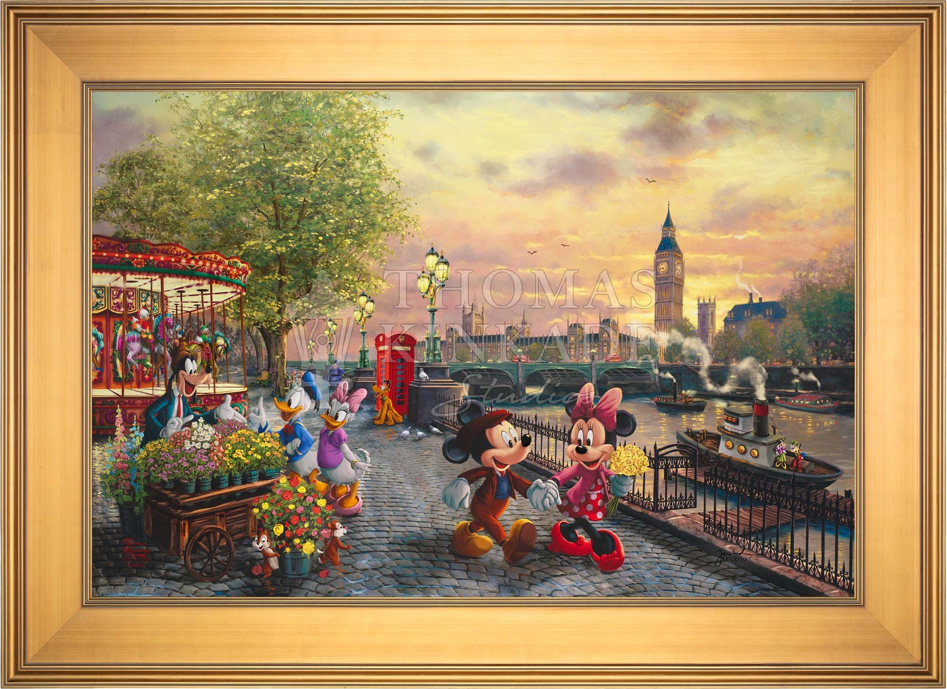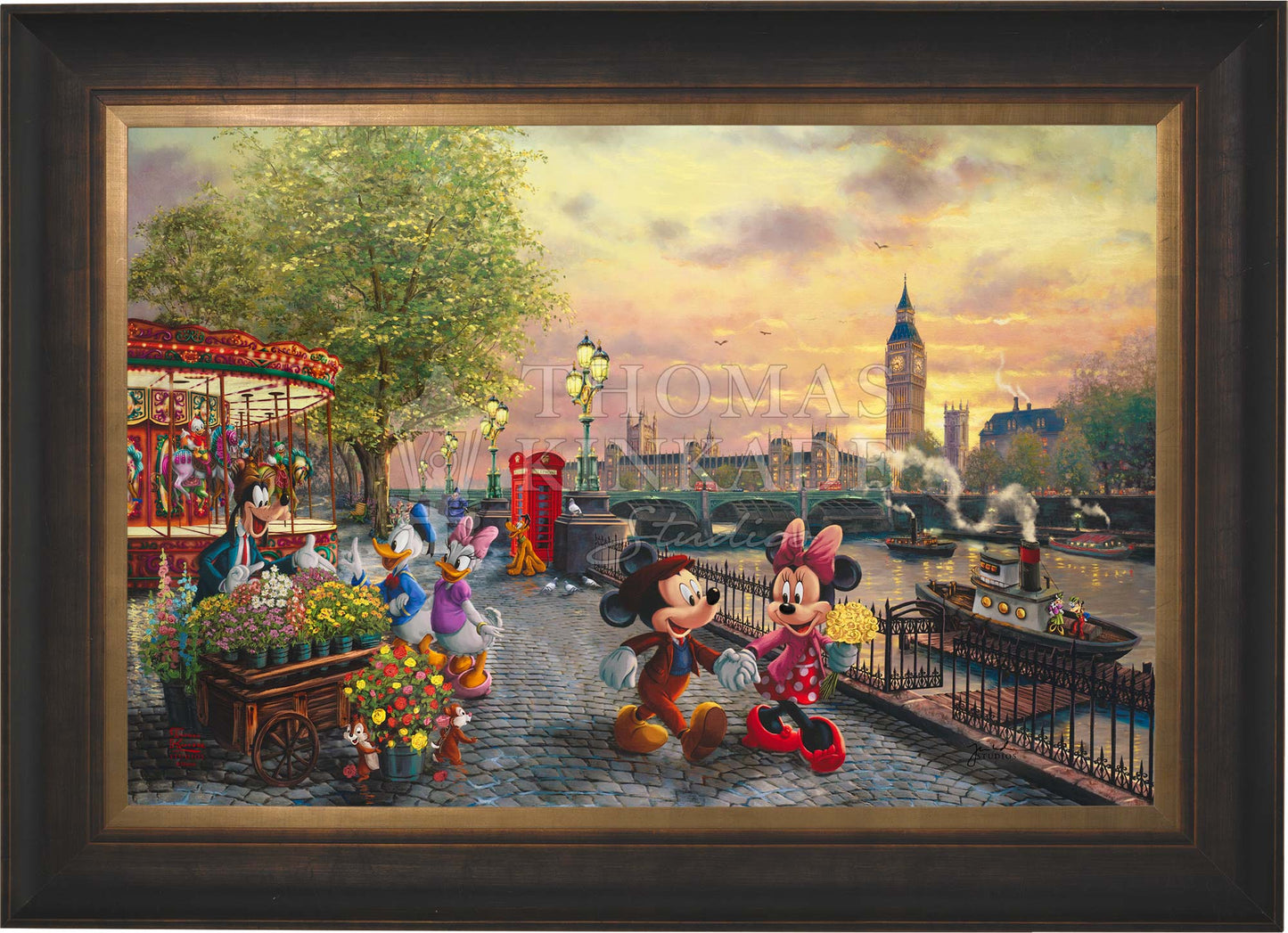 In Disney Mickey and Minnie in London by Thomas Kinkade Studios, Mickey Mouse and Minnie Mouse enjoy a beautiful crisp day walking along the Thames River. The chimes of Big Ben tolling the hour float on the air and blend with the music coming from the brightly lit carousel. Pluto waits for Huey, Dewey, and Louie to ride the carousel. Goofy’s Flower Cart has caught the attention of Donald Duck and Daisy Duck, as Chip and Dale playfully pull roses from the metal bucket.© Disney