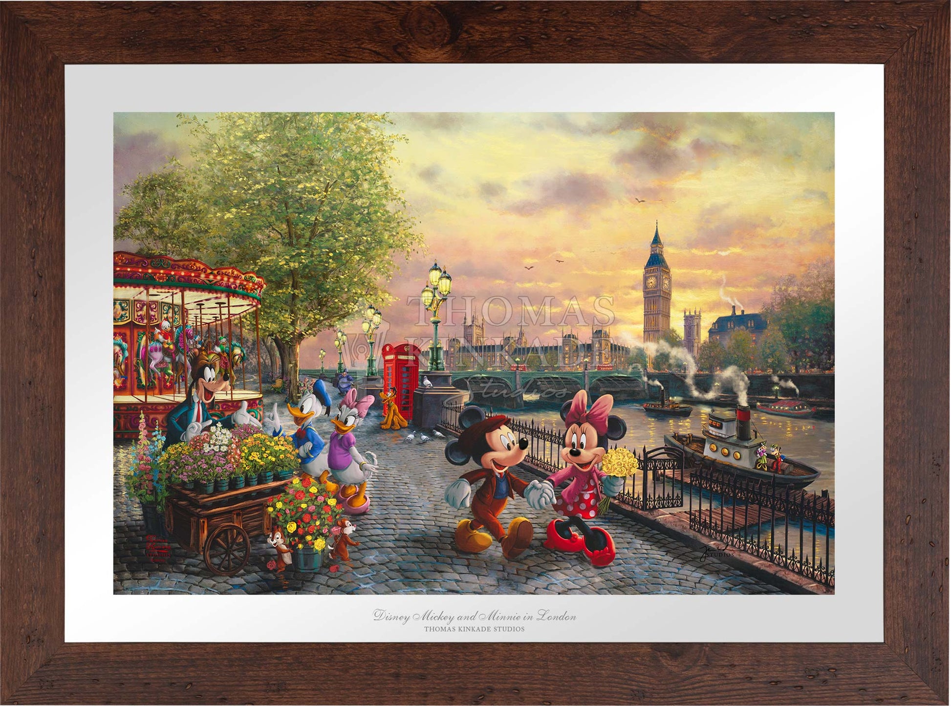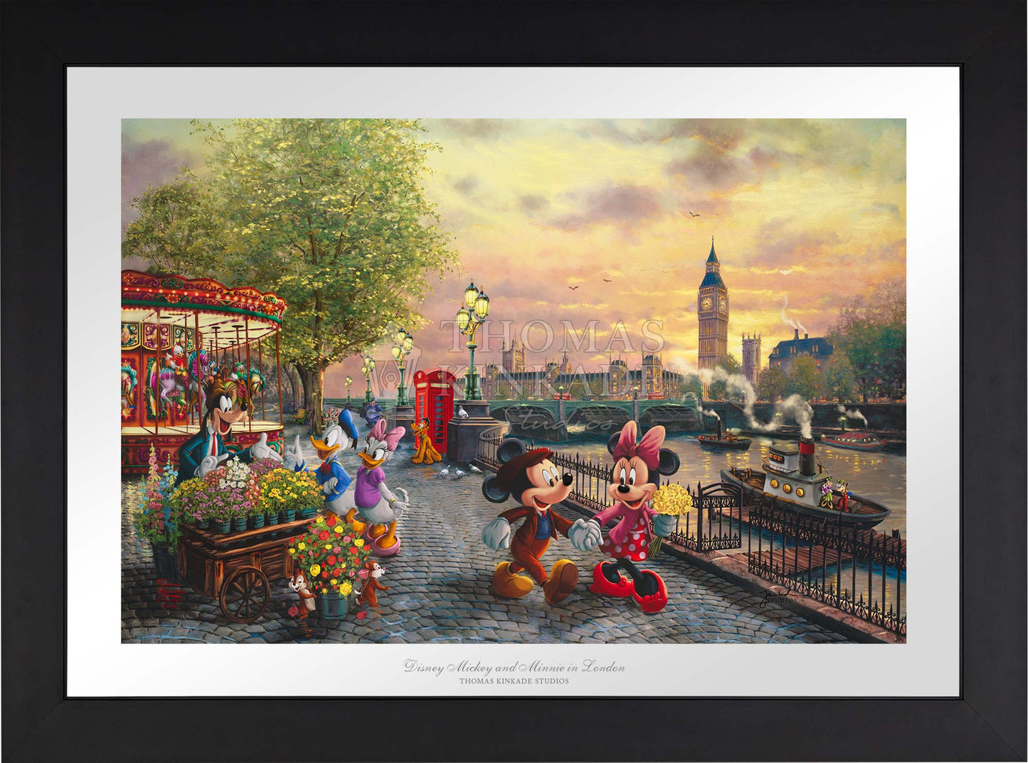 In Disney Mickey and Minnie in London by Thomas Kinkade Studios, Mickey Mouse and Minnie Mouse enjoy a beautiful crisp day walking along the Thames River. The chimes of Big Ben tolling the hour float on the air and blend with the music coming from the brightly lit carousel. Pluto waits for Huey, Dewey, and Louie to ride the carousel. Goofy’s Flower Cart has caught the attention of Donald Duck and Daisy Duck, as Chip and Dale playfully pull roses from the metal bucket.